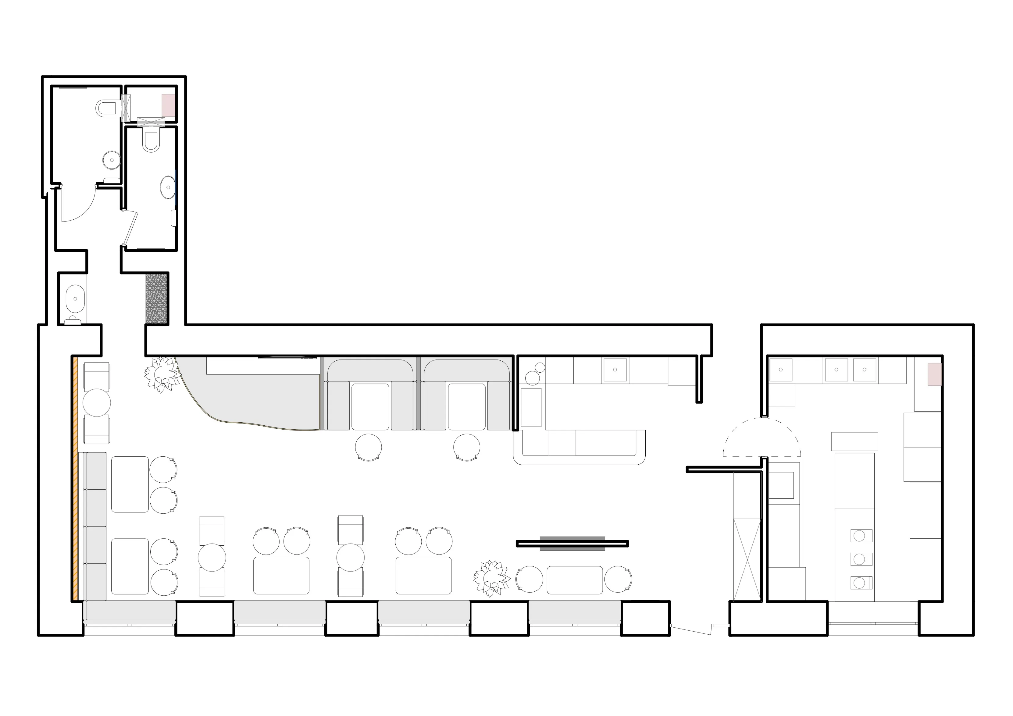 Ще до того, як звернутися до нас із ідеєю майбутнього закладу, власники Bonsai вже вели власну справу у сфері харчування - це була невеличка однойменна локація з азійськими стравами. Втім, замовники мріяли розширити цей проєкт до масштабів повноцінного закладу - в певному сенсі, це був їхній дебют в цьому сегменті. Назва Bonsai лишилася, проте меню розширили, об’єднавши в ньому страви азійської кухні з українською. Це вплинуло і на візуальну концепцію проєкту - ми відмовилися від надто буквального й однорідного оформлення простору в азійському стилі, натомість віддавши перевагу більш сучасному й персоналізованому рішенню інтер’єрів.