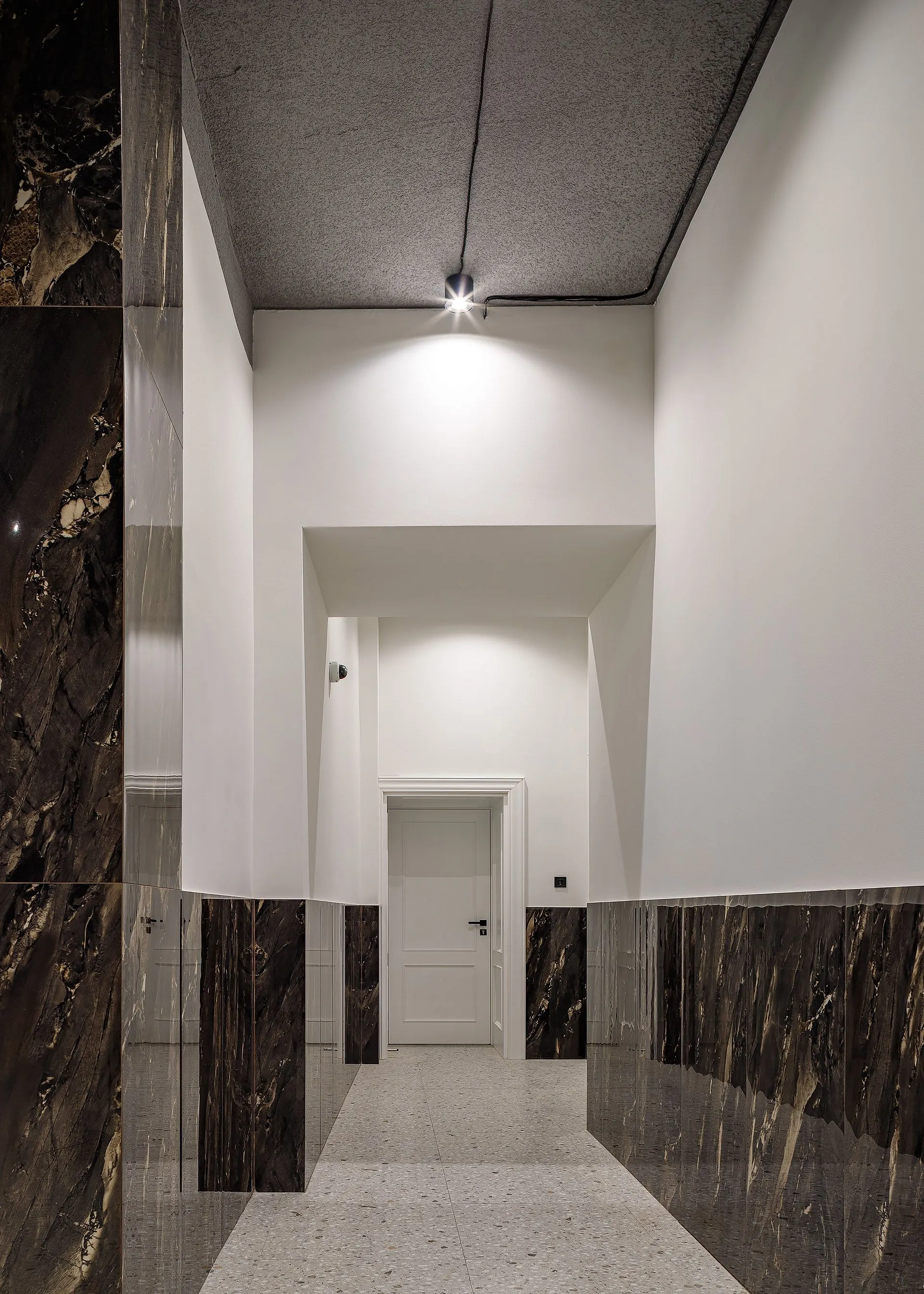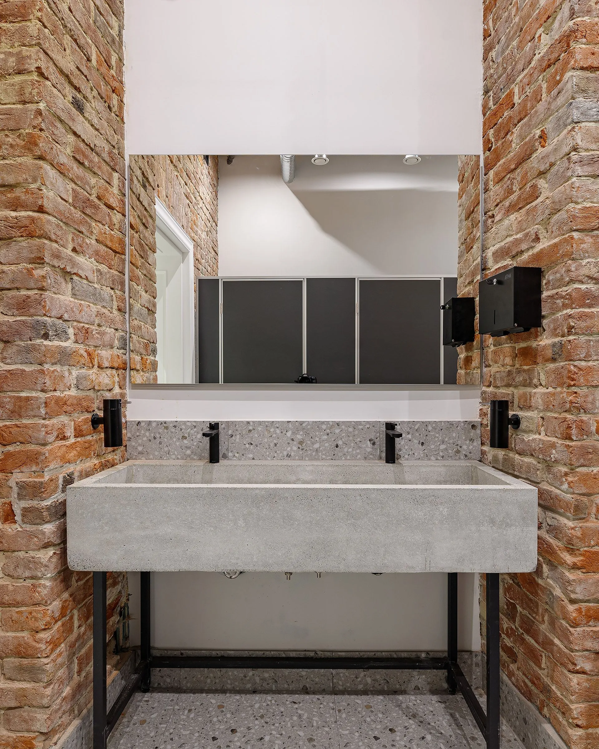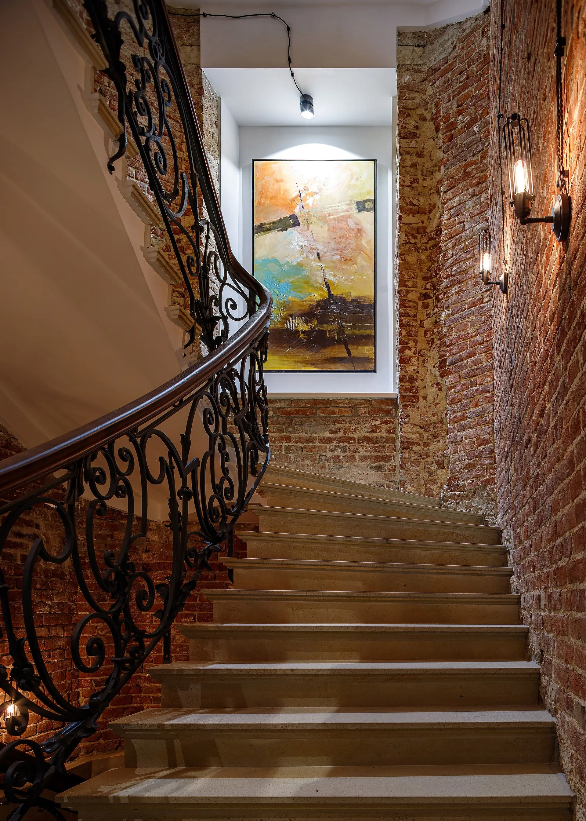 Усередині збережено й відновлено оригінальну цегляну кладку стін, що стала основним стилістичним акцентом. Просторове вирішення коридорів із серією аркових прорізів створює враження глибини й симетрії, водночас зберігаючи відчуття історичної автентики.