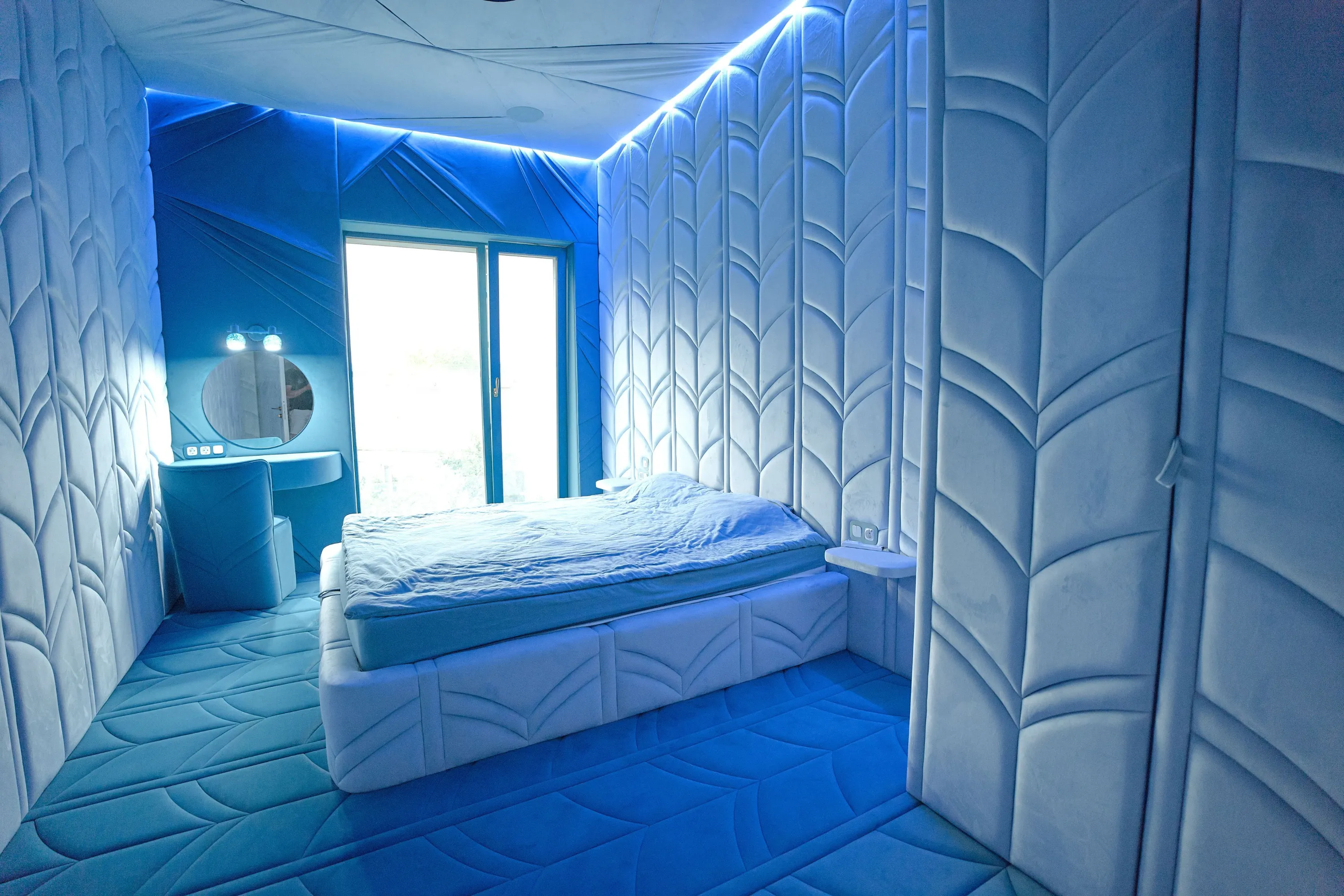 * Спальня «Космос» — футуристичний простір зі світловим декором: сяючий Сатурн, падаюча комета й флуоресцентні фарби перетворюють кімнату на арт-інсталяцію.