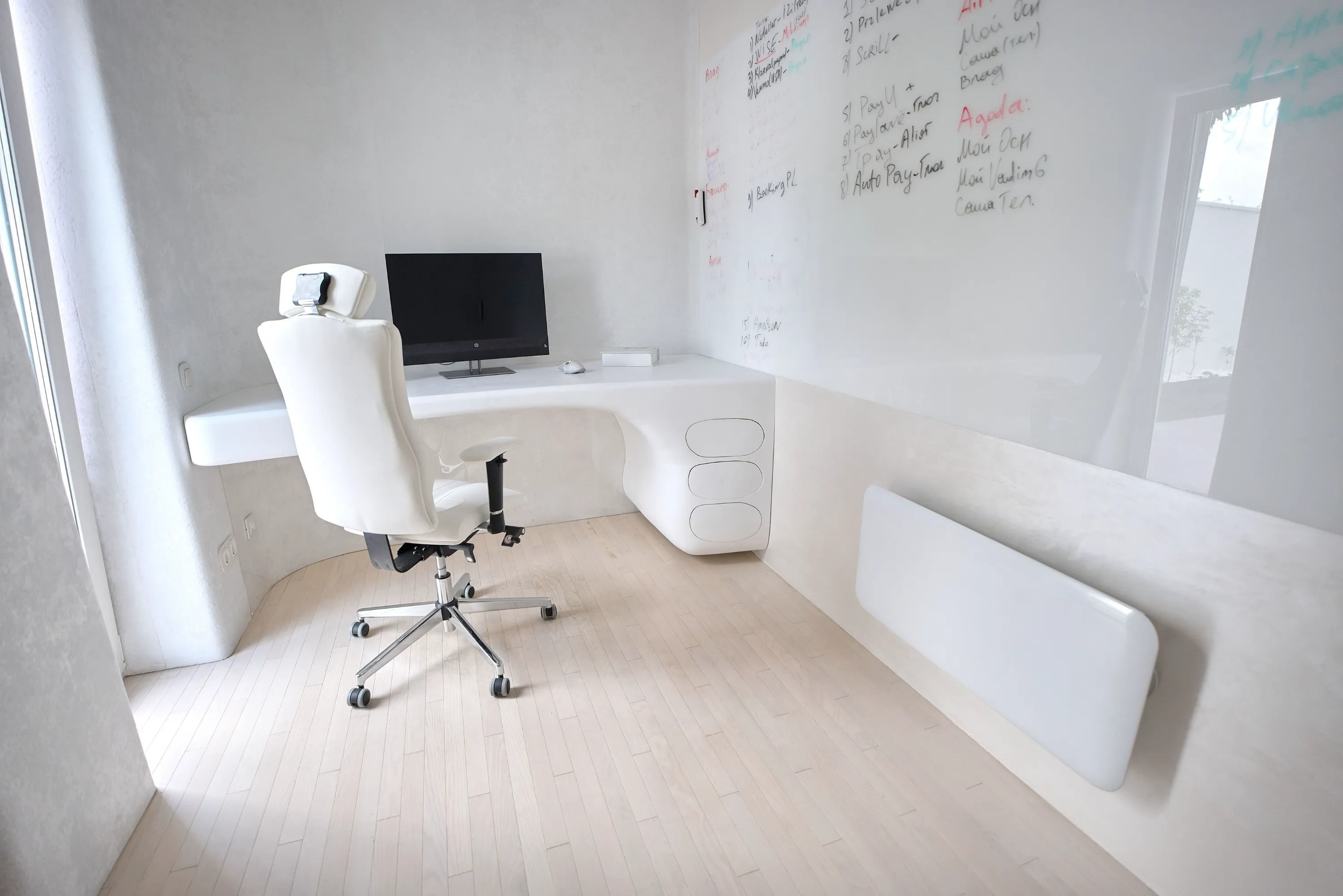 * Кабінет — мінімалістичний простір у білому стилі, що підкреслює концентрацію та строгість.