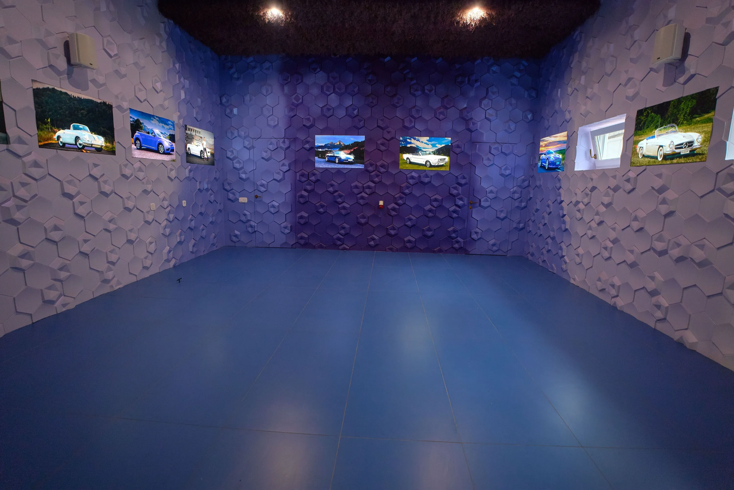 * Гараж — сучасна арт-зона: при відкритті воріт з дверей складається колаж фотографій кабріолетів, а стеля виконана з живих рослин.