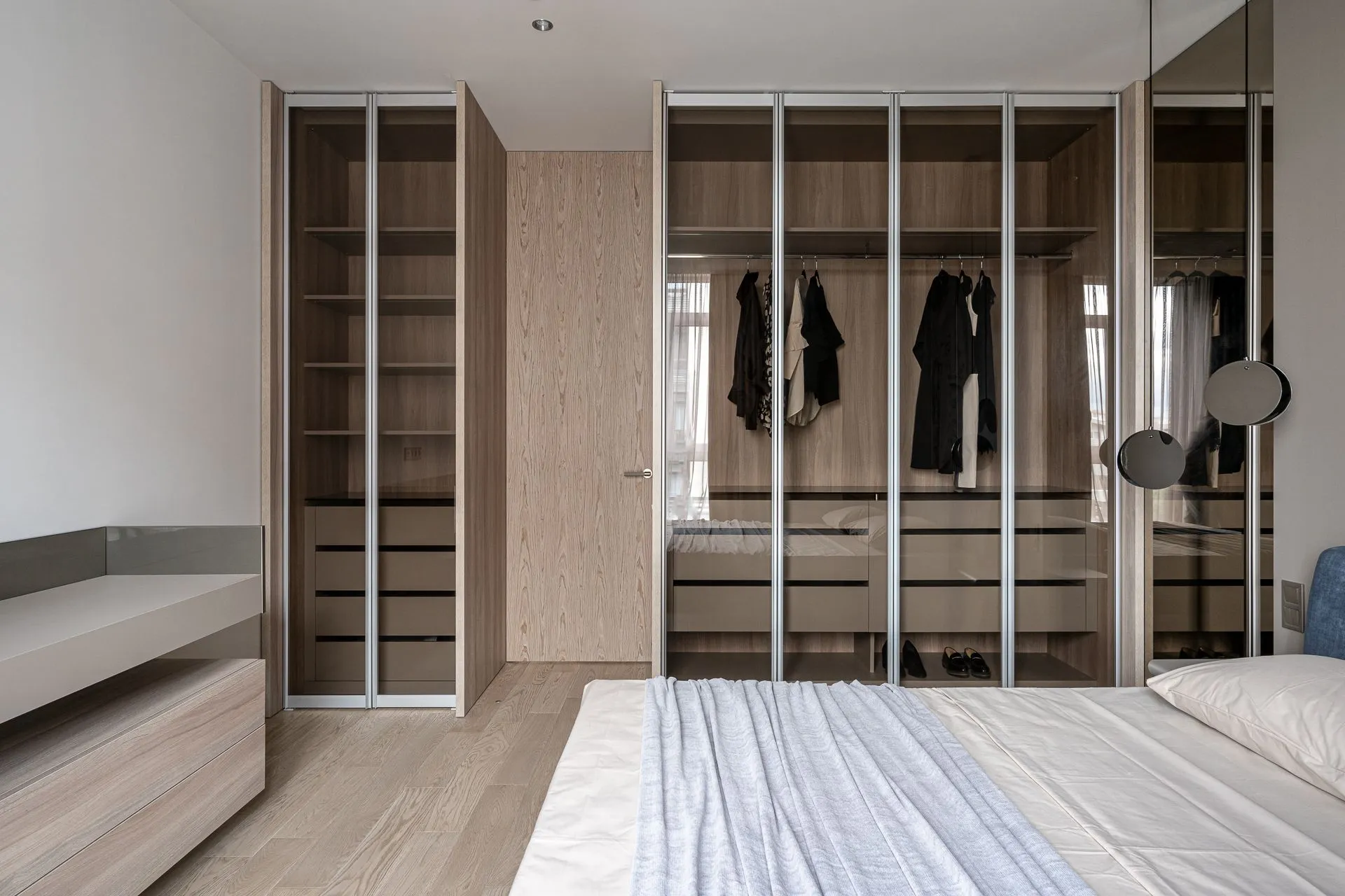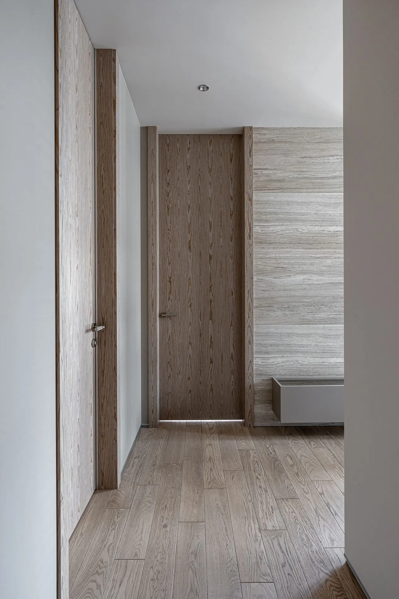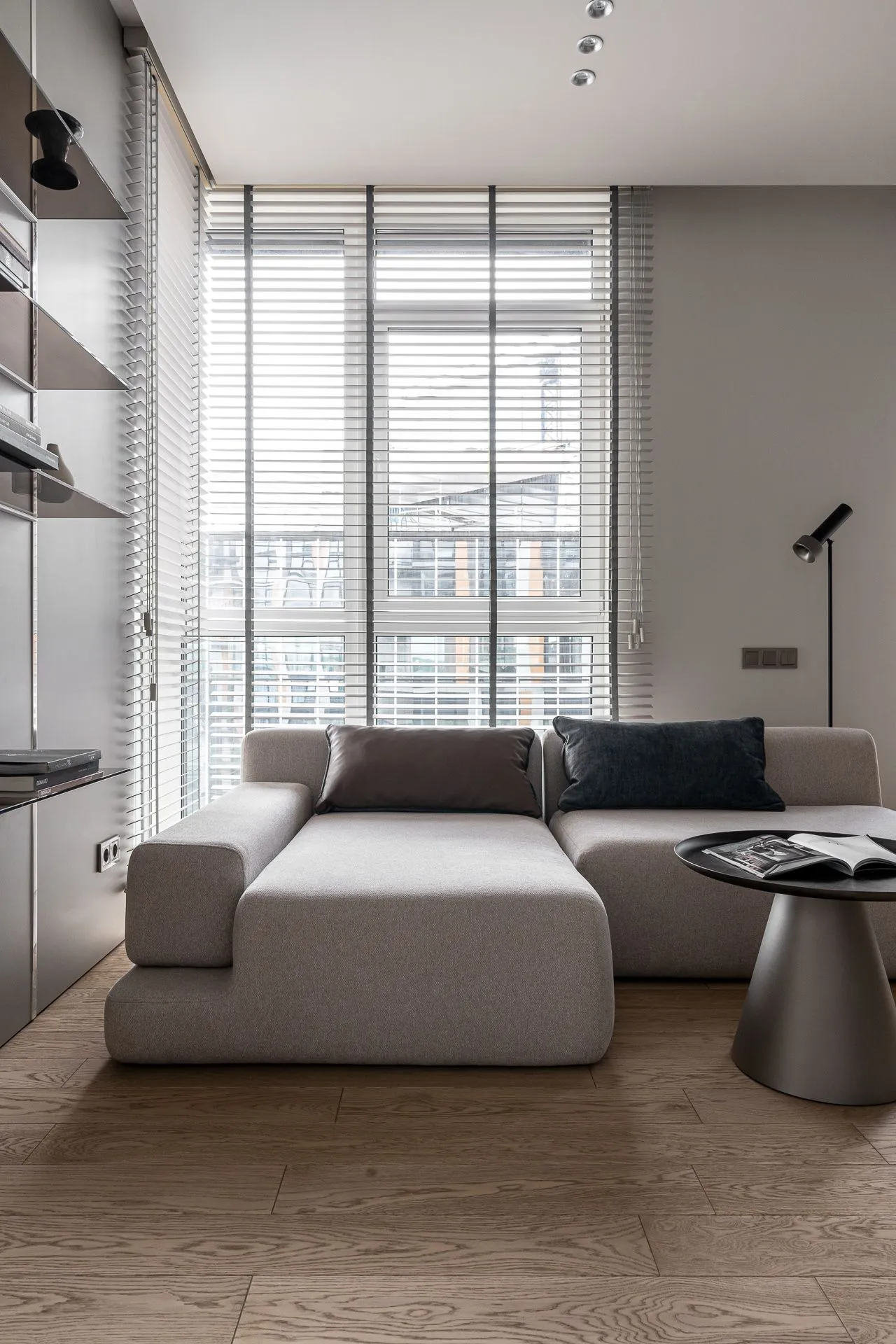 Великі вікна та горизонтальні жалюзі працюють зі світлом, створюючи змінну атмосферу протягом дня та підкреслюючи фактурність поверхонь. Усі деталі інтер’єру — від меблів до систем зберігання — інтегровані так, щоб підкреслити цілісність і мінімалізм рішення.