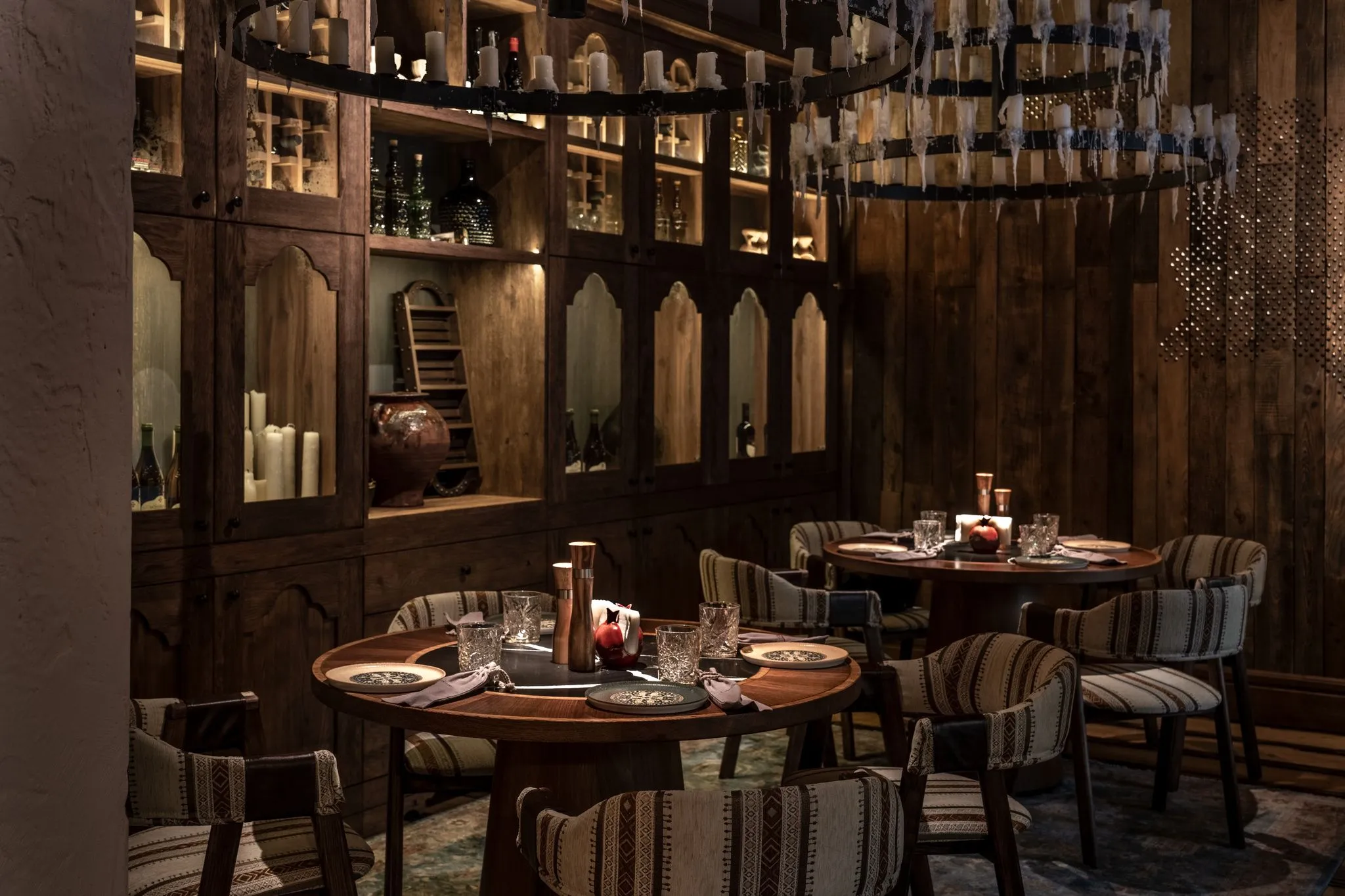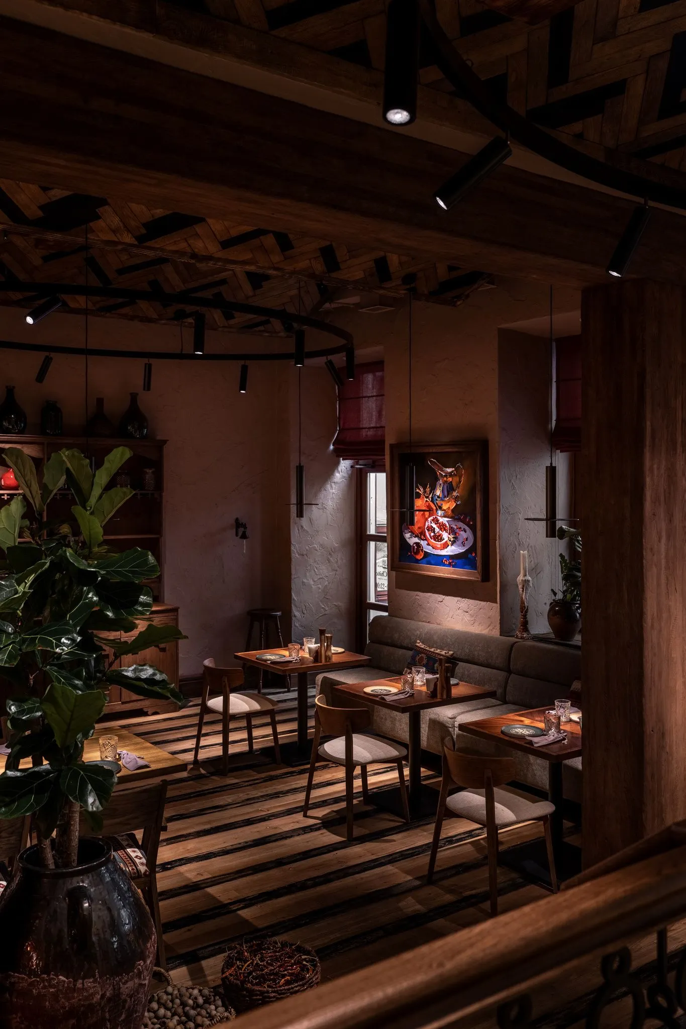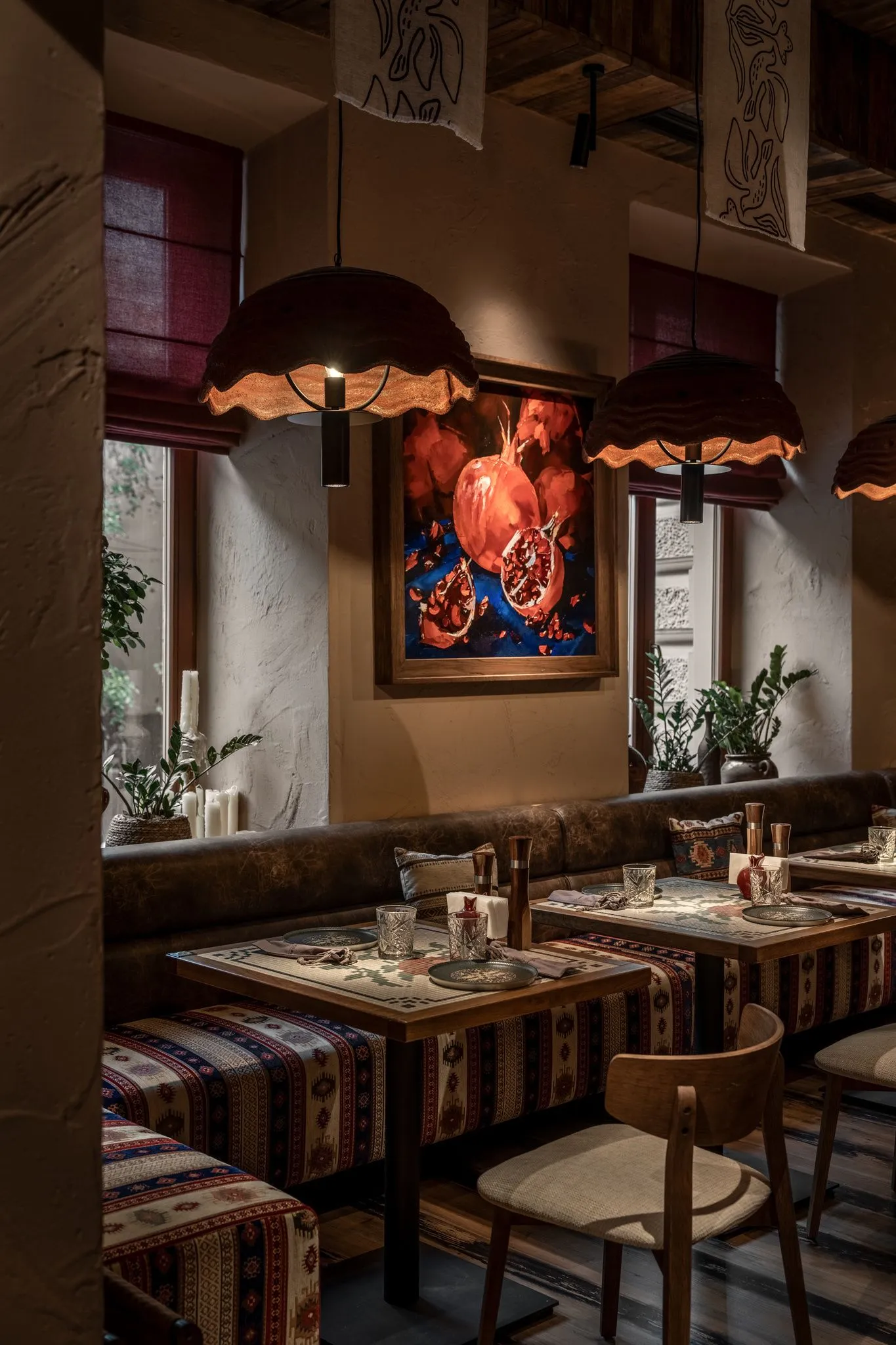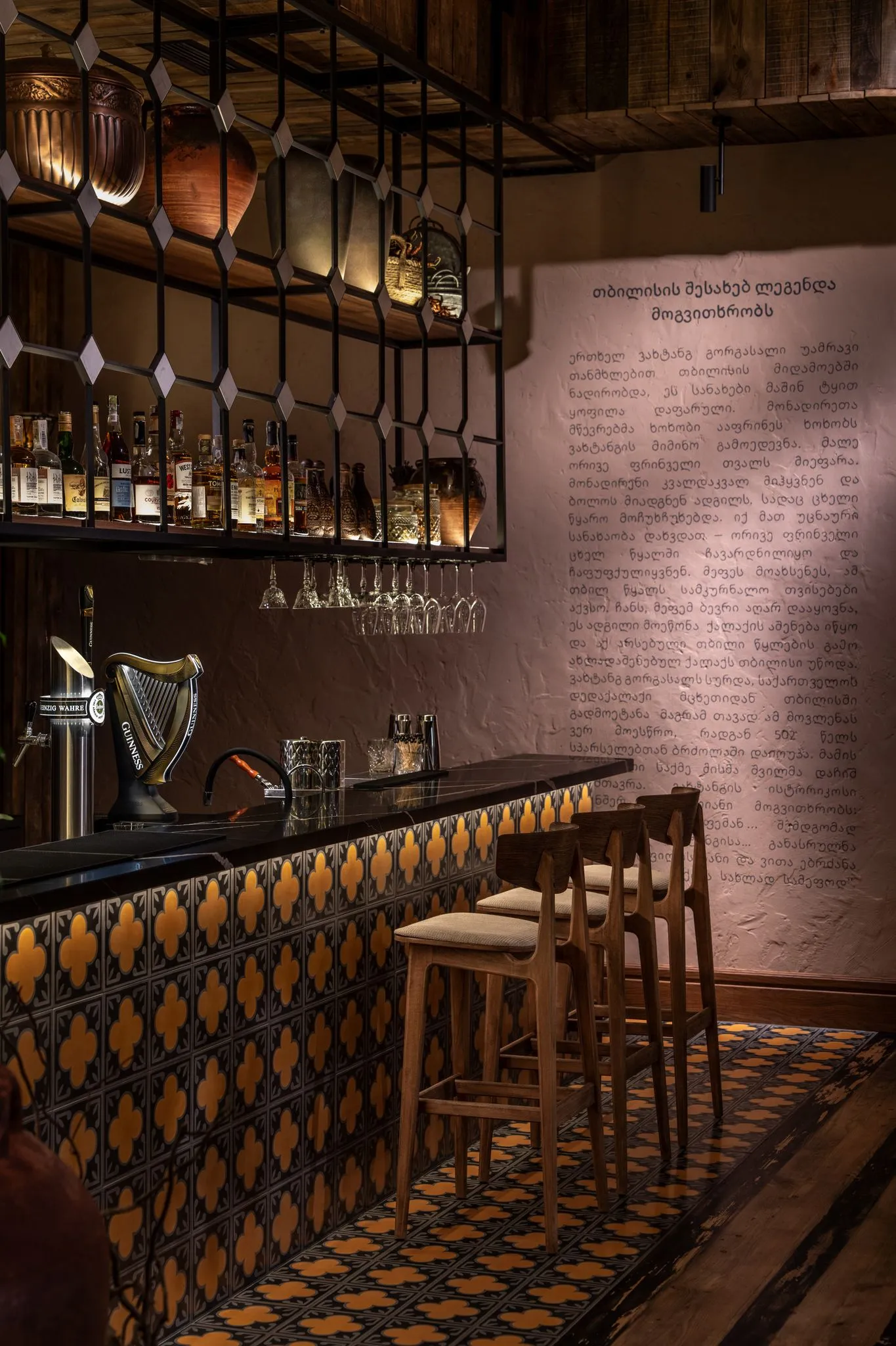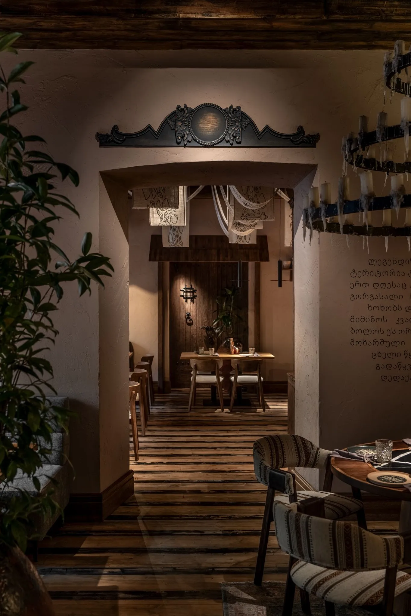 Барна стійка та підлога оздоблені яскравою, унікальною плиткою ручноїроботи, виготовленою на замовлення. Її візерунки створюють автентичнуатмосферу та підкреслюють унікальний стиль ресторану.Стіни та підлогове покриття були створені художником спеціально для цьогопростору, що додає інтер’єру особливої цінності. Текстуровані елементи настінах викликають відчуття тепла та затишку. В інтер’єрі використані грузинські написи з історіями та легендами, якіприкрашають стіни та додають простору історичної глибини. Картини стаютьсвоєрідною екскурсією у світ грузинської культури.В одній із зал стеля прикрашена розписаними вручну лляними полотнами. Вонистворюють атмосферу справжнього грузинського дому, де кожен елементрозповідає власну історію.У ресторані також є окрема VIP-зала для гостей, які бажають насолодитисятрапезою в більш приватній обстановці. Інтер’єр цієї зони виконаний зособливою увагою до деталей, поєднуючи затишок та елегантність. Надстолами розміщені глиняні світильники, які слугують виразним акцентом.Особливу увагу приділено унікальним світильникам у формі гнізд, якістворюють цікаву гру світла та тіней (каустики) на стінах, додаючи ресторанузагадковості та чарівності.
