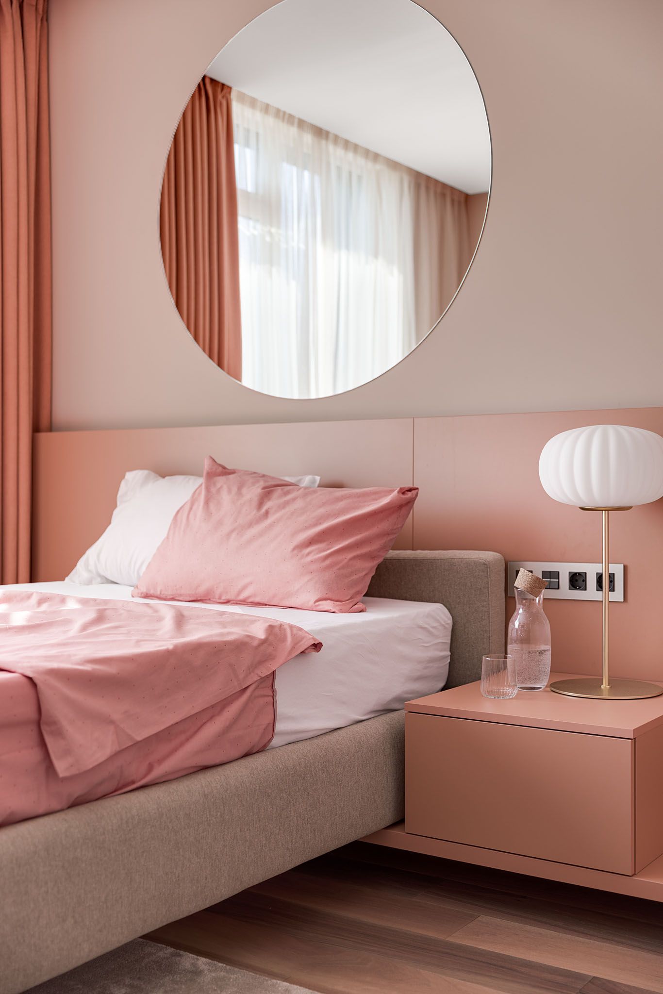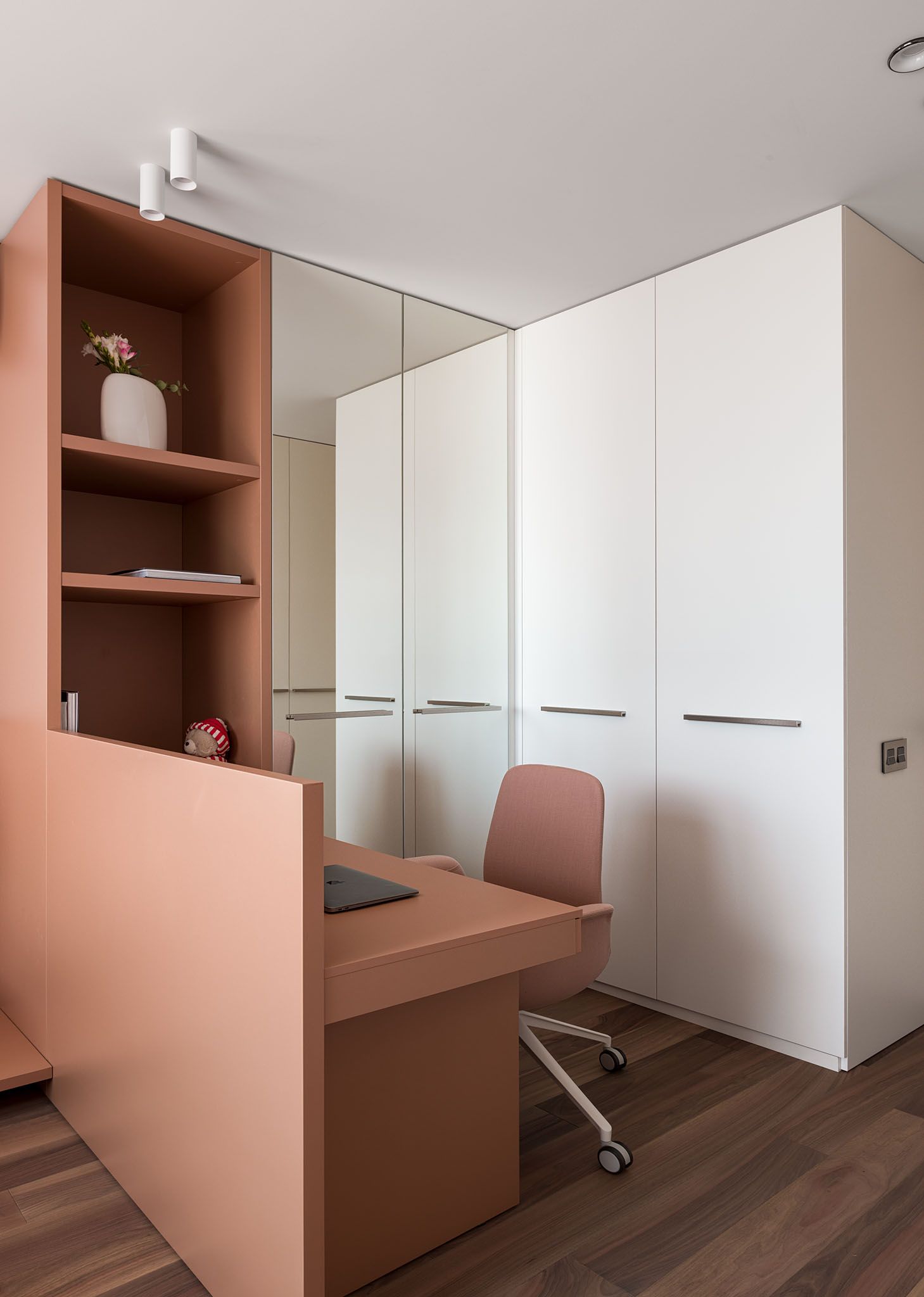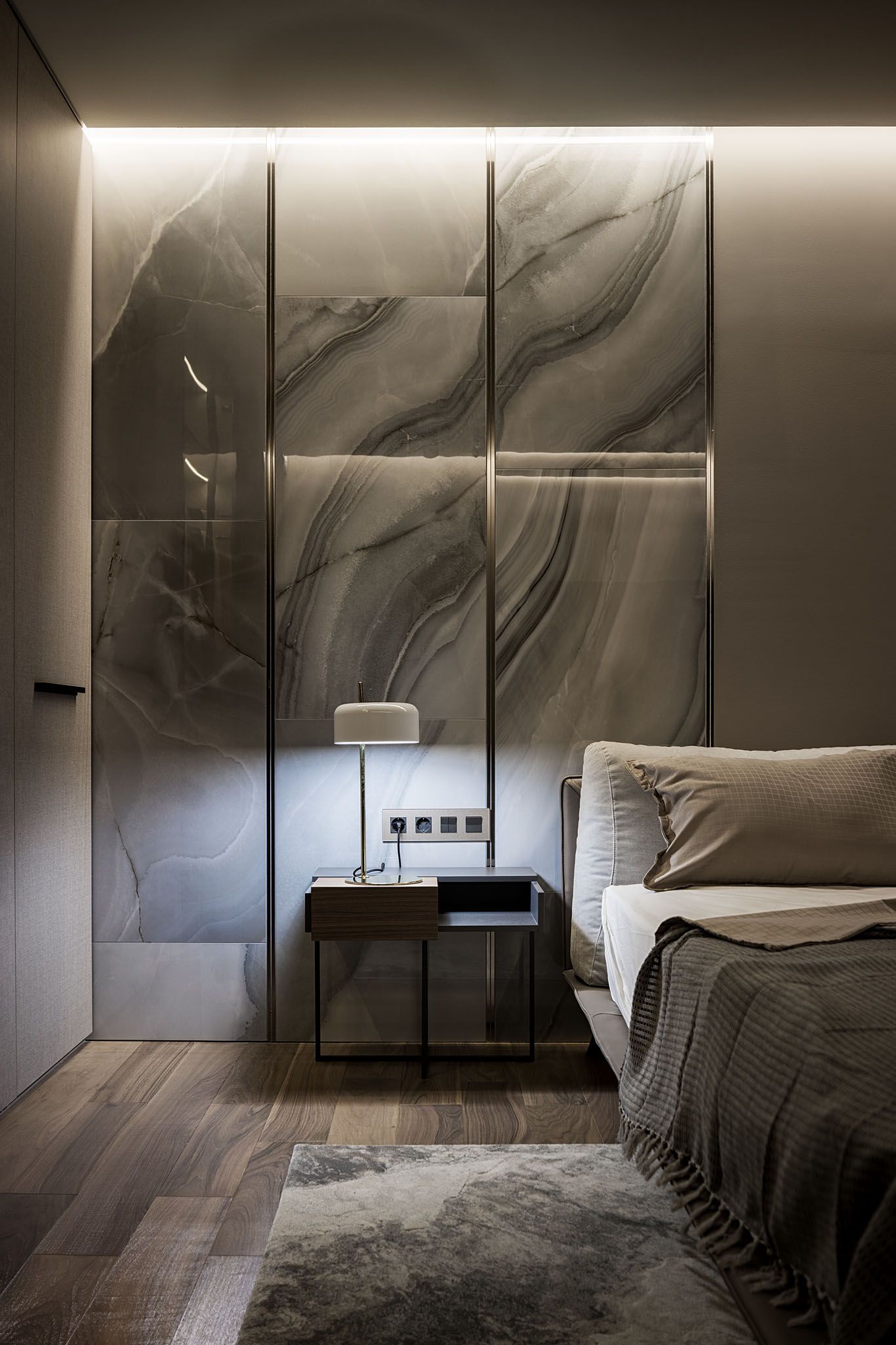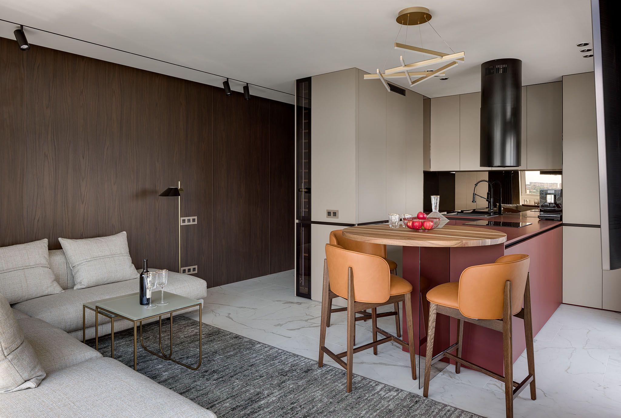 Квартира для родини де цінують затишок та комфорт. Композиційно інтер’єр формують декоративні панелі з горіху та патерни блакитного оніксу з додаванням акцентів зі скла та вишневого кольору.