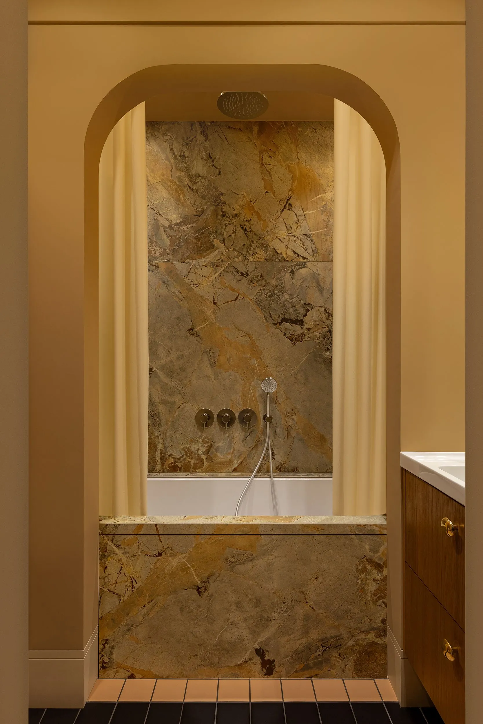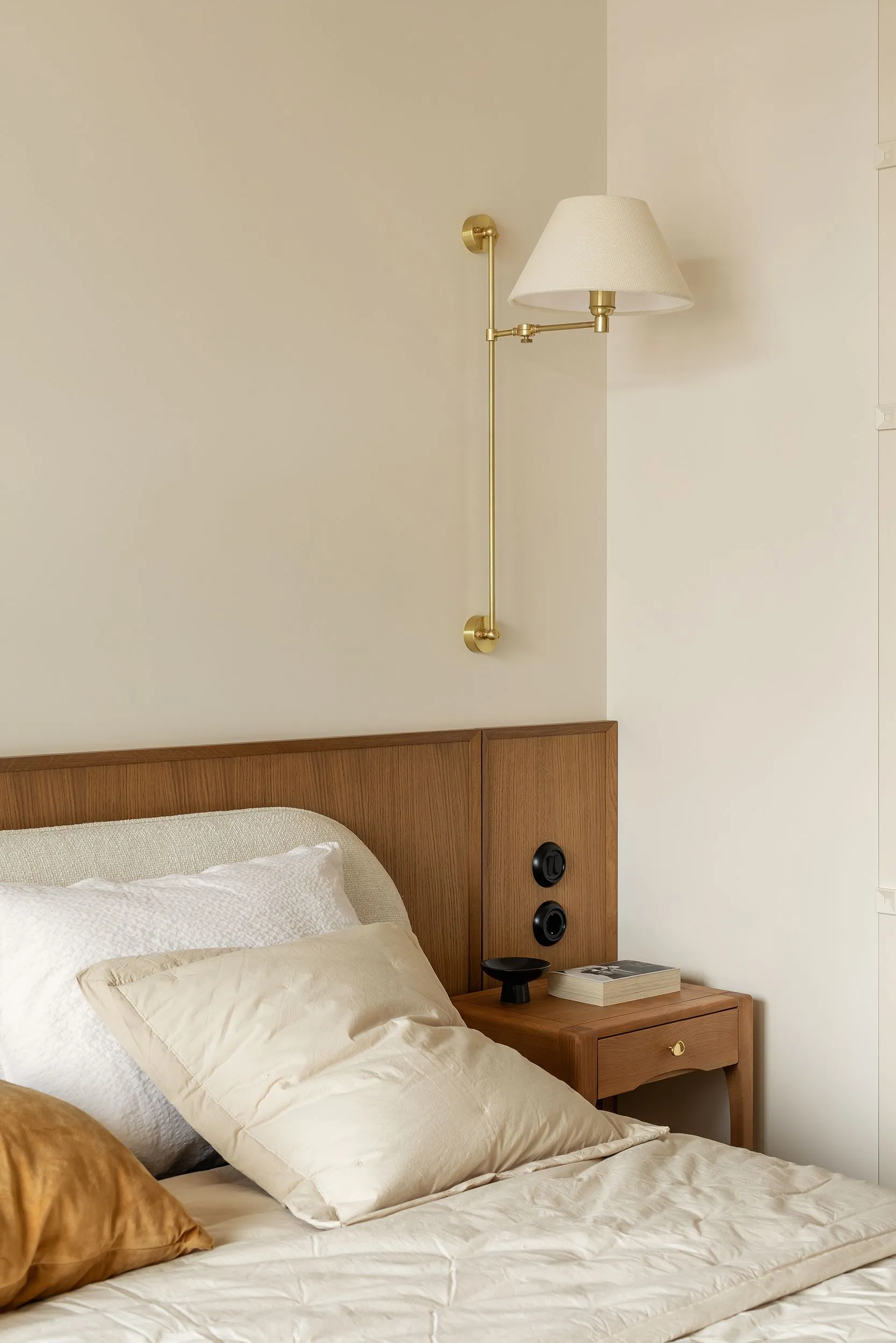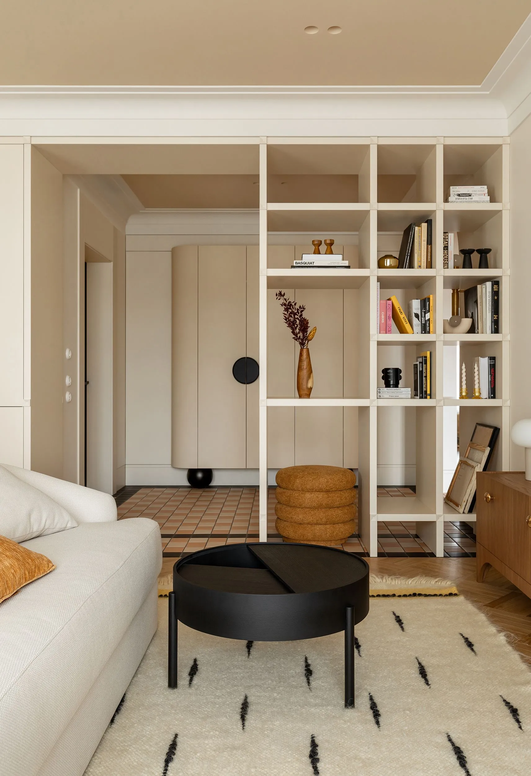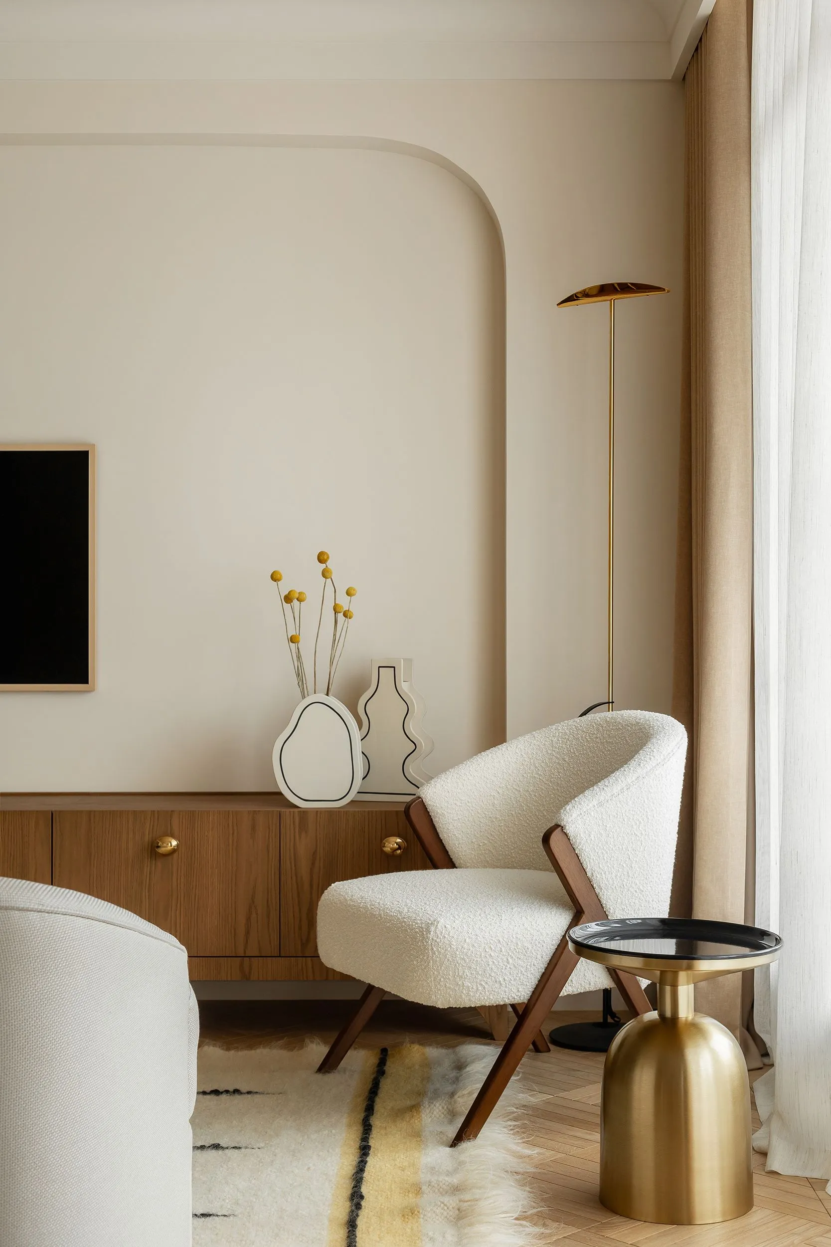 Планування квартири вибудуване навколо світлого спільного простору, де кухня переходить у вітальню. Вхідна зона м’яко відділена від загальної частини невеликим стелажем та оформлена як затишний хол із дрібною плиткою у шаховому ритмі. Спальня, кабінет і санвузол винесені у віддалений бік квартири, що забезпечує приватність і комфорт. В інтер’єрі переважають теплі натуральні матеріали, акценти з латуні додають стриманої розкоші, а мотив арок, повторений у меблевих елементах і прорізах, формує м’яку пластику та підкреслює архітектурну цілісність простору.