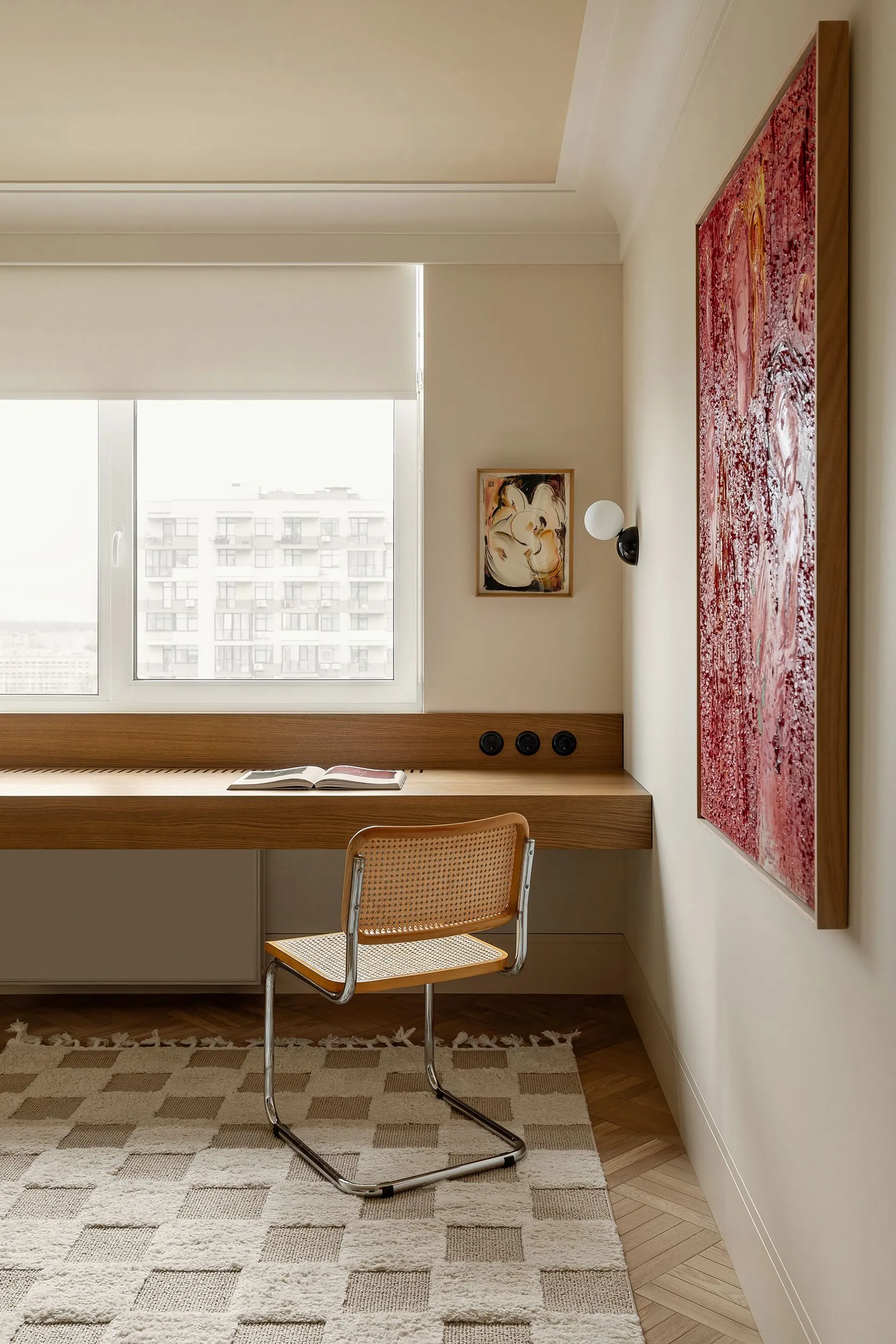 Важливою частиною концепції стало звернення до української традиції: спеціально для цього проєкту були розроблені карпатські килими-ліжники, які додають автентичності та водночас сучасного звучання. Інтер’єр також прикрасили роботи українських митців: живопис Альони Андрєєвой, Вови Кено та кераміка Зореслави Пенделюк, що органічно доповнили особисту колекцію клієнтки.
