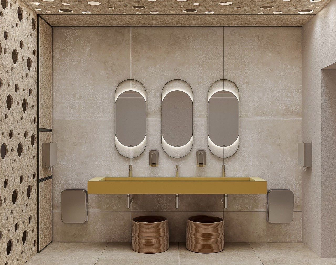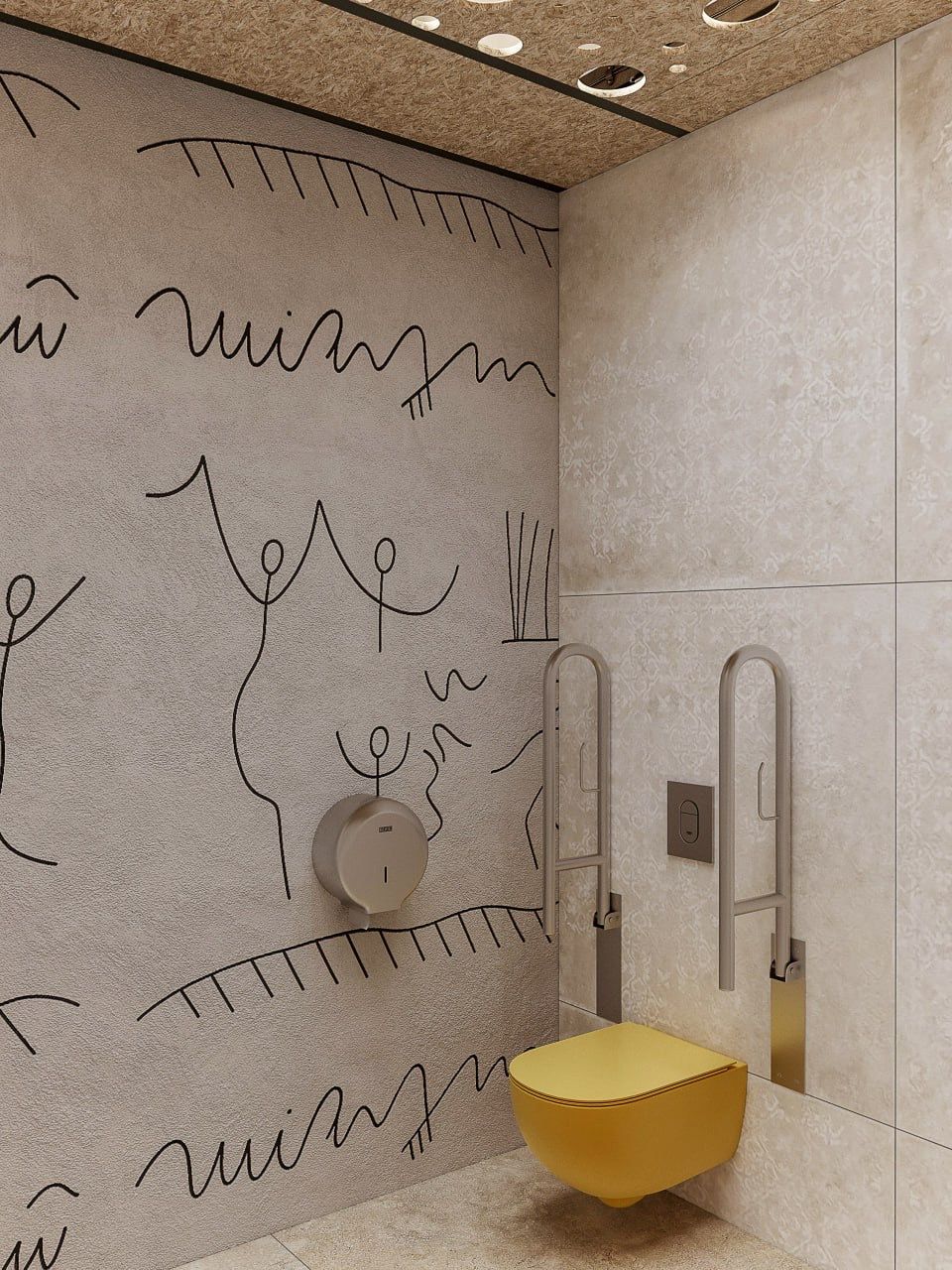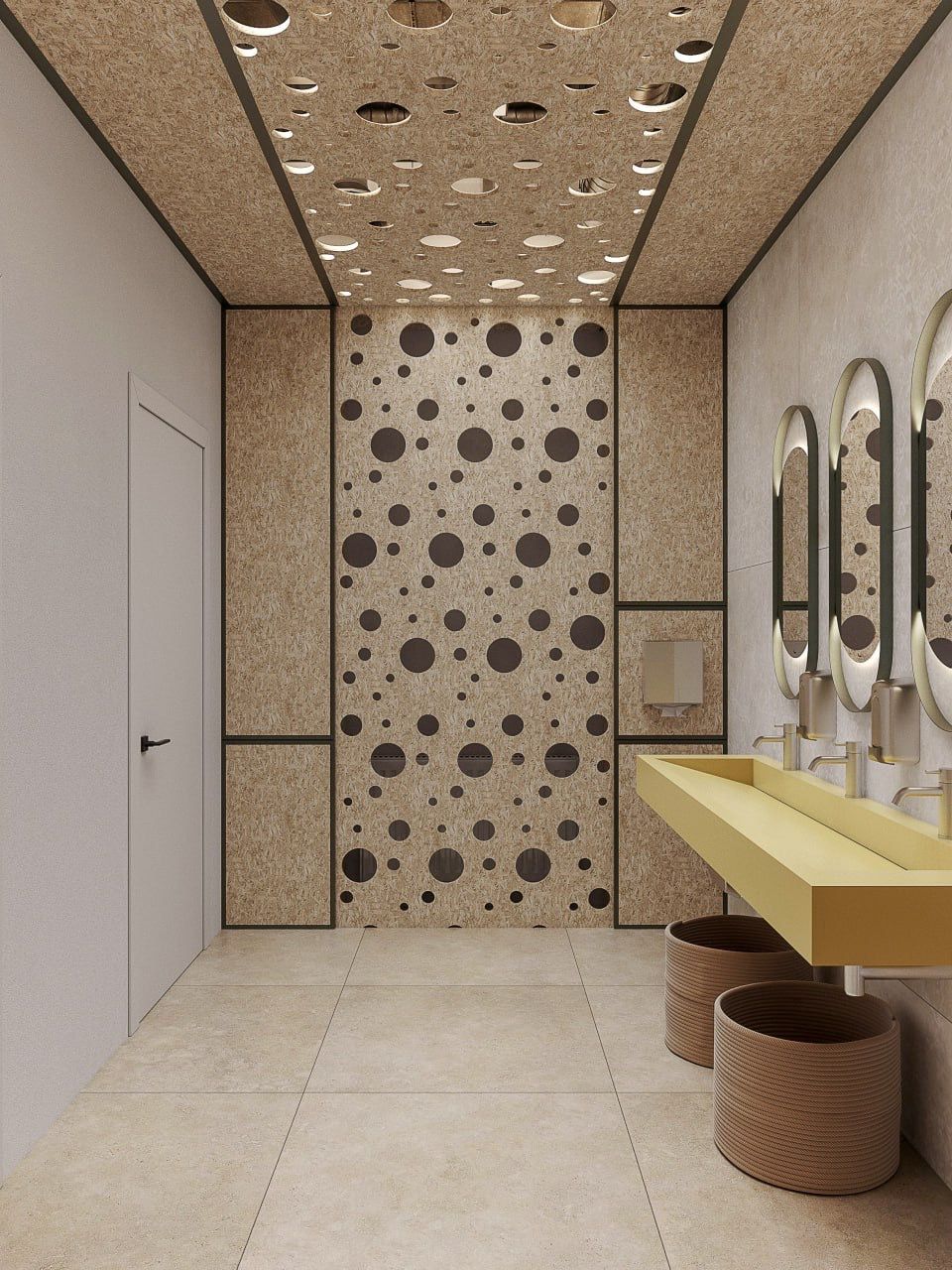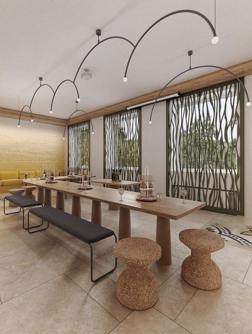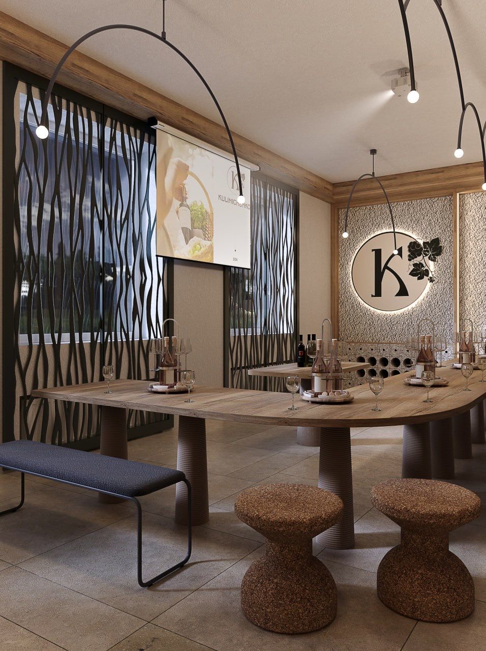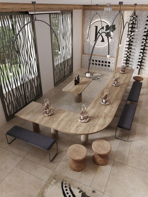 Основною ексклюзивною ідеєю стало створення різноманітних зон, де можна водночас і дегустувати вино, і добре бачити спікера: це й невеличкі круглі столики, розташовані вздовж сучасної диванної композиції, це також і більш традиційні прямокутні столи на чотири особи. Але родзинкою, навколо котрої й був створений весь інтер’єр став центральний стіл незвичайної форми, який при необхідності легко трансформується в окремі столи. Слід зазначити, що розташування меблів та обладнання всього простору створено згідно з усіма нормами та правилами інклюзивності та безбар’єрності.
