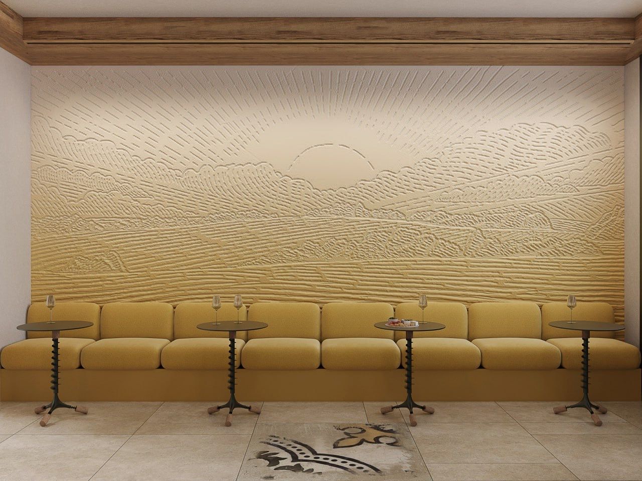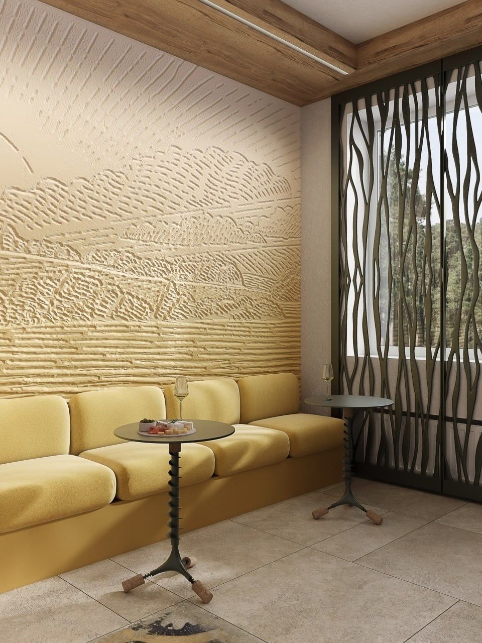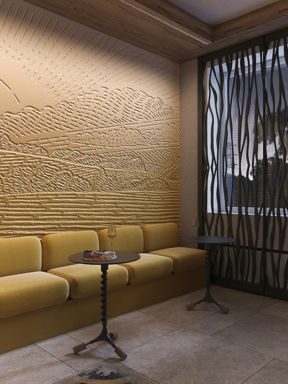 Ідеї декорування зали – це відображення функцій використання продуктів та матеріалів для виготовлення вина. Жоден елемент інтер'єру не є випадковим та підкреслює приналежність до виноробства. Джут, яким задекоровані опорні конструкції столів використовується для підв'язування лози. Костробетон та цегла з конопель – це в першу чергу екологічний матеріал, а по-друге, коноплі є однією з кращих покривних культур при вирощуванні винограду. Присутність в інтер’єрі великої кількості витончених металевих виробів нагадує нам опори для шпалерної проволоки та інших конструкцій, що підтримують лозу. А опорні ніжки круглих столів – імітація штопора для відкриття пляшки вина. Центральне панно на стіні – це стилізований барельєф із зображення безкрайніх виноградників та сонця – символу врожаю та кращих смакових якостей винограду. Ідея сонця, якнайважливішого природного компонента у виноробні підтримана колористичним рішенням декількох деталей інтер’єру.Декоративні елементи на вікнах, не порушуючи потік природного освітлення приміщення будь-якого часу доби, дали нам повний ефект присутності, підкреслюючи графікою самого дизайну окремі ряди виноградників та підсилюючи цей ефект гармонійною грою світла і тіні.
