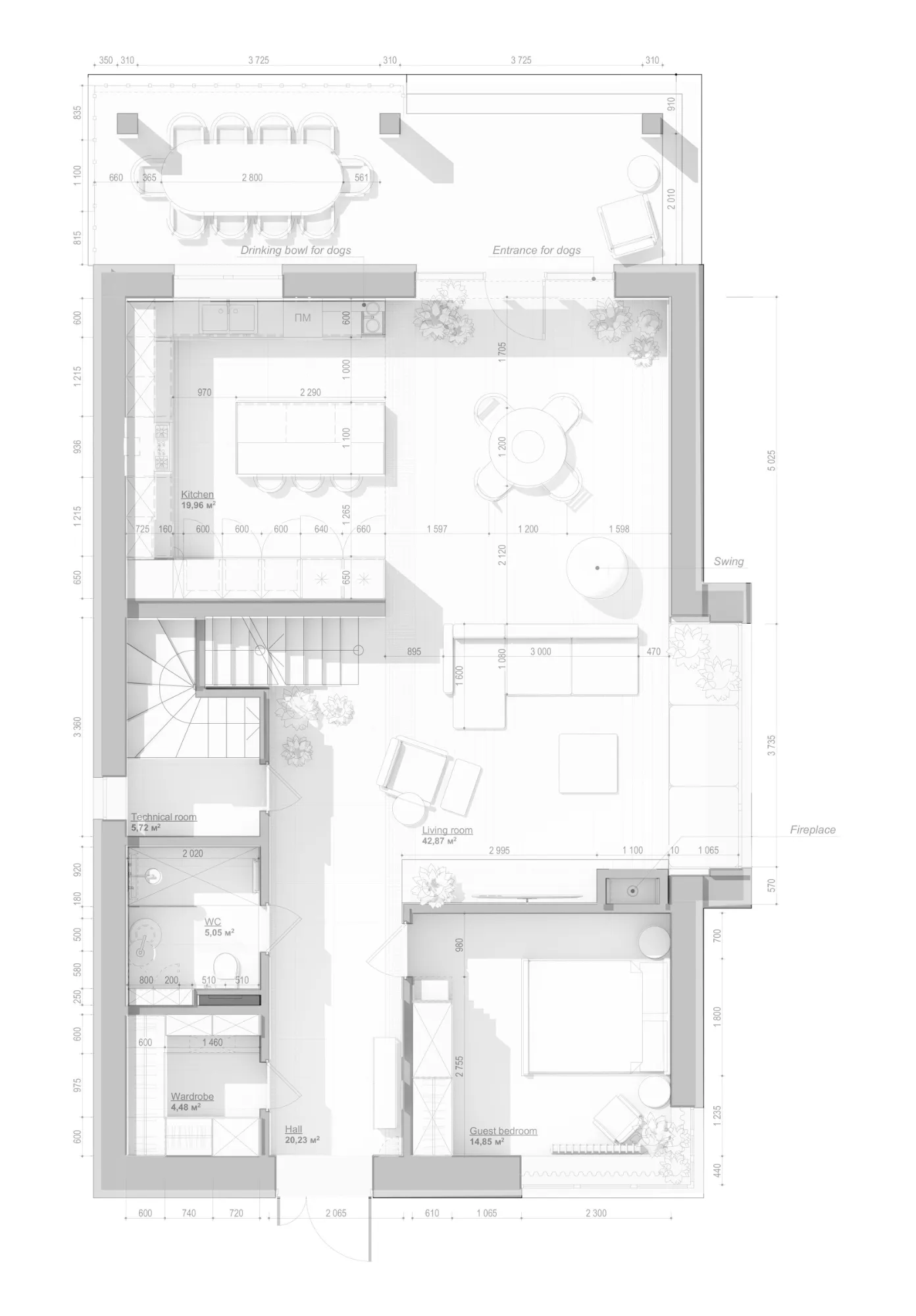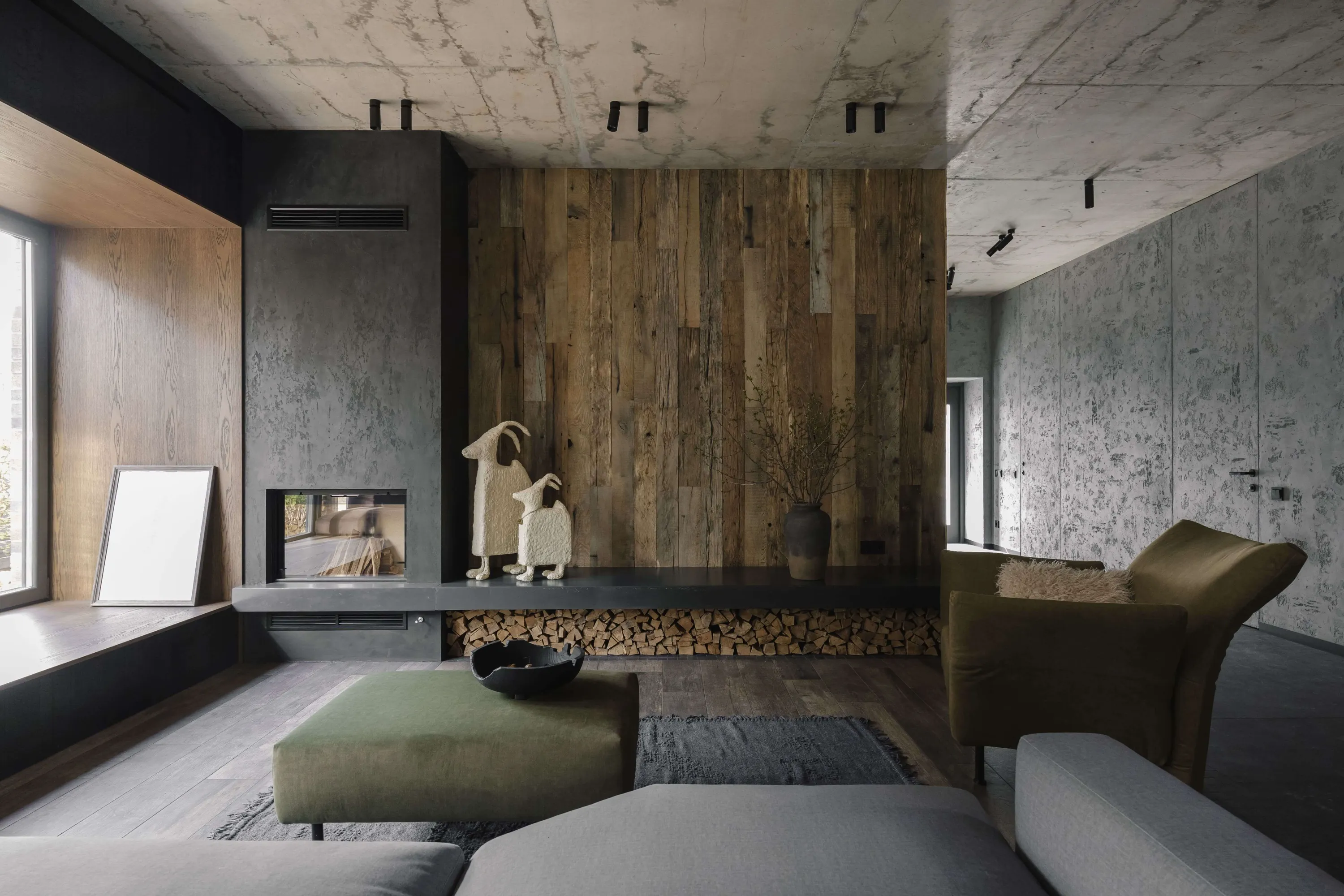 Den House — дім для жінки та її 4 собак. Інтер'єр продовжує атмосферу соснового лісу: дерево, камінь, зелень. Простір створено тактильним, природним, з акцентом на комфорт для собак: великі дивани, лежанки, крісло-гойдалка, окремий вихід у двір. Перевага — текстурам і матеріалам зі «шрамами часу». Це дім-оазис, що поєднує красу неідеального й тепло природи.
