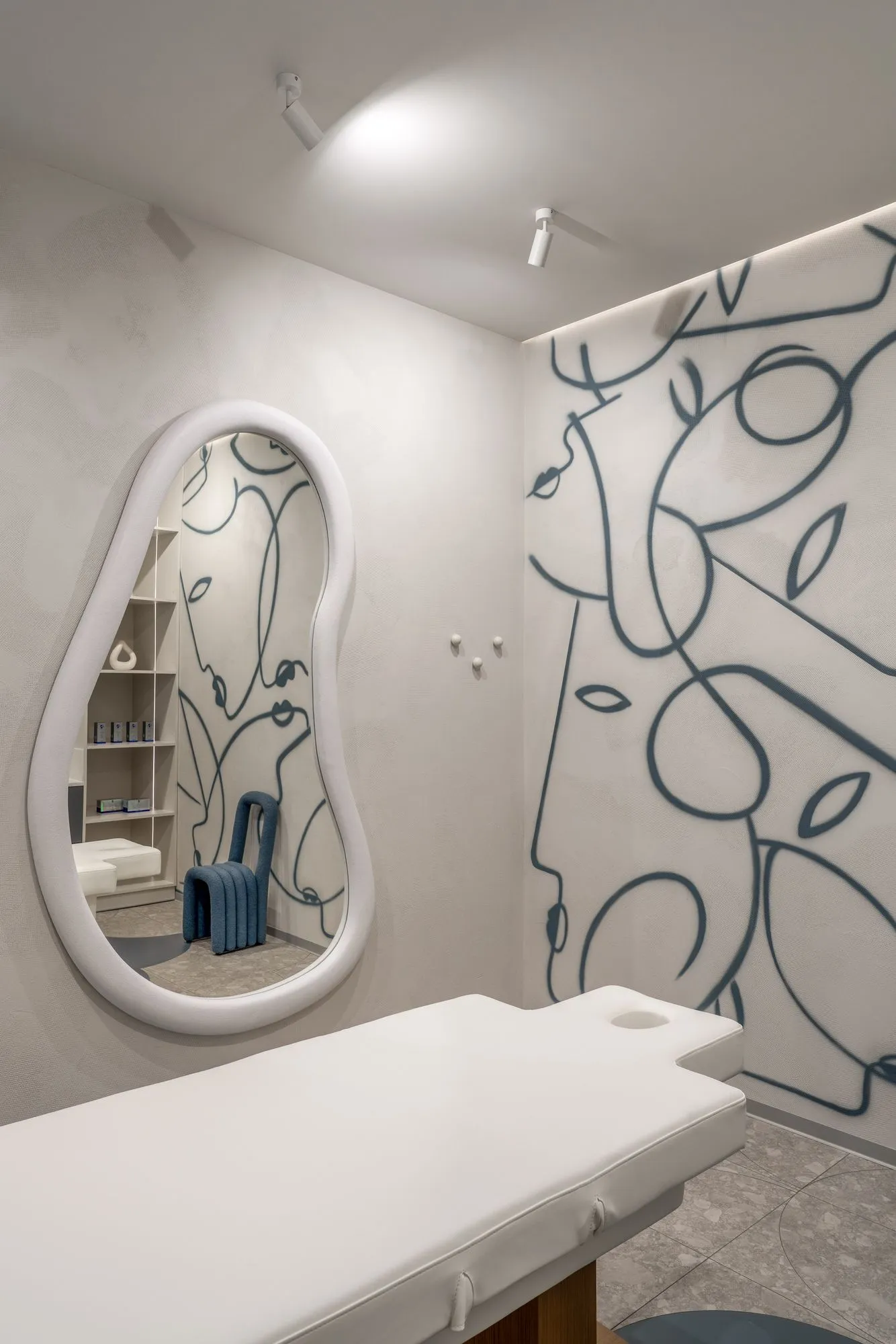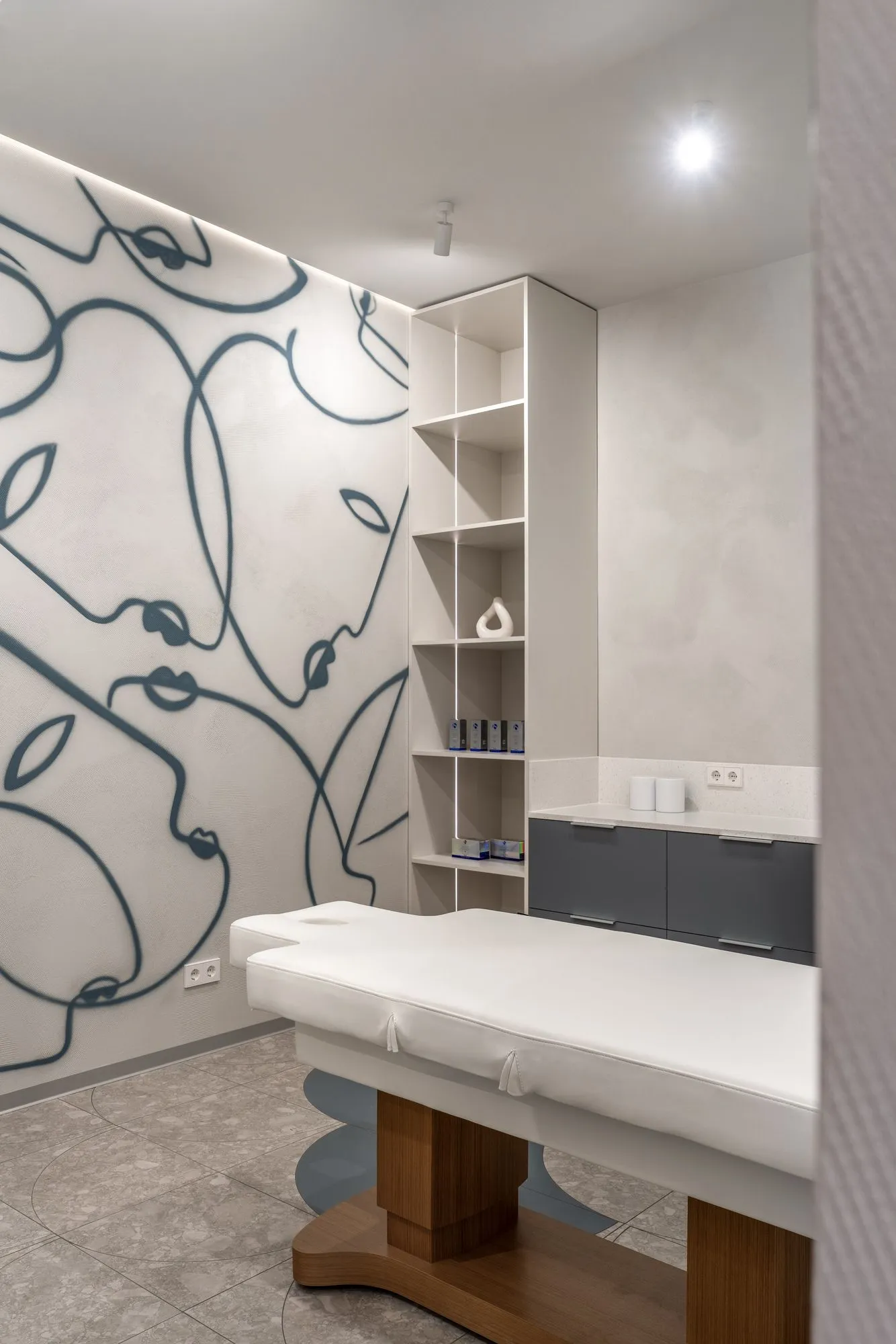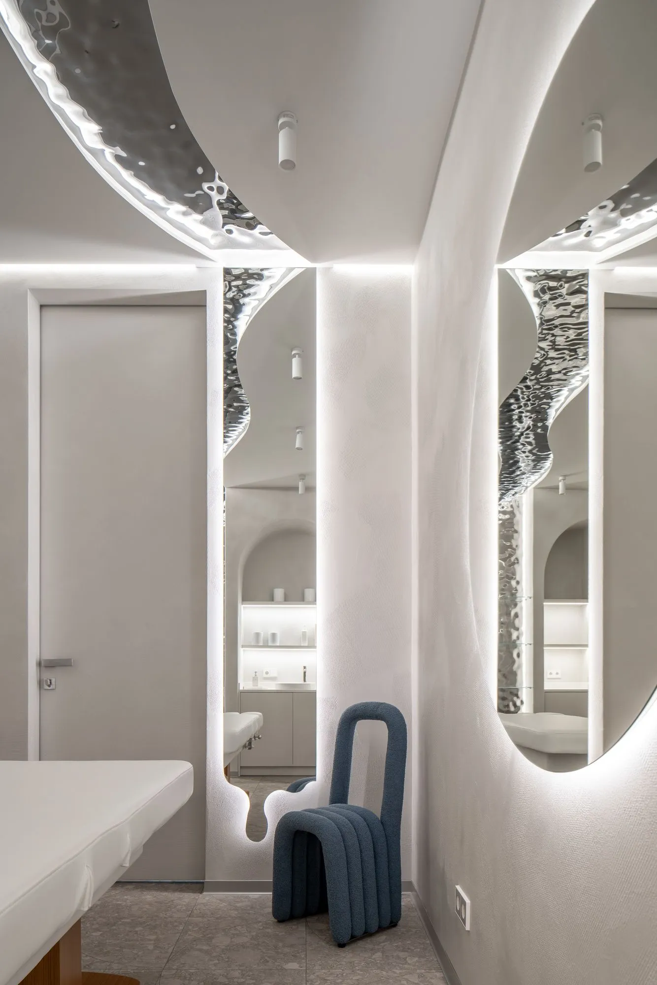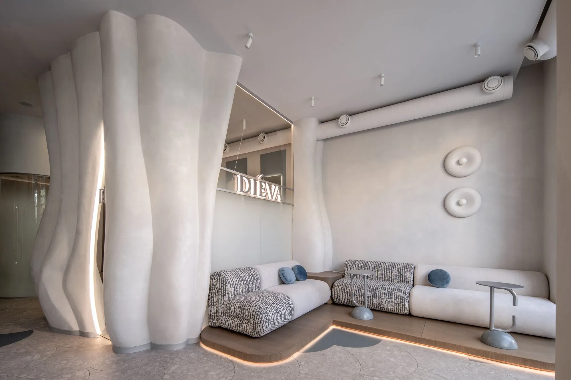 Дизайн центру краси та здоров'я DIEVA був для нашої команди дуже надихаючим проектом. За основну ідею ми обрали тему води , як символ очищення і оновлення і розвинули її в інтер'єрі з сенсами . Багато елементів ведуть візуально, але ненав'язливо погляд споживача викликаючи асоціації з морем , відпусткою і легкістю відпочинку, починаючи з підлогового покриття і стін, як схожі одночасно на морський пісок з віддтиском рибацької сітки і морські плавні скелі виточені морем. Металеві панелі, які відбивають світло імітуючи хвилі, шторка в дитячу взагалі окремий арт об'єкт і нагадує малюнок, який створюють хвилі на березі морського узбережжя. На стінах декори ручної роботи, які нагадують морські квіти, або дзеркала плавних форм.Синій колір зонально підсилює атмосферу і тематику. Також вправна гра світла , яке десь створює відчуття відкритого неба, яке ніби проривається в простір і засвічує оазис, який відразу за рецепцією зустрічає гостей. В зоні санвузла світло більш вечірне , і оповите малюнком світлових віблисків хвиль. Форма рецепції ігрива але і функціональна , оскільки в простору два входи ,і вона ніби зустрічає відвідувачів з обох. Форма рецепції також символізує форму корабля, який проходить морем а хвилі і сонячні зайчики відбиваються на його палубі і створюють малюнки.