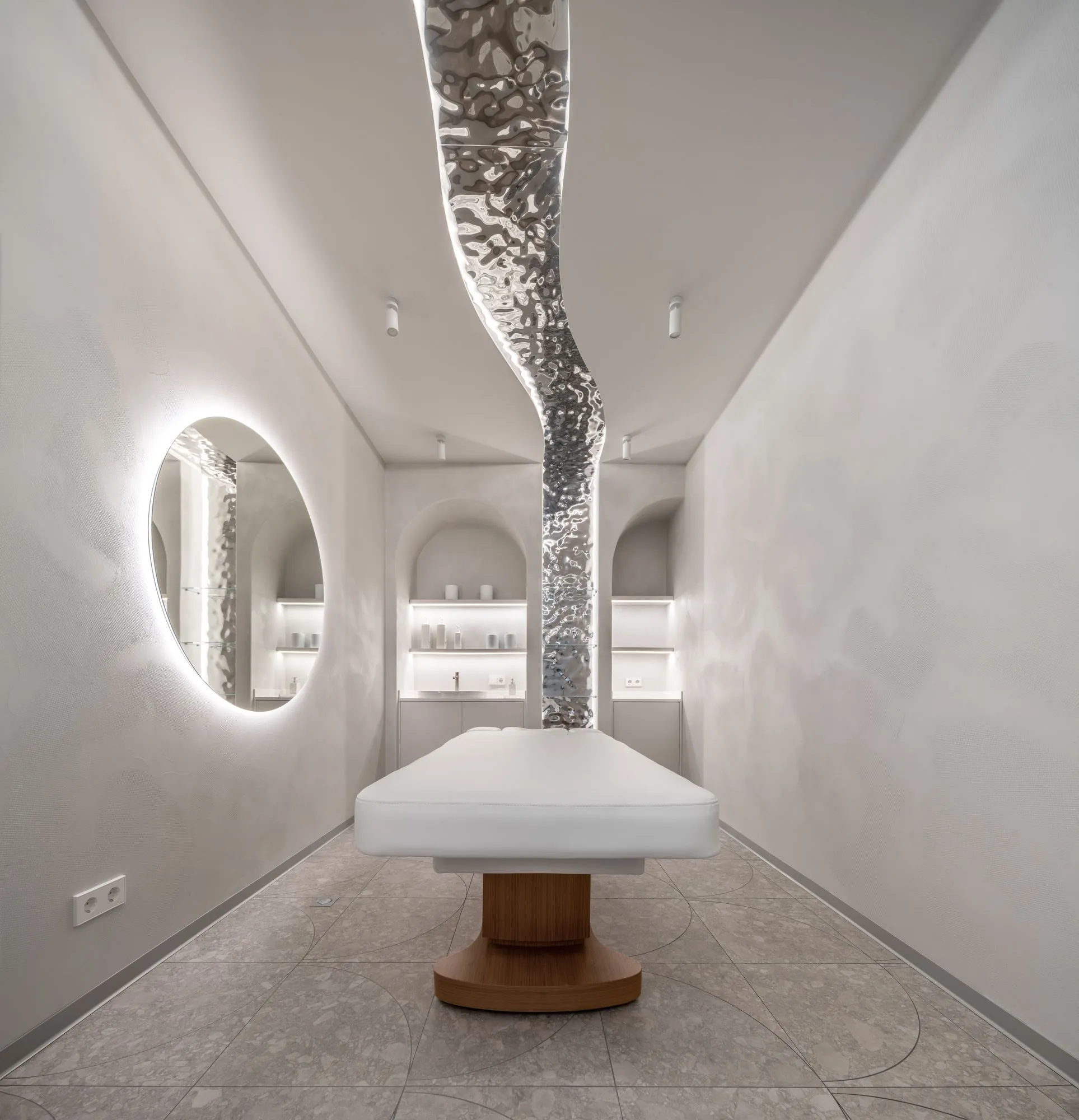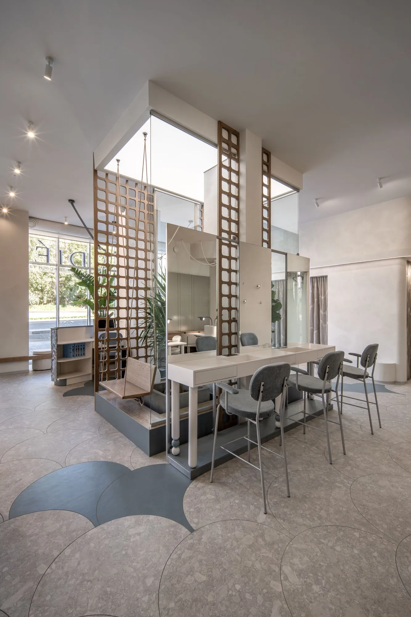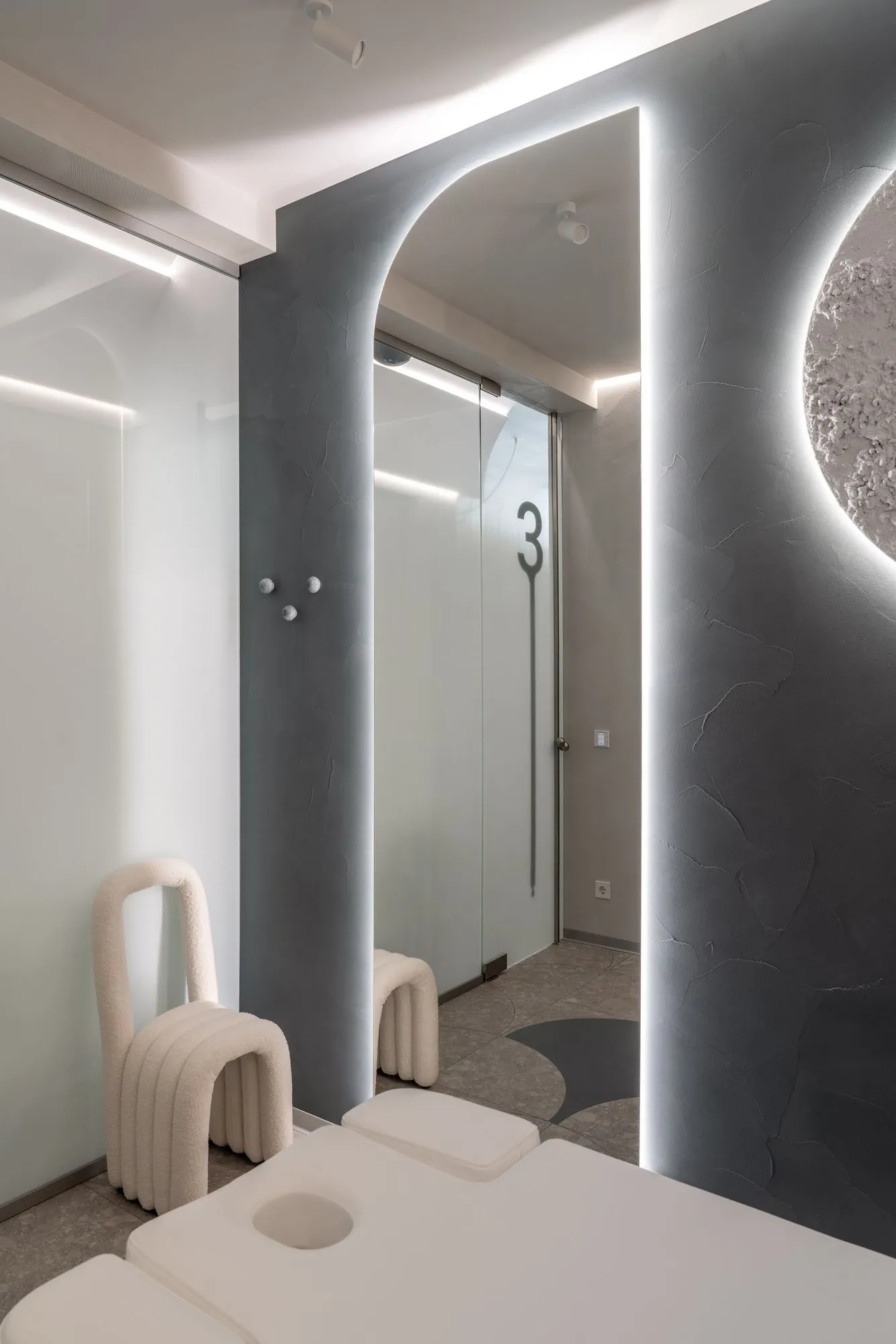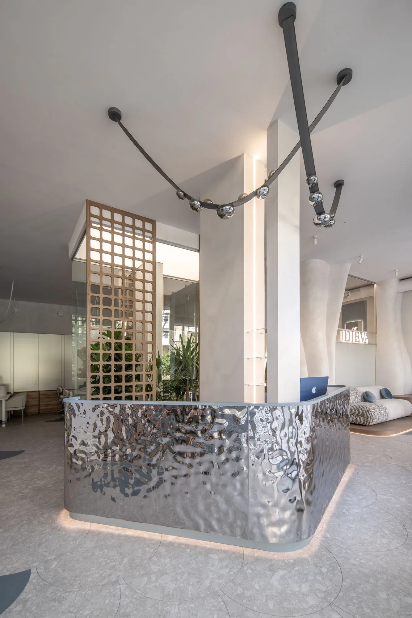 Дизайн центру краси та здоров'я DIEVA був для нашої команди дуже надихаючим проектом. За основну ідею ми обрали тему води , як символ очищення і оновлення і розвинули її в інтер'єрі з сенсами . Багато елементів ведуть візуально, але ненав'язливо погляд споживача викликаючи асоціації з морем , відпусткою і легкістю відпочинку, починаючи з підлогового покриття і стін, як схожі одночасно на морський пісок з віддтиском рибацької сітки і морські плавні скелі виточені морем. Металеві панелі, які відбивають світло імітуючи хвилі, шторка в дитячу взагалі окремий арт об'єкт і нагадує малюнок, який створюють хвилі на березі морського узбережжя. На стінах декори ручної роботи, які нагадують морські квіти, або дзеркала плавних форм.Синій колір зонально підсилює атмосферу і тематику. Також вправна гра світла , яке десь створює відчуття відкритого неба, яке ніби проривається в простір і засвічує оазис, який відразу за рецепцією зустрічає гостей. В зоні санвузла світло більш вечірне , і оповите малюнком світлових віблисків хвиль. Форма рецепції ігрива але і функціональна , оскільки в простору два входи ,і вона ніби зустрічає відвідувачів з обох. Форма рецепції також символізує форму корабля, який проходить морем а хвилі і сонячні зайчики відбиваються на його палубі і створюють малюнки.