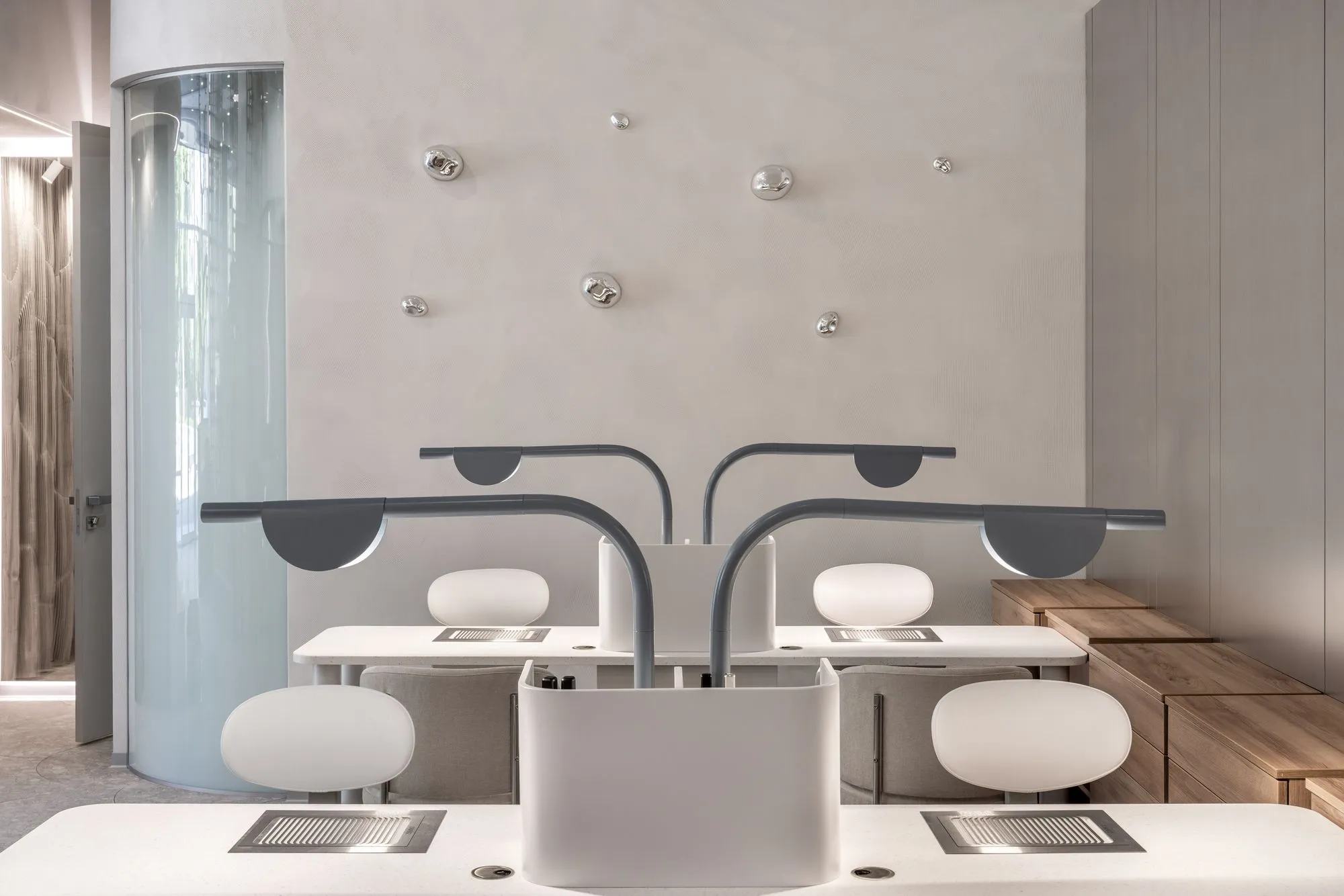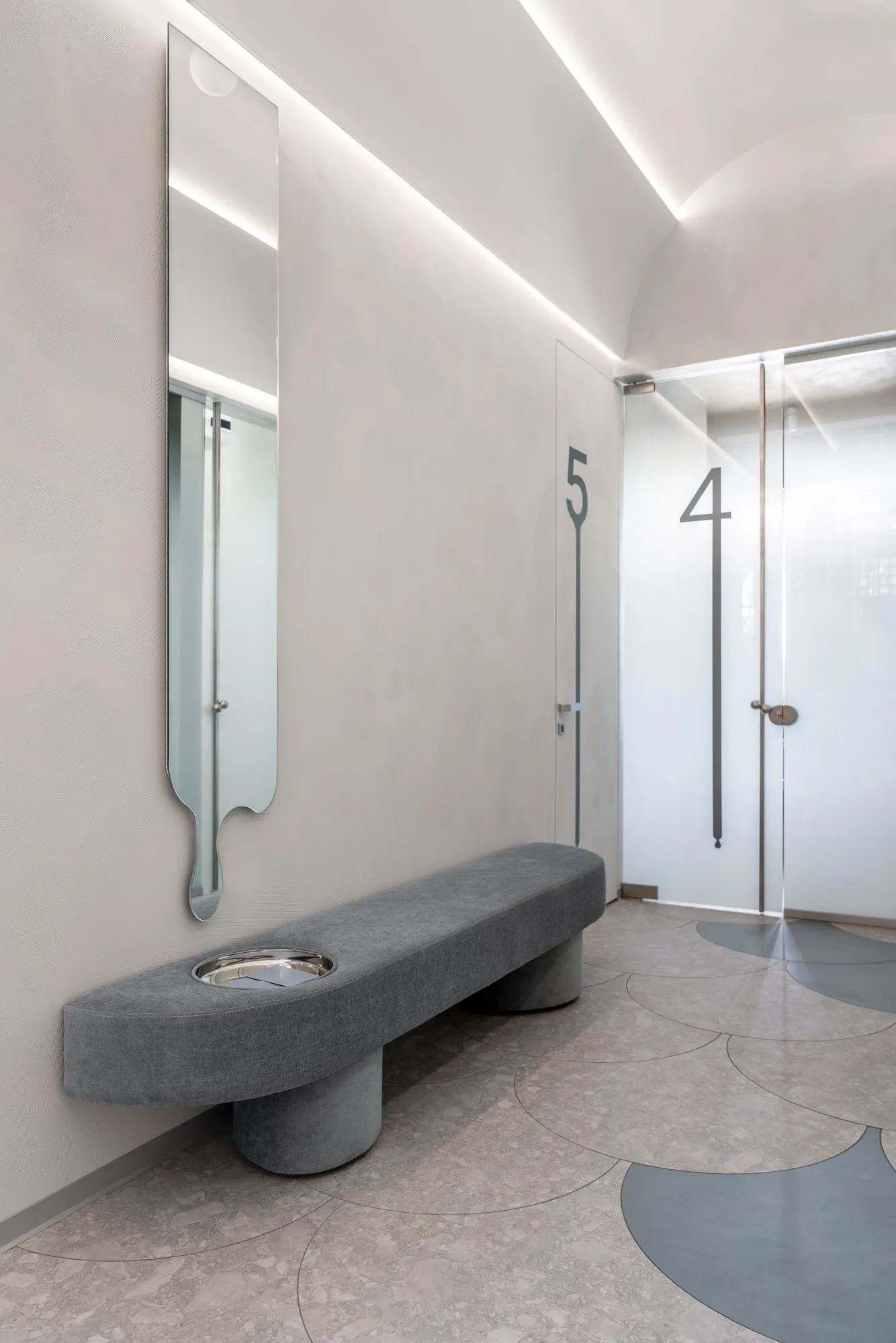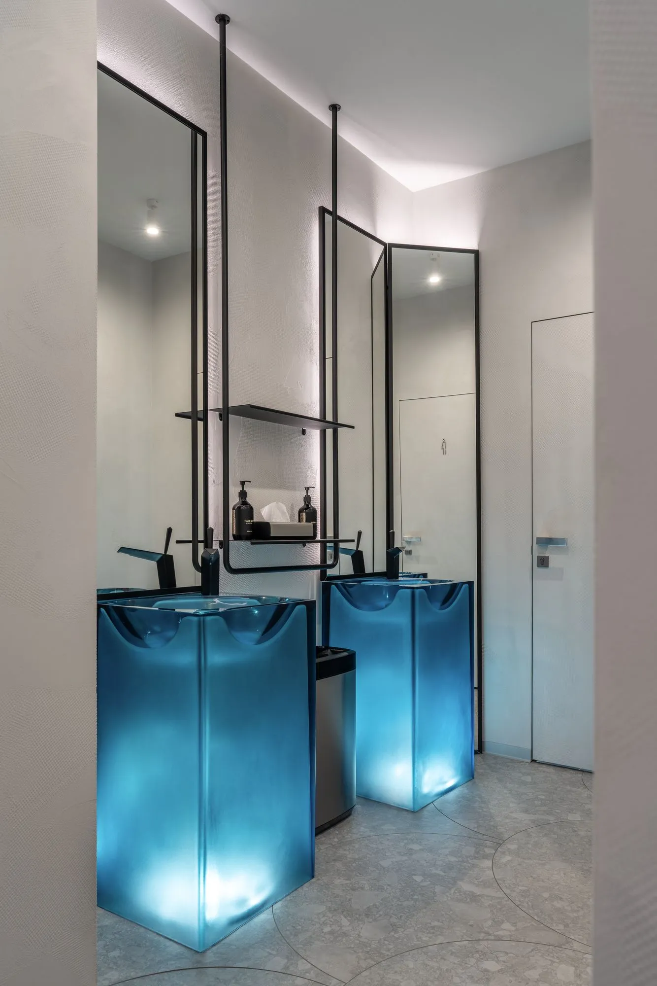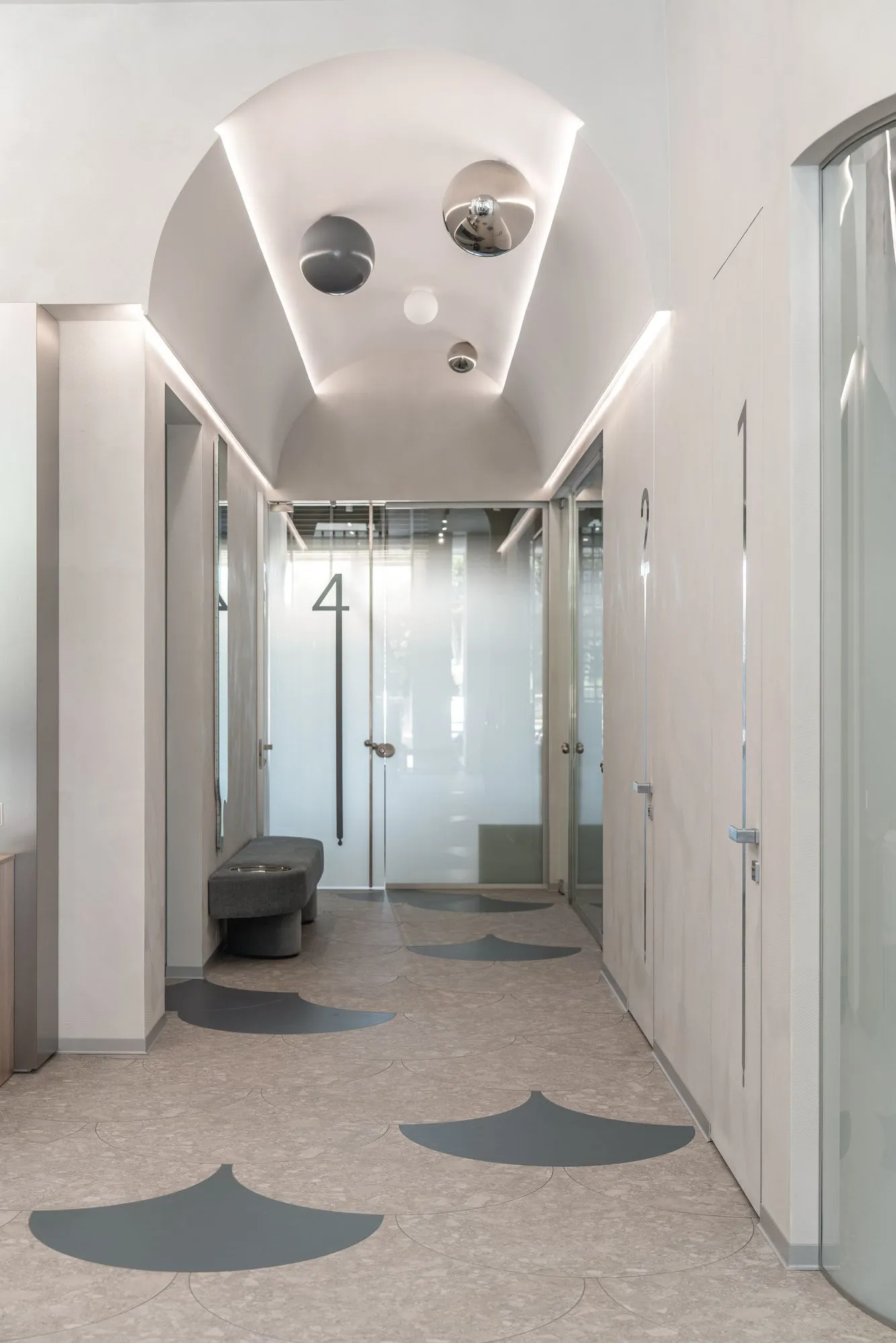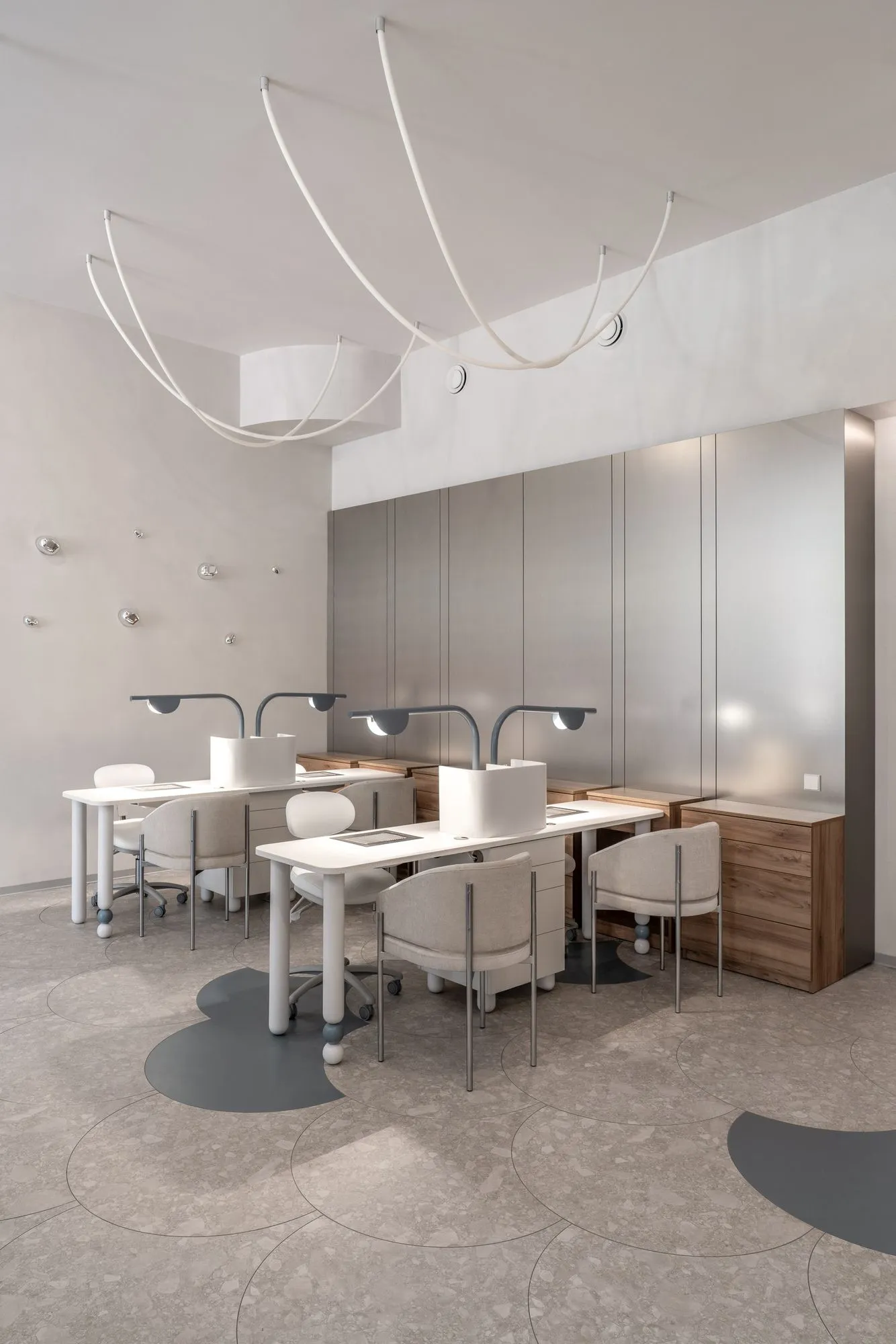 Дизайн центру краси та здоров'я DIEVA був для нашої команди дуже надихаючим проектом. За основну ідею ми обрали тему води , як символ очищення і оновлення і розвинули її в інтер'єрі з сенсами . Багато елементів ведуть візуально, але ненав'язливо погляд споживача викликаючи асоціації з морем , відпусткою і легкістю відпочинку, починаючи з підлогового покриття і стін, як схожі одночасно на морський пісок з віддтиском рибацької сітки і морські плавні скелі виточені морем. Металеві панелі, які відбивають світло імітуючи хвилі, шторка в дитячу взагалі окремий арт об'єкт і нагадує малюнок, який створюють хвилі на березі морського узбережжя. На стінах декори ручної роботи, які нагадують морські квіти, або дзеркала плавних форм.Синій колір зонально підсилює атмосферу і тематику. Також вправна гра світла , яке десь створює відчуття відкритого неба, яке ніби проривається в простір і засвічує оазис, який відразу за рецепцією зустрічає гостей. В зоні санвузла світло більш вечірне , і оповите малюнком світлових віблисків хвиль. Форма рецепції ігрива але і функціональна , оскільки в простору два входи ,і вона ніби зустрічає відвідувачів з обох. Форма рецепції також символізує форму корабля, який проходить морем а хвилі і сонячні зайчики відбиваються на його палубі і створюють малюнки.
