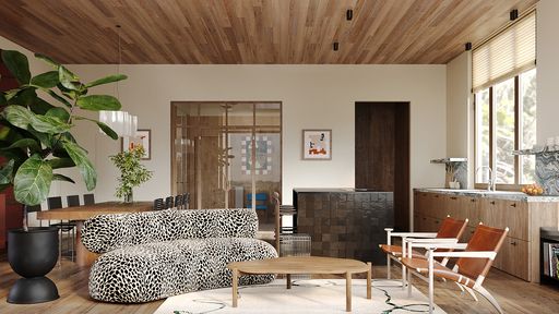 Особливої уваги заслуговує лаунж-зона — справжній оазис гедонізму з вініловим куточком та еклектичним анімалістичним диваном у комбінованій текстильній оббивці від Casamance. Плавним переходом лаунж зливається з кухонною зоною, де барні стільці від HAY доповнюють монохромний острів, оздоблений геометричною плиткою Zellige. Великі вікна пропускають щедре природне світло, відкриваючи захоплюючий панорамний вид.