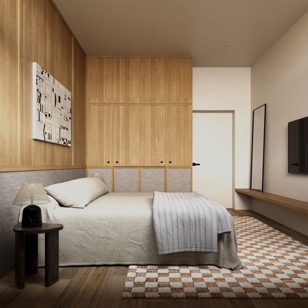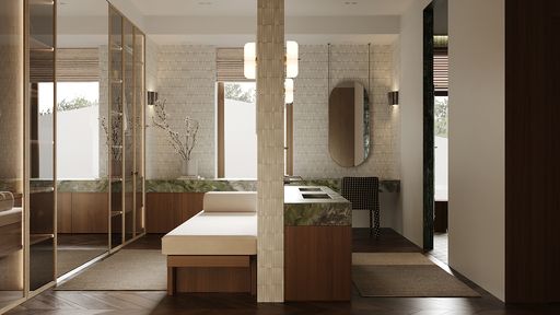 Майстер-блок спальної зони елегантно об'єднує гардеробну, спальню та ванну кімнату в єдиний об'єм. Тепла паркетна дошка, викладена ялинкою, стіни з мікроцементу та горіхове дерево з зеленим мармуром створюють атмосферу стриманої розкоші. Дитяча кімната у спокійних пастельних тонах пропонує два окремі ліжка з м'якими текстильними узголів'ями та круглим килимом з геометричним візерунком.