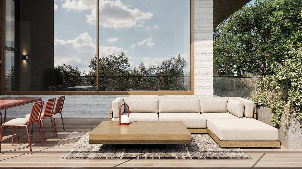 Ключовим рішенням стала інтеграція частини тераси в інтер'єр, створивши дворівневу вітальню. Верхній рівень став лаунжем для невимушеного відпочинку з інтегрованими стільцями, а нижній — зоною перегляду кіно з великим проєктором і глибоким кастомним диваном. Головна вітальня відзначається грою контрастів і фактур, де інтегрований скульптурний камін з барельєфним оздобленням від запрошеного скульптора став художнім акцентом. Поруч створено мінімалістичну офісну зону з меблями від Hay та світлом від &Tradition, делікатно відокремлену скляною перегородкою.