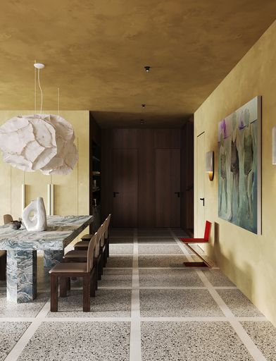 У створенні Fewlion використані теплий жовтий мікроцемент, що вкриває стіни, стелю та фасади кухонних шаф. Дерев'яні шпонові панелі додають затишку та структури, підкреслюючи натуральність матеріалів. Лампа Belux, розташована над столом, стає центральним освітлювальним акцентом у просторі.