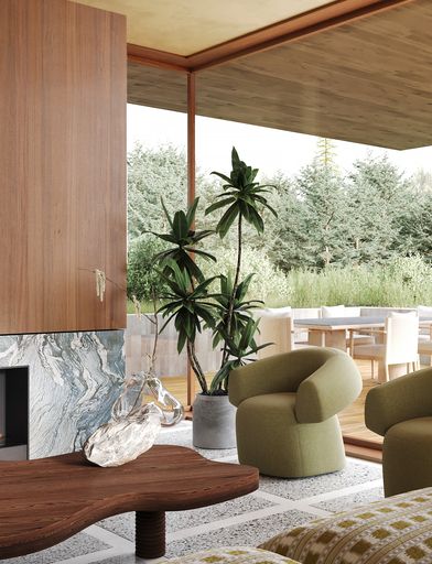 Зона каміну є справжнім архітектурним витвором, що заслуговує особливої уваги. Дерев'яні шпонові панелі формують чітку геометрію, що надає відчуття монументальності. Глибока ніша, підкреслена вбудованим арт-об'єктом – скульптурою, завершує композицію та підвищує емоційний резонанс простору.