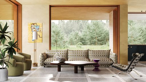 На підлозі виконано складний прийом із залитих плит з виразною текстурою, що надає інтер'єру впорядкованості. Основна палітра кольорів заснована на природних відтінках, але насичені акценти, такі як глибокий червоний стілець Cassina під картиною, вносять динаміку і емоційність.