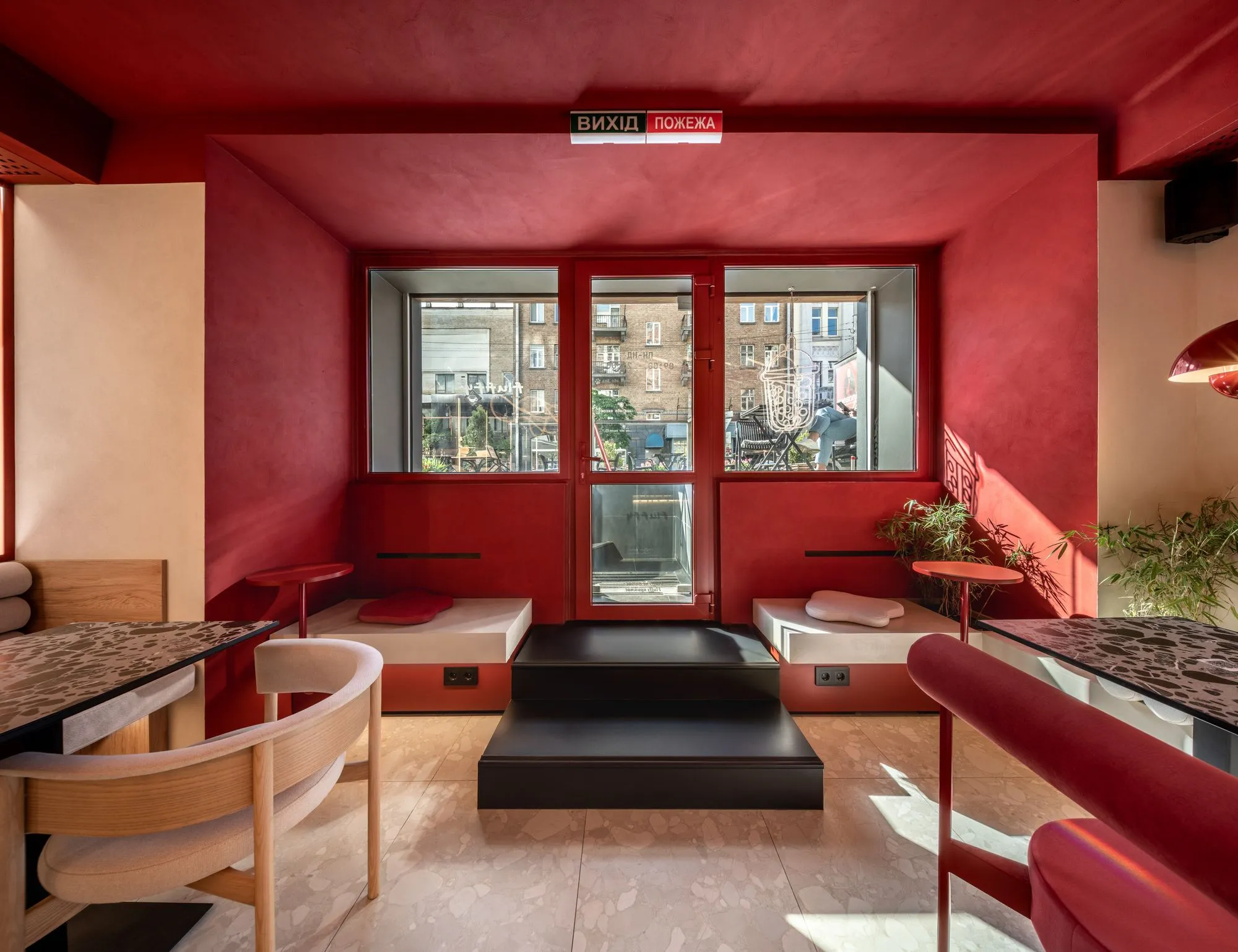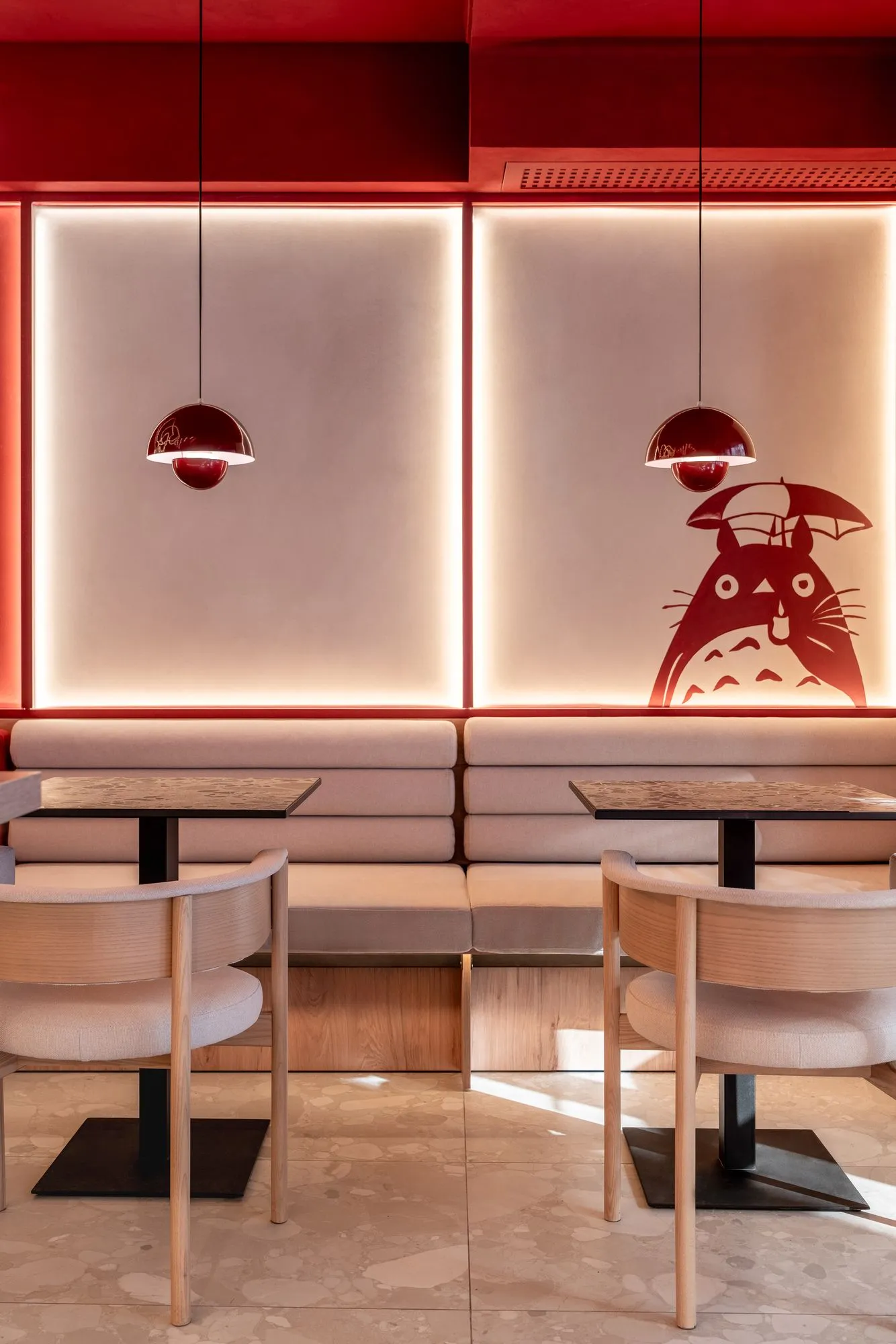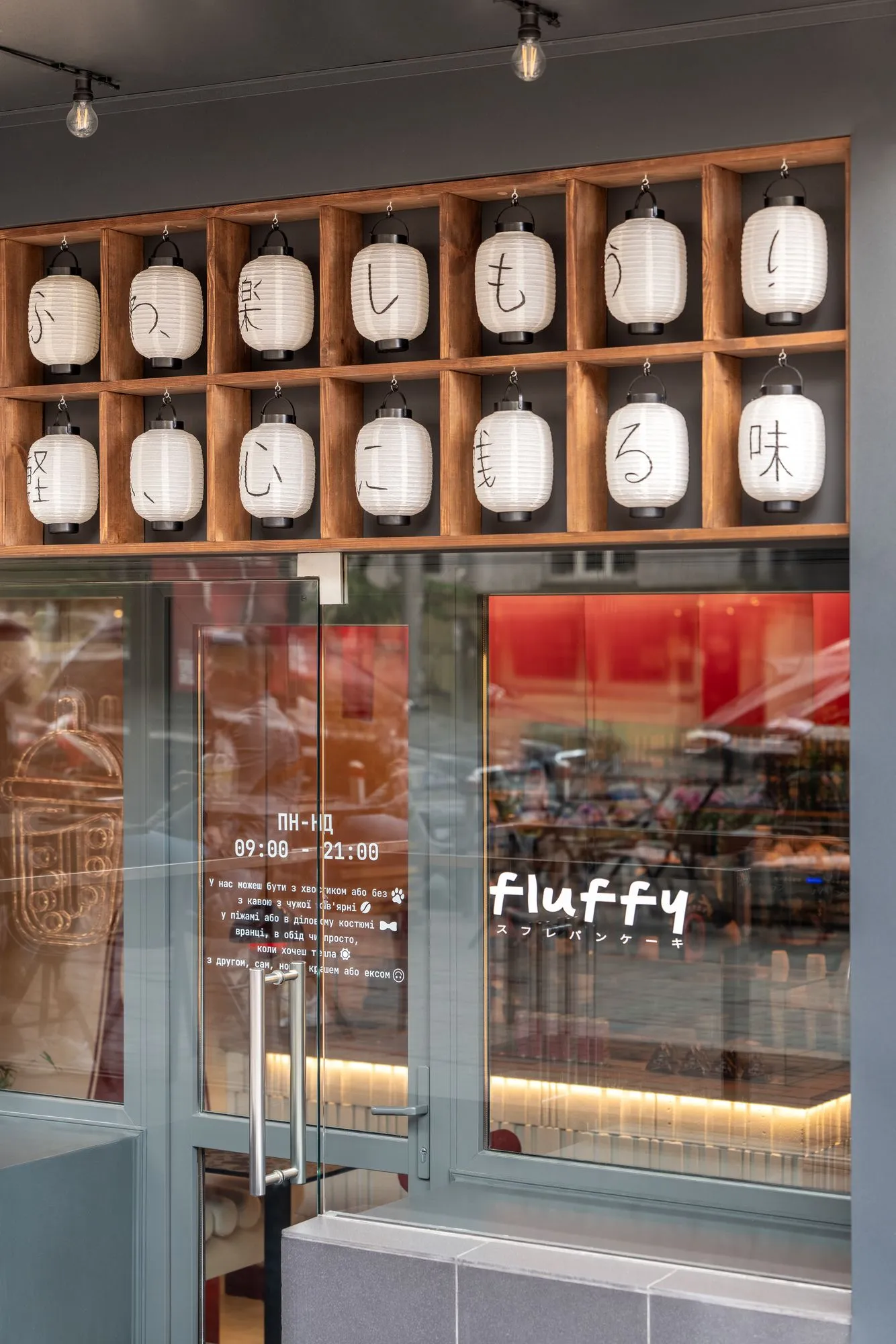 Молодіжний стильний заклад , японські пенкейки "Fluffy". Заклад сміливий по кольоровому рішенню, натхненний мультфільмами аніме та японською культурою. При вході використані японські ліхтарики що символізують єдність світів , а саме українського світу. Ієрогліфи виконують тут не тільки декоративну а і змістовну функцію, оскільки основана фраза перекладається як "життя яскраве як японський пенкейк". В просторі ми розвинули тему соня, в першому залі в нас сонце сходить а в другому воно вже ніби вийшло. Також бар оформлений в стилі street food з неоновими підсвітками, просте оформлення блоку , яке теж личить культурі стрітфуду, і тканини які додають шарму і легкості на яких плавно розсіююється світло . В другому залі є родзинкою є велика люстра - відносить нас ідейно до мистецтва "куміхімо" - мистецтво плетіння шнурів що є великою частиною японської культурної традиції, а символізують єднання і гармонію. Улюбленою стравою відвідувачів є саме японські пенкейки , тому подушки на сидіннях виготовлені у формі вилитого тіста.