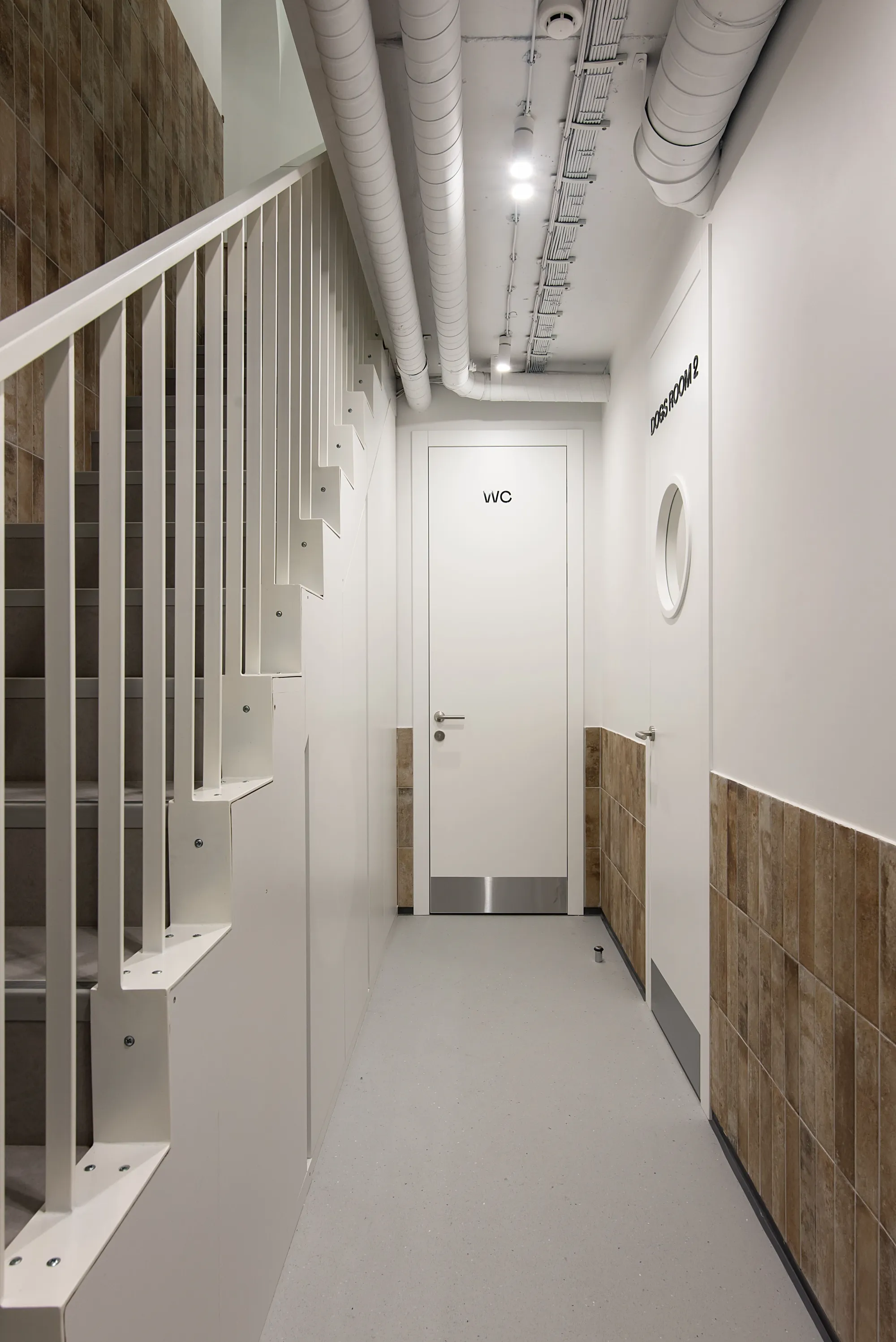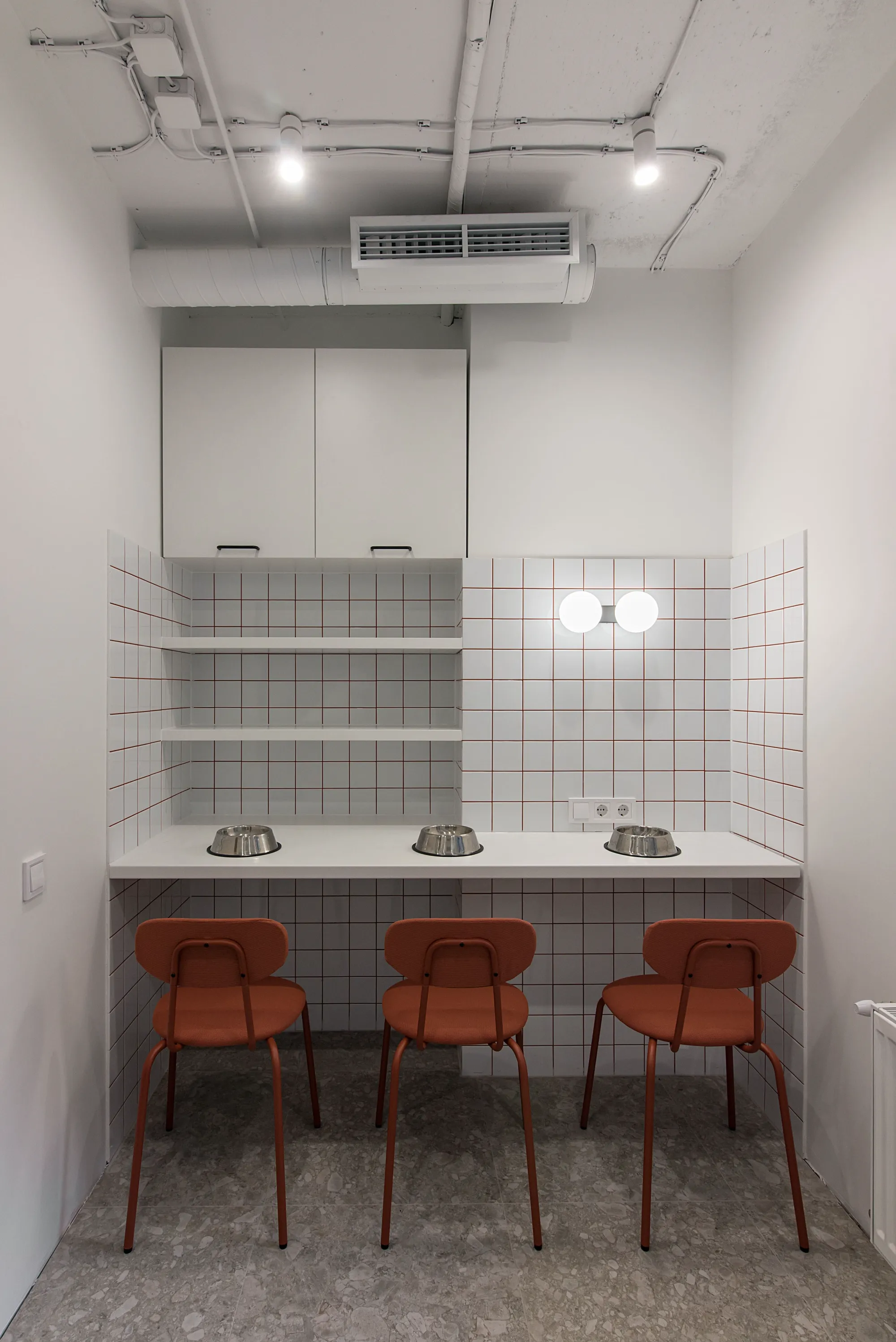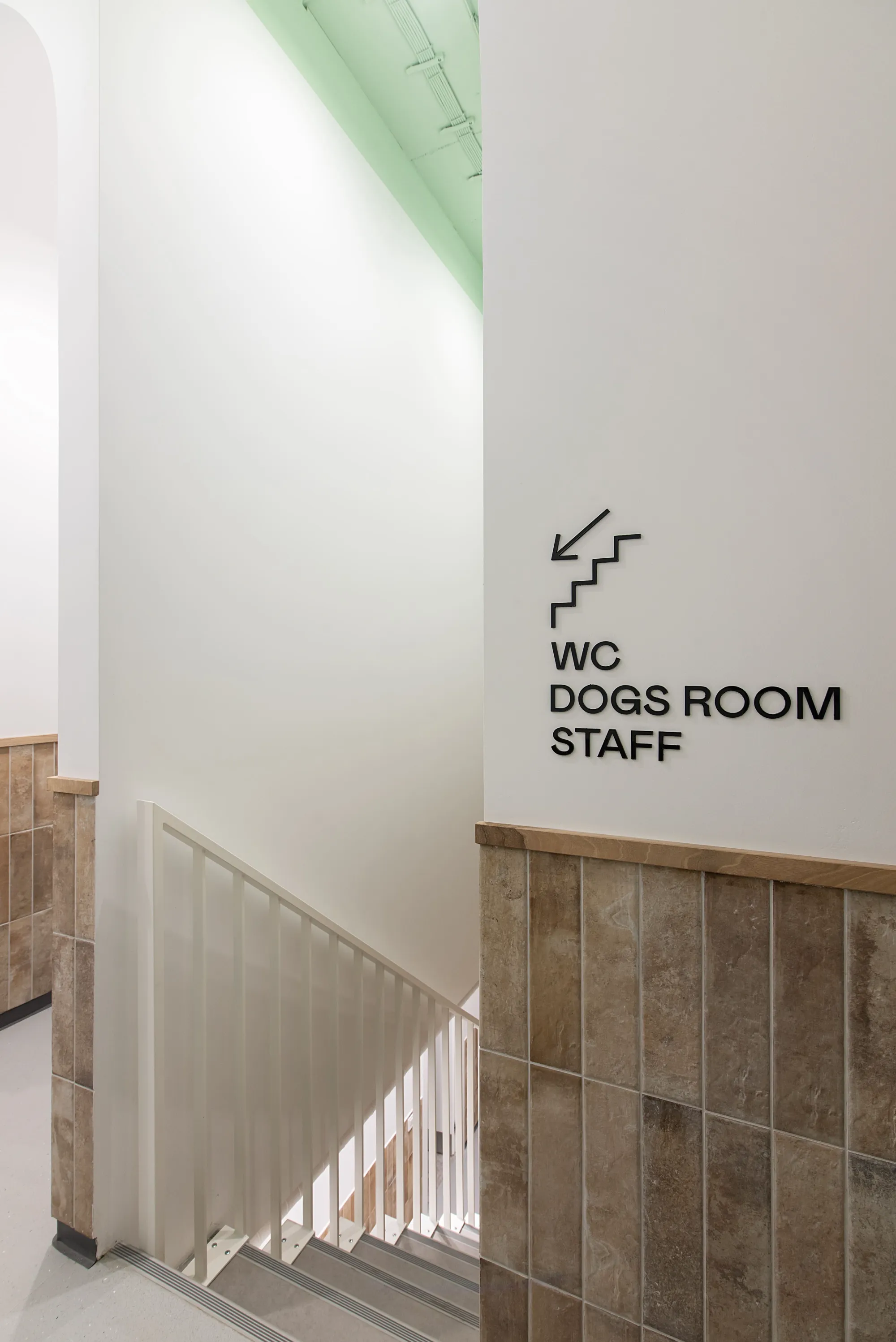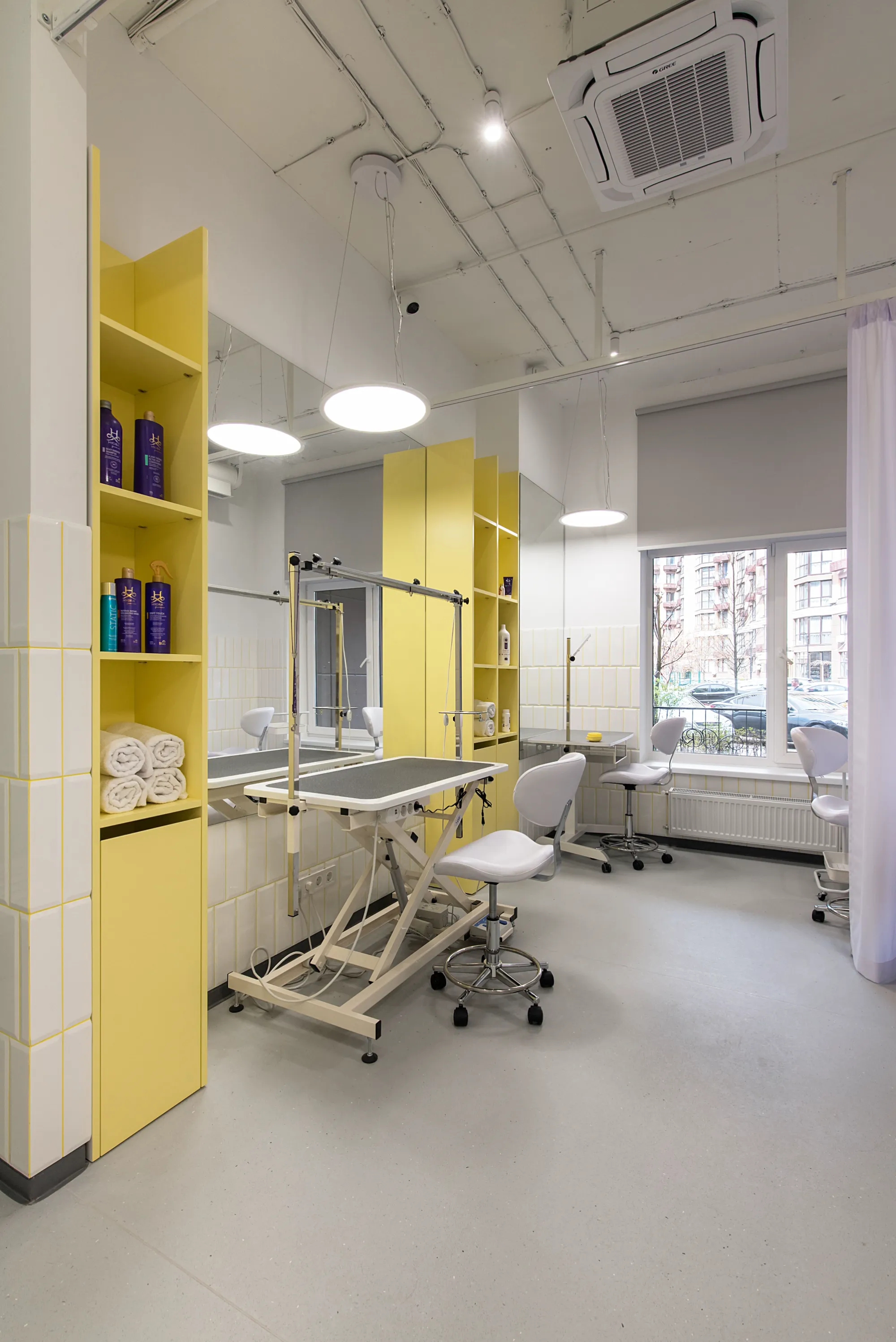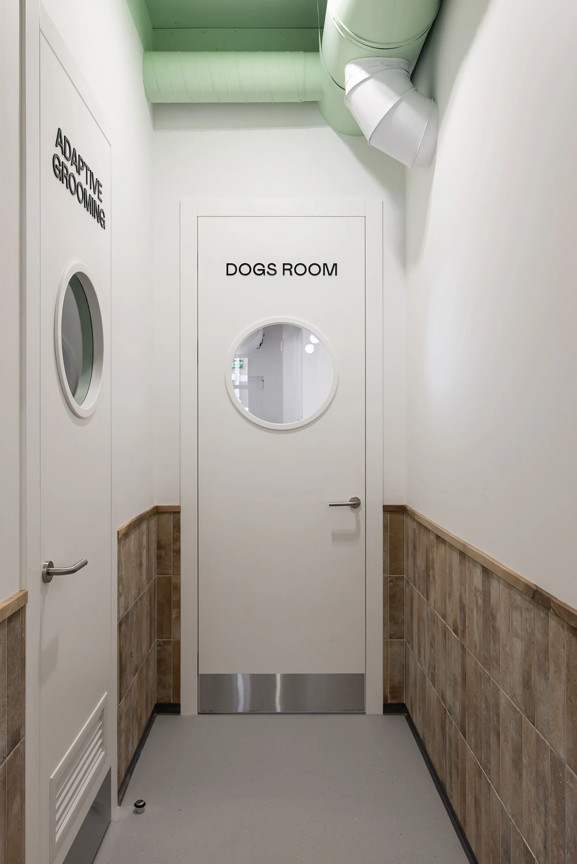 Покриття підлоги виконане з протиковзкого вінілу, що забезпечує безпеку для тварин. Стіни оздоблено плиткою — фірмовим елементом дизайн-коду франшизи, який забезпечує візуальну цілісність. Простір доповнено веселими й мудрими цитатами про собак, підсвіченими LED-стрічками для створення затишної атмосфери.