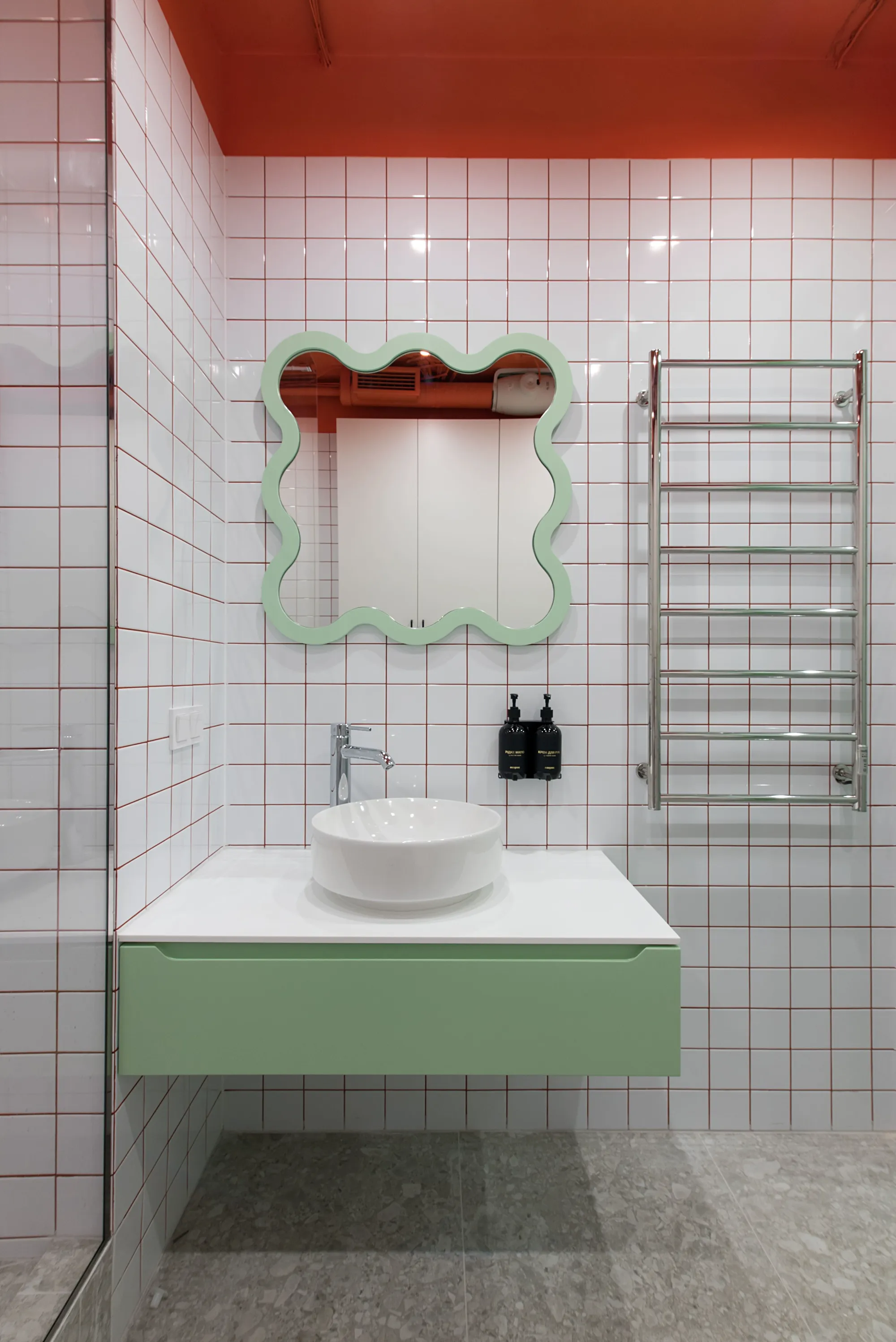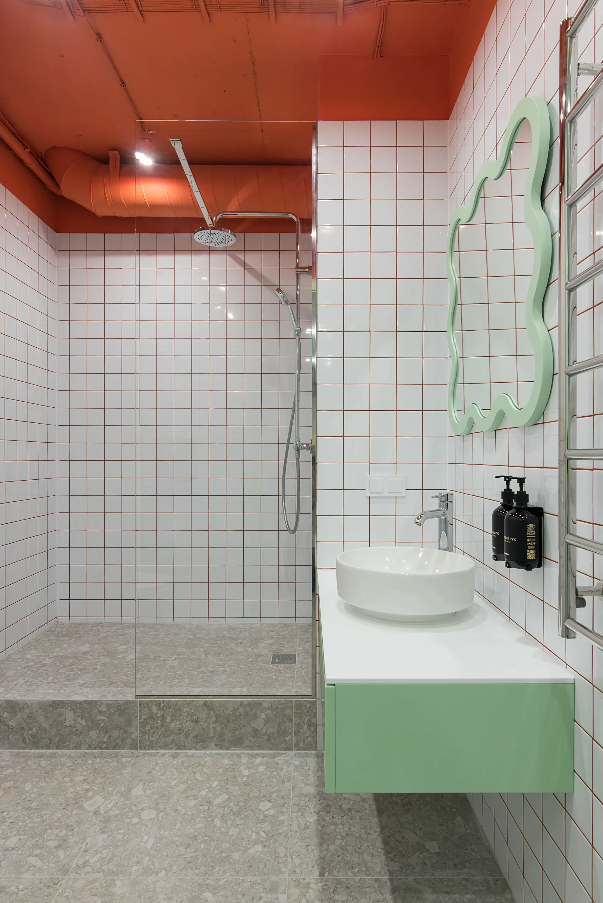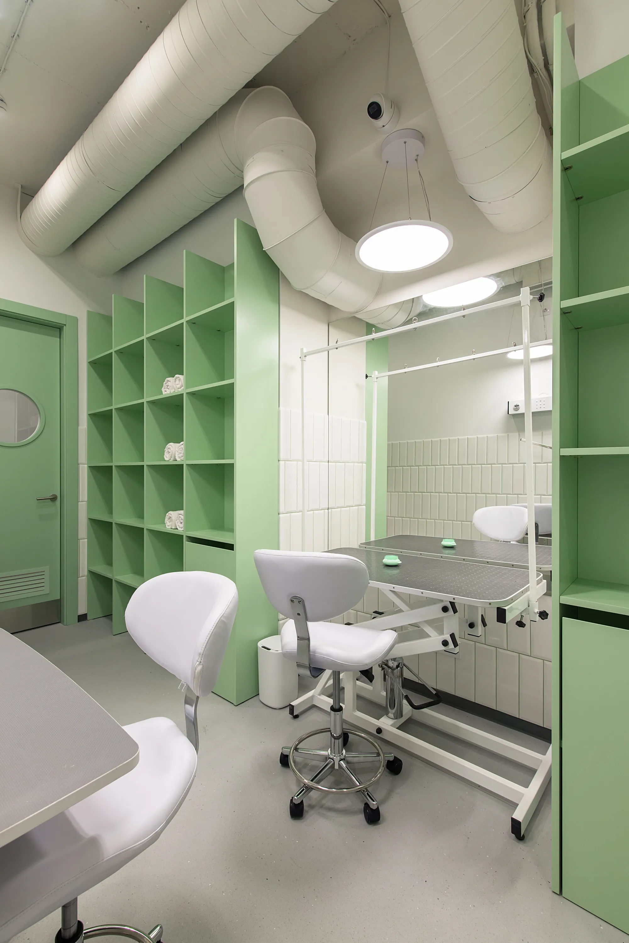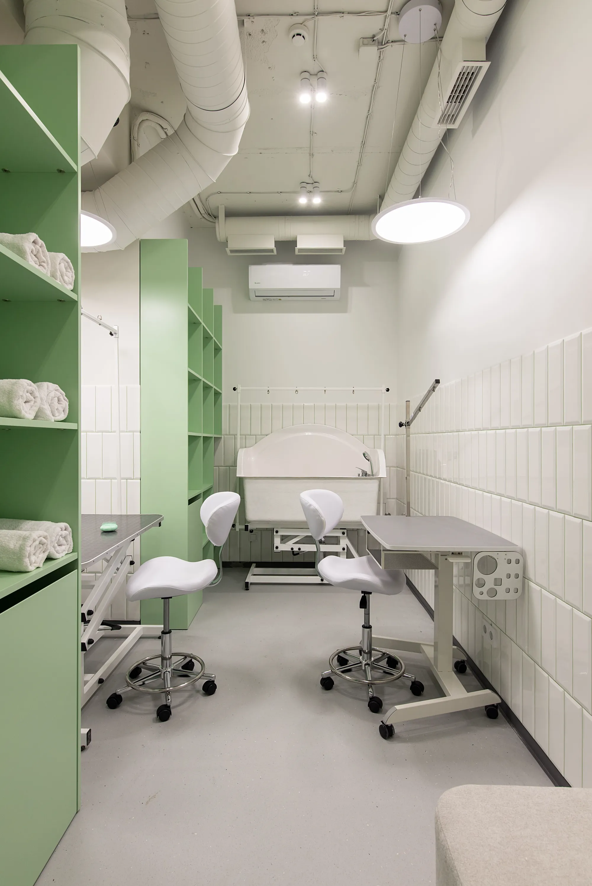 Кольорова палітра побудована на м’яких зелених тонах і теплому дереві, а акцентні кольори в грумінг-кімнатах і санвузлі додають динаміки та зберігають цілісність інтер’єру.