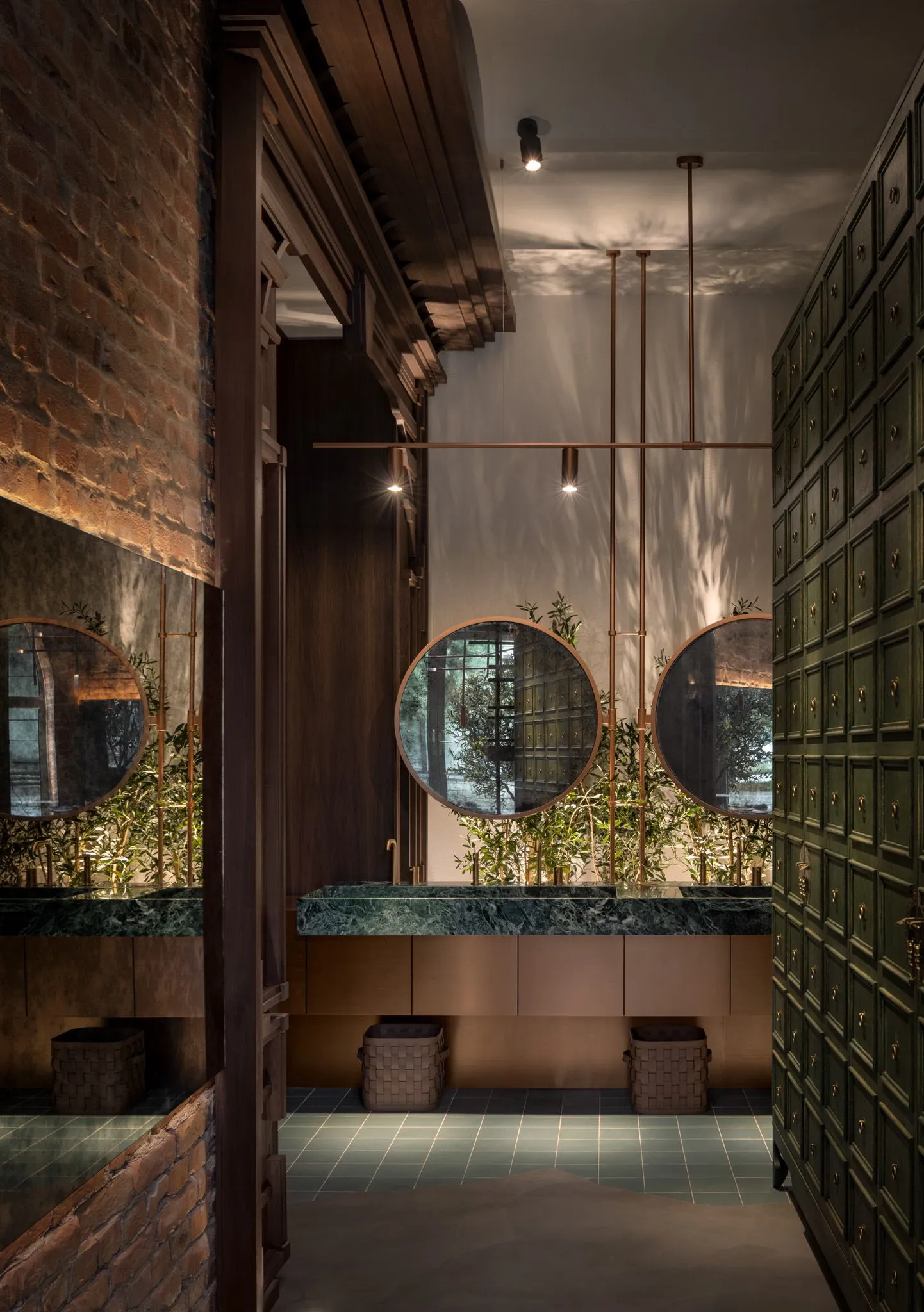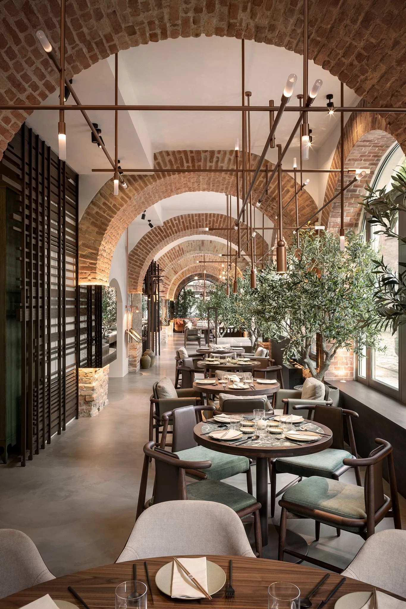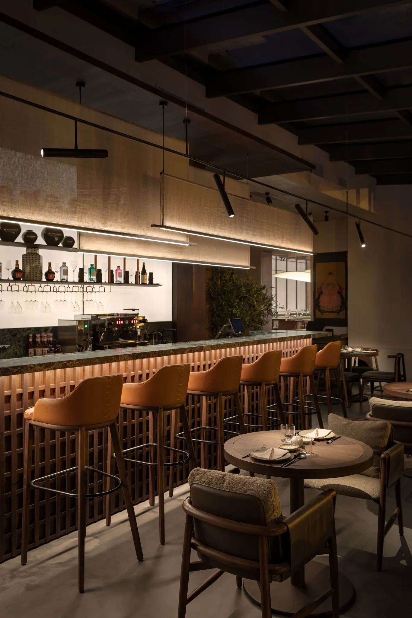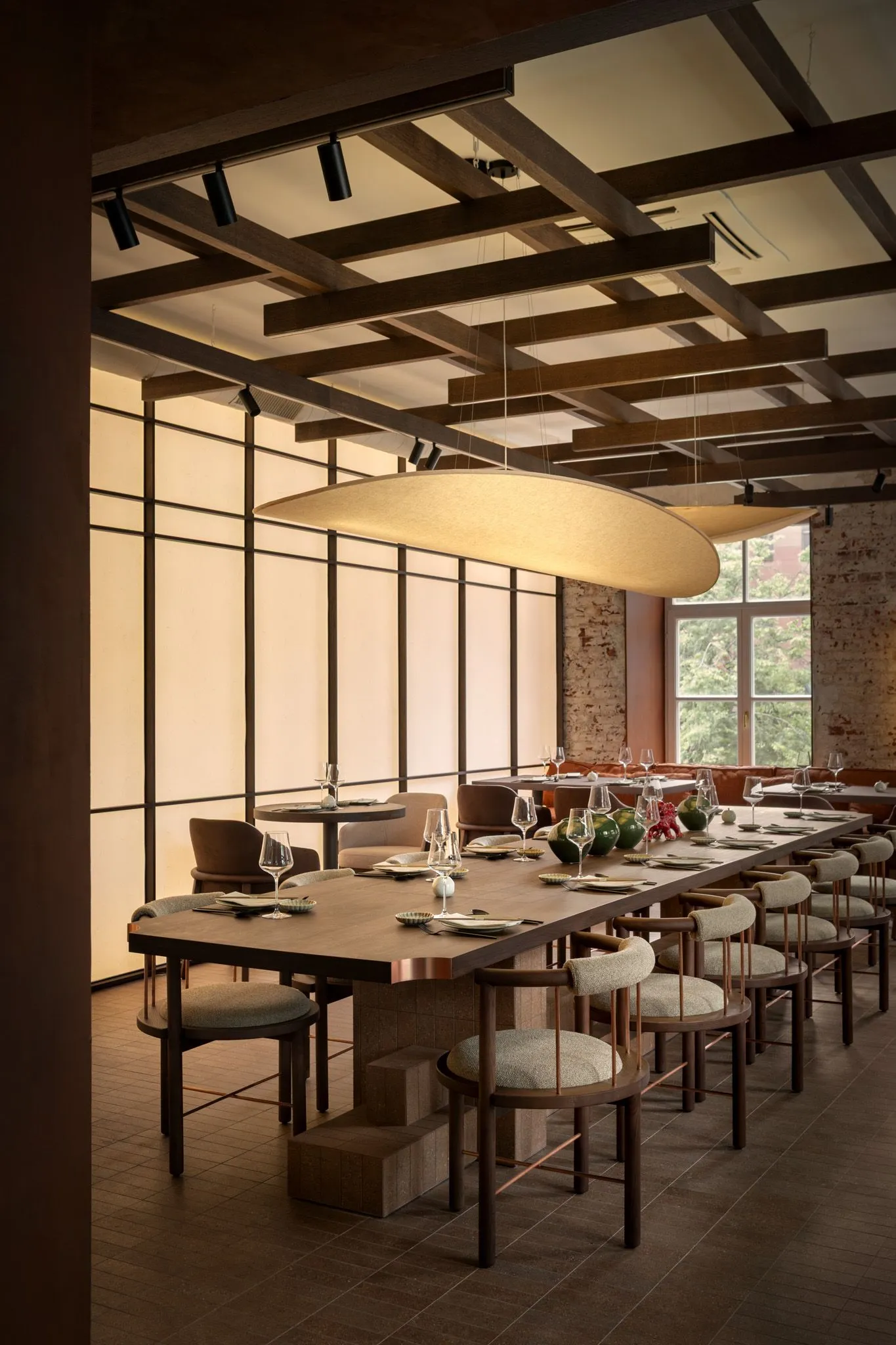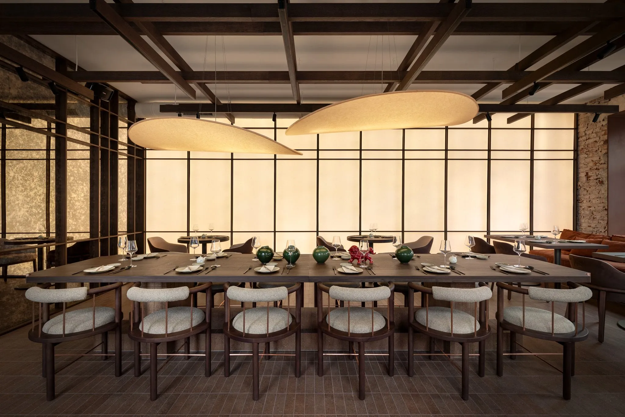 Традиційні шоджі в обідній зоні наповнюють атмосферу м’яким інтимним світлом. Ритмічна сітка з дерева створює відчуття структури й спокою, додаючи тактильної глибини. Портали відсилають до форми воріт торії: не буквальні копії, а витончені відлуння японських символів.