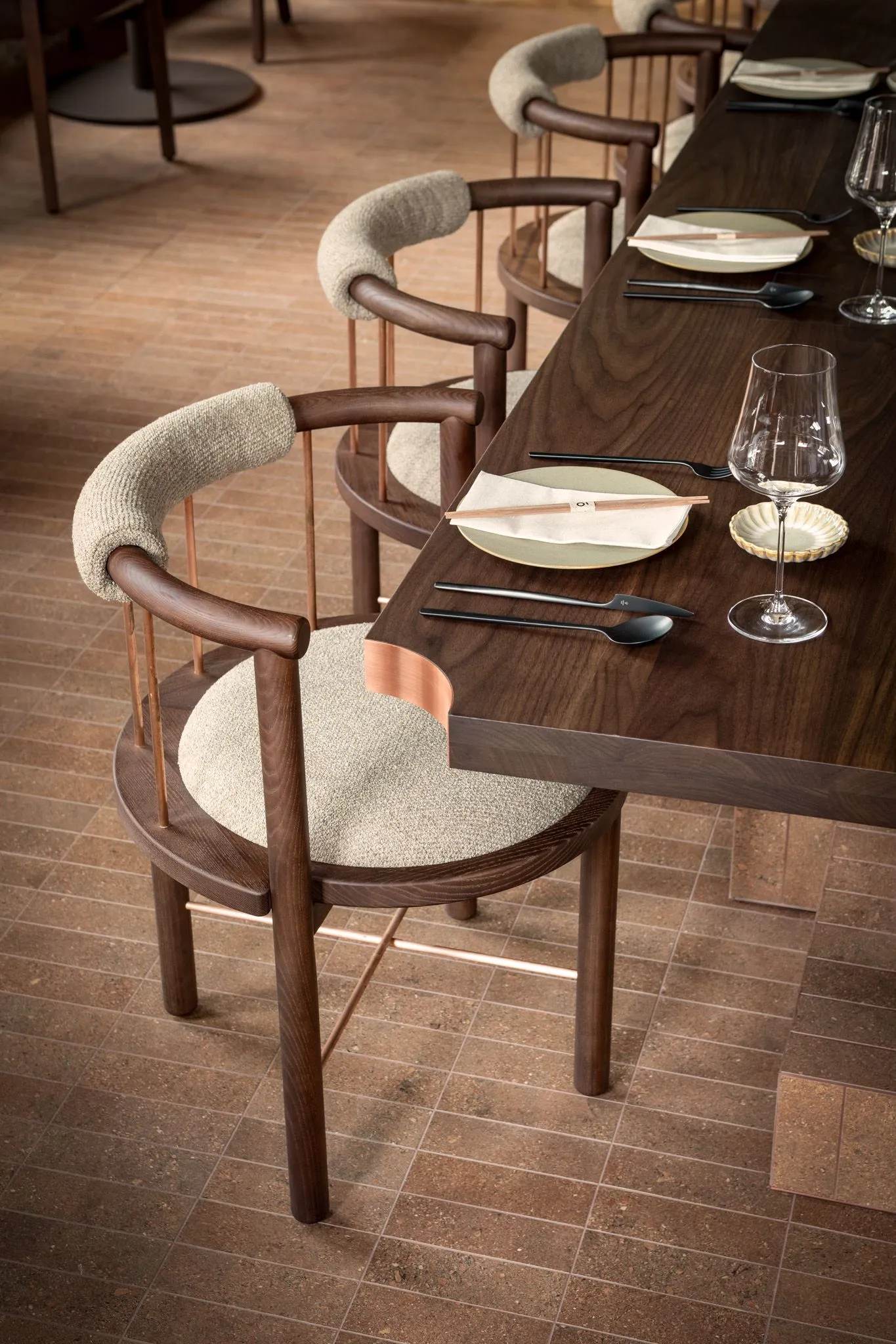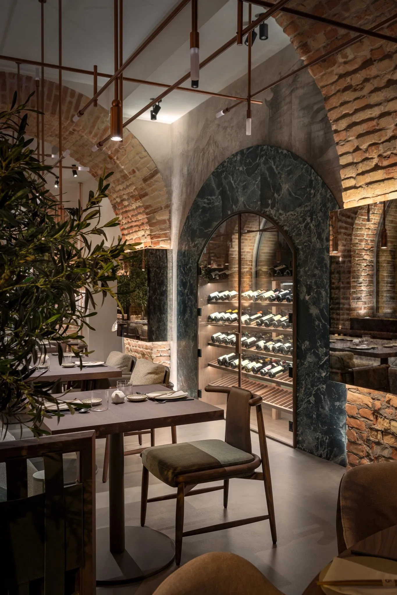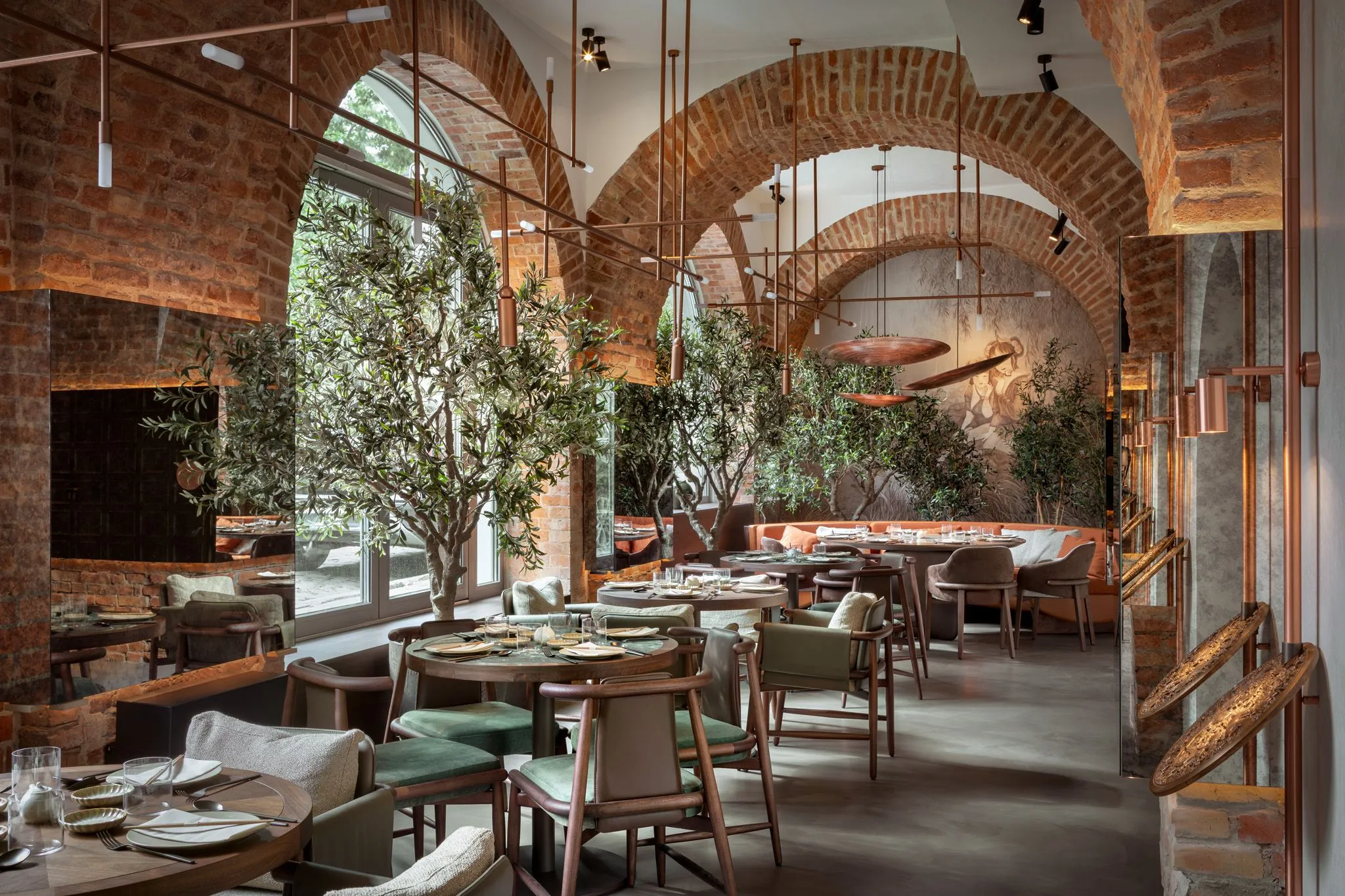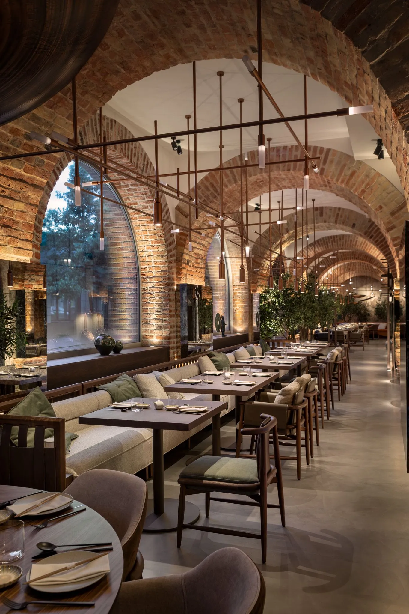 Арки формують плавні переходи між просторами, а монументальний спільний стіл наче виростає з підлоги, підкреслюючи ідею єдності. У центрі- гонг діаметром 1,5 м, знайдений на Балі. Колись лише деталь, він став душею простору та подарував ресторану ім’я.