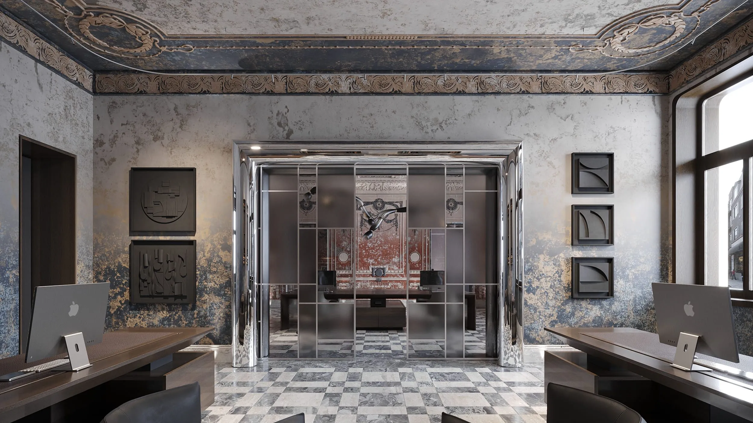 Архітектура будівлі насичена флоральними та зооморфними мотивами, що уособлюють природні стихії. Ми продовжили цей символізм у внутрішньому просторі: кожен поверх відтворює характер Землі, Води чи Повітря, плавно переходячи з однієї стихії в іншу, створюючи відчуття руху та гармонії. Особливого змісту надають символи дому: змії як знак мудрості й захисту та каштани як невід’ємний символ Києва. У центрі композиції постає дзеркальний інтерактивний куб рецепції — сучасний акцент, що відображає архітектуру й самих відвідувачів, підкреслюючи головну ідею модерну: «людина — вінець творіння».