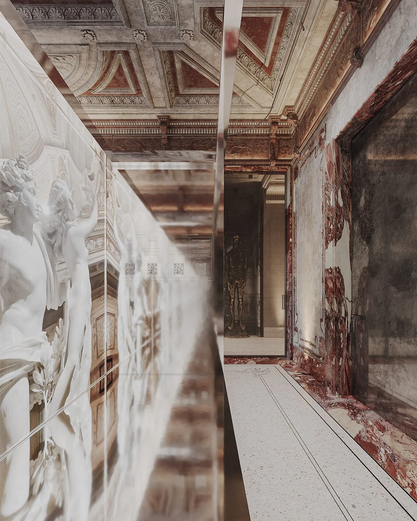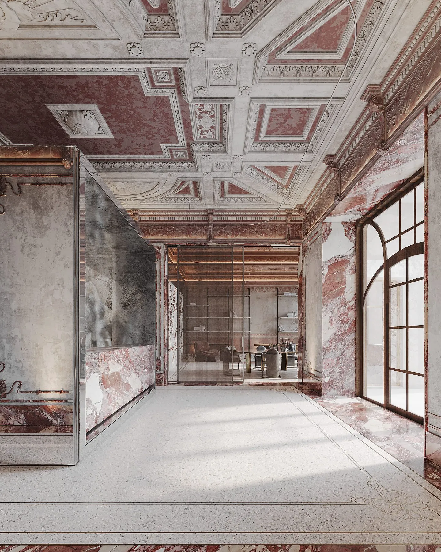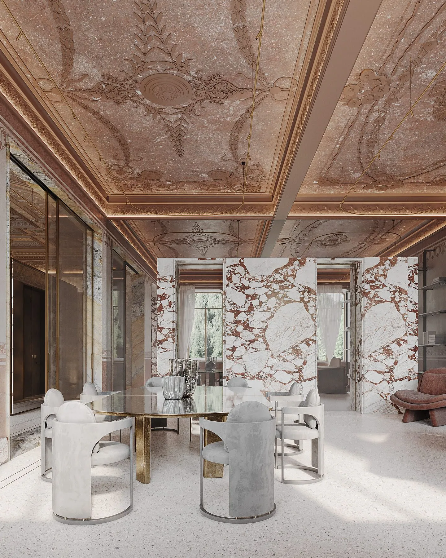У роботі з матеріалами команда IQOSA зберегла шаруватість часу, дозволивши історії звучати крізь фактури. Стелі поєднують відновлений ліпний декор і сучасні світлові інсталяції. Стіни відкривають зістарені поверхні та фрески, додаючи простору глибини. Підлоги виконані з тераццо та мармуру з інкрустаціями металевих елементів у вигляді рослинних мотивів і каштанів, що нагадують про спадковість ідентичності.