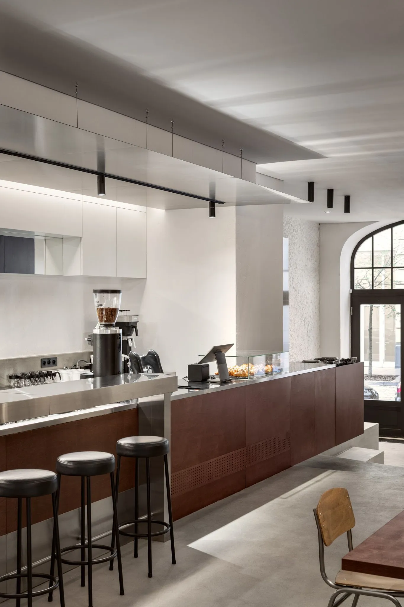 Матеріальна мова інтер’єру — мінімалістична та тактильна. Груба фактура білих стін поєднується зі шліфованим бетоном підлоги та подіумів, нержавійкою на робочих поверхнях і глибоким матовим деревом на барі та меблях. Великі площини, чіткі шви й контрольовані стики формують спокійне середовище для щоденної роботи простору.