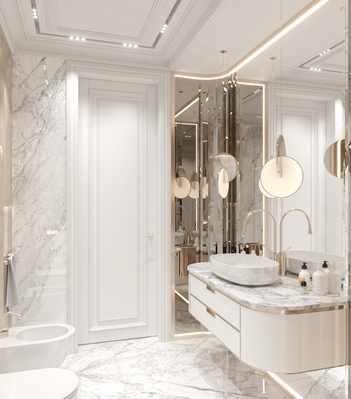 Ванні кімнати — справжні арт-простори. У них використано поєднання мармуру, латуні, дзеркал і декоративних світильників. Одна з них вирізняється гламурною золотистою мозаїкою, інша — ніжною палітрою рожевого з графічними вставками.