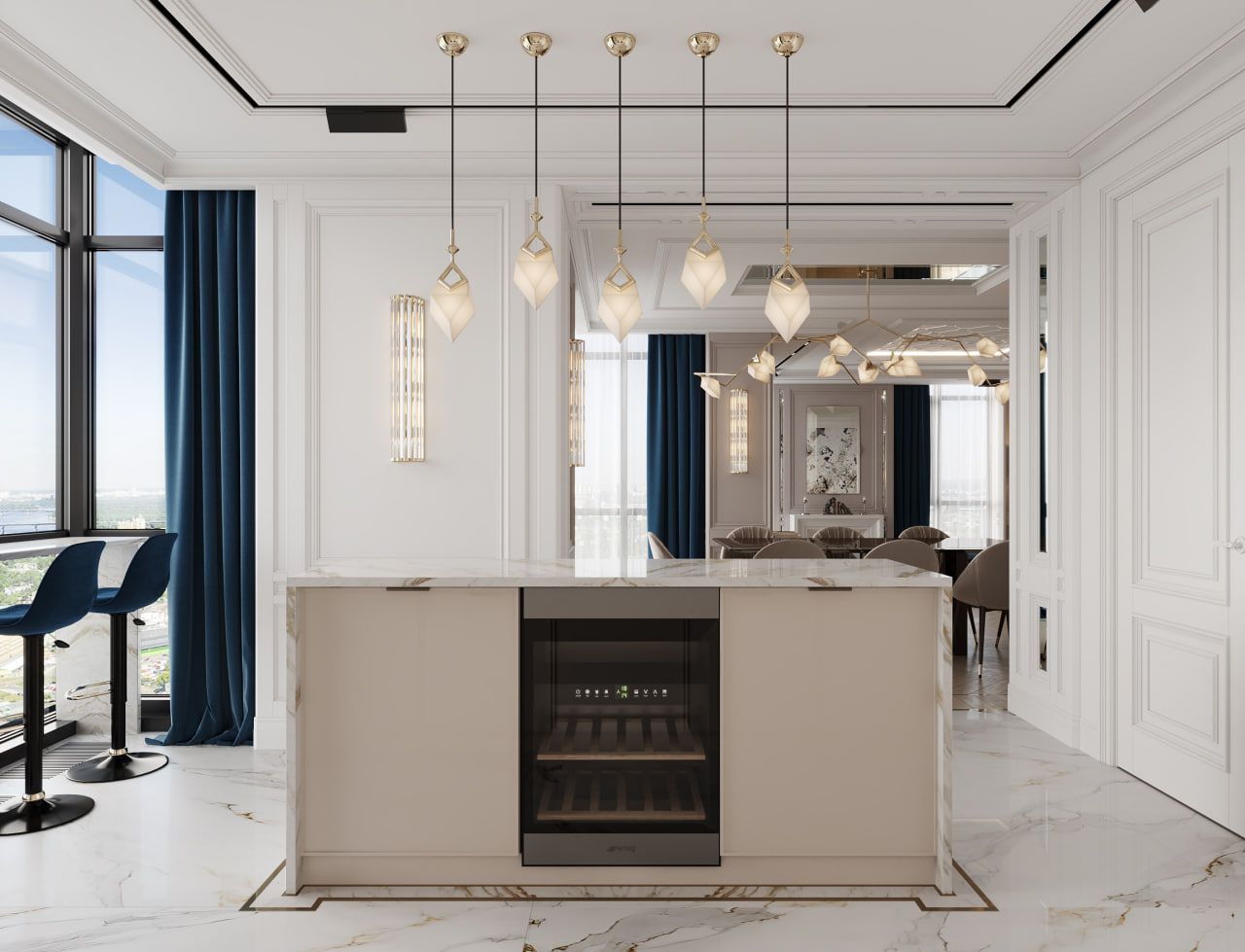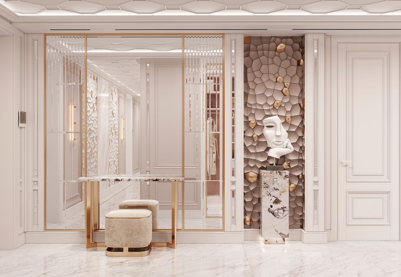 Окрема увага — функціональним просторам. Простора кухня з островом поєднує мармурові поверхні та сучасні мінімалістичні меблі. Столову зону підкреслюють багаторівневі світильники, що створюють святкову атмосферу навіть у будні. Гардеробні кімнати продумані до дрібниць: скляні фасади, підсвічування, акценти на зберігання колекцій сумок, взуття й аксесуарів.