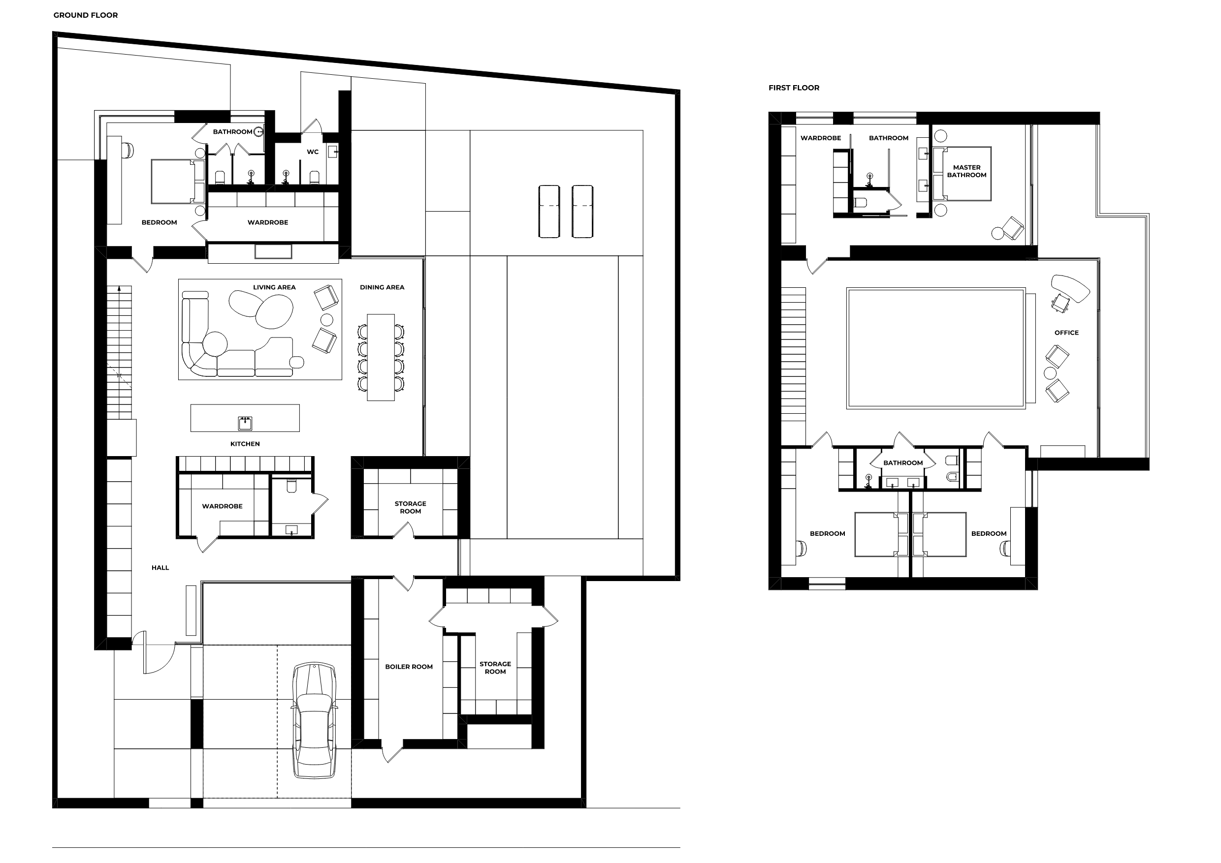 Перший поверх організовано навколо кухні-вітальні з великим обіднім столом на 8 персон та кухонним островом для приготування. Друге світло додає простору об’єму і світла, а з вітальні є прямий вихід до басейну. Тут також розташована спальня та окремий санвузол для гостей.