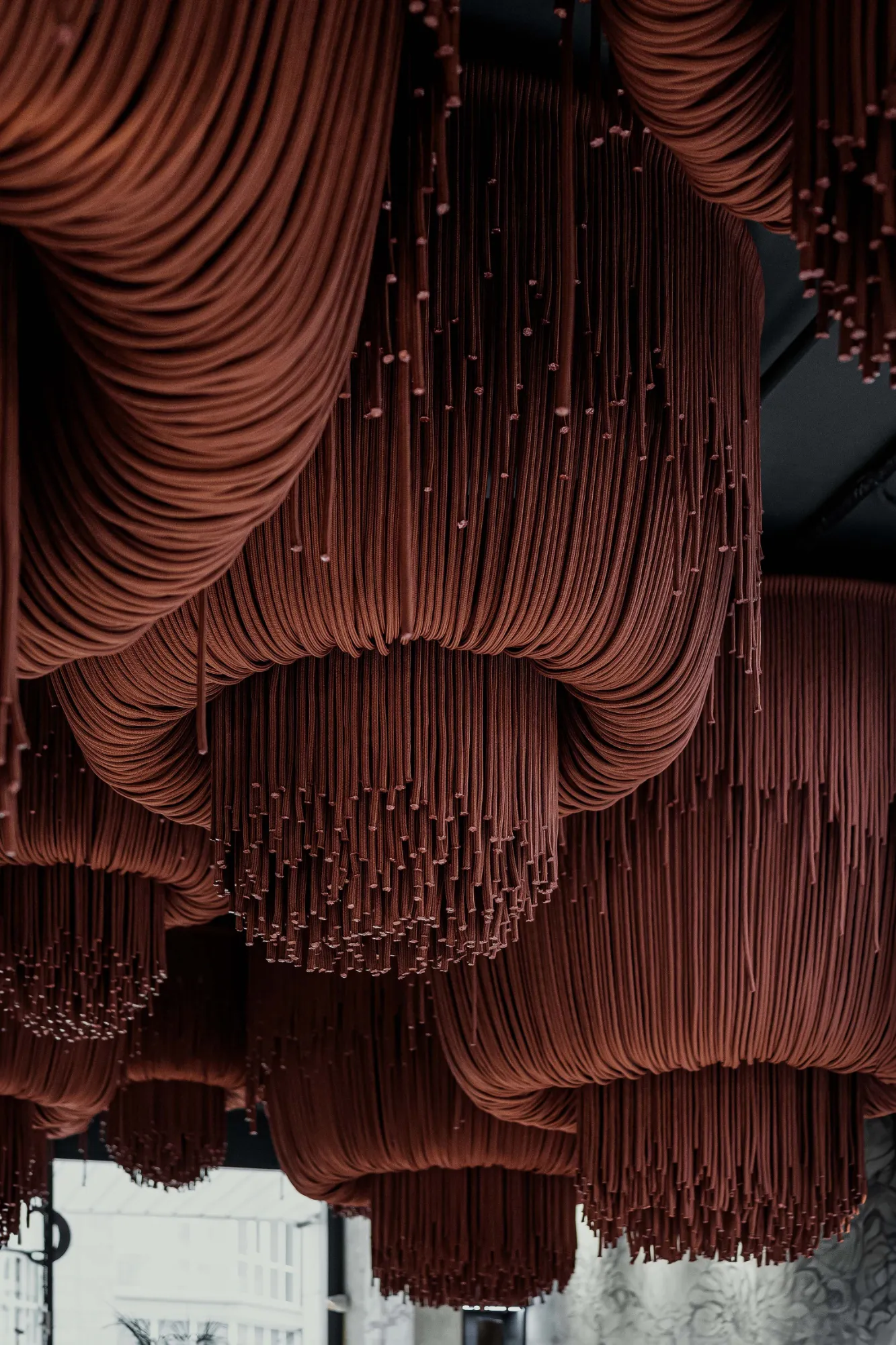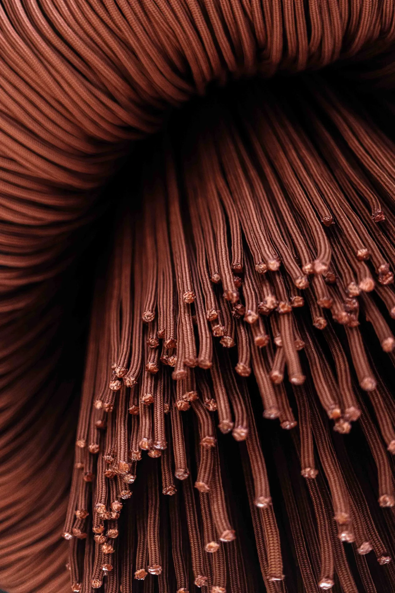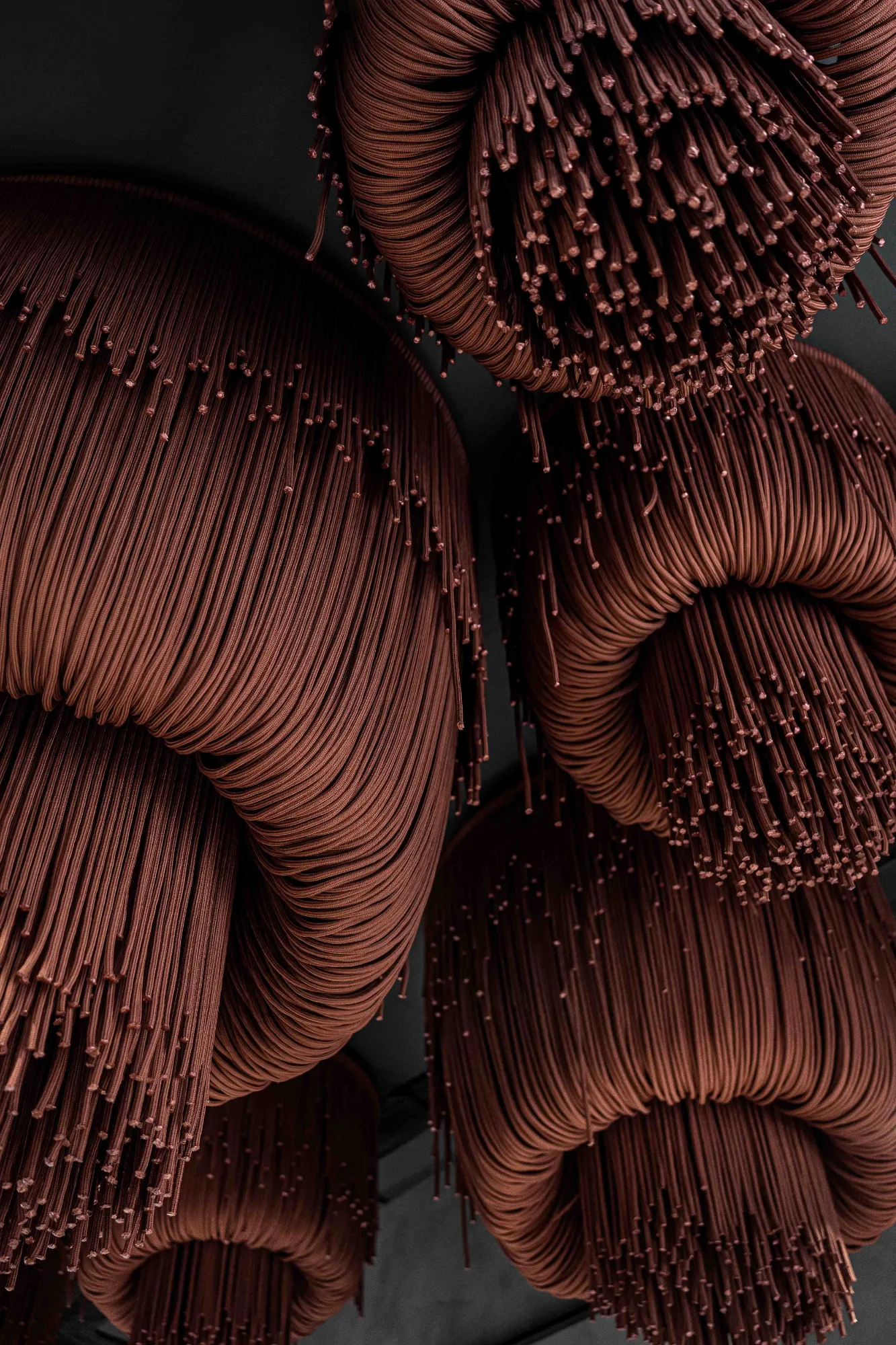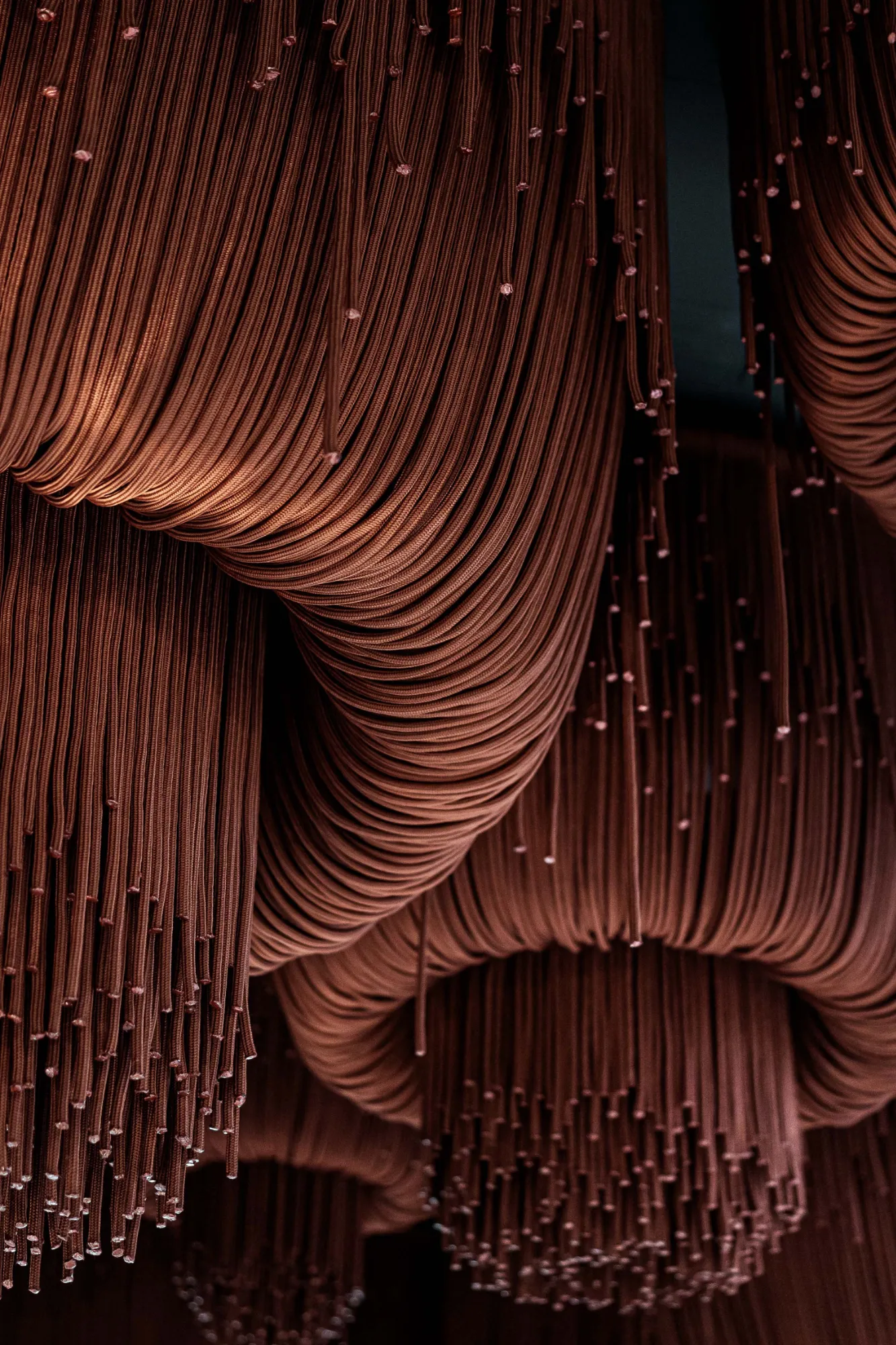 Ми сконцентрували увагу на одному сміливому елементі: інсталяціях з тисяч метрів канату, які ніби зависли у повітрі. Їхні форми й кольори викликають спогади — про квіти, які десь бачили, але ніколи не тримали в руках.