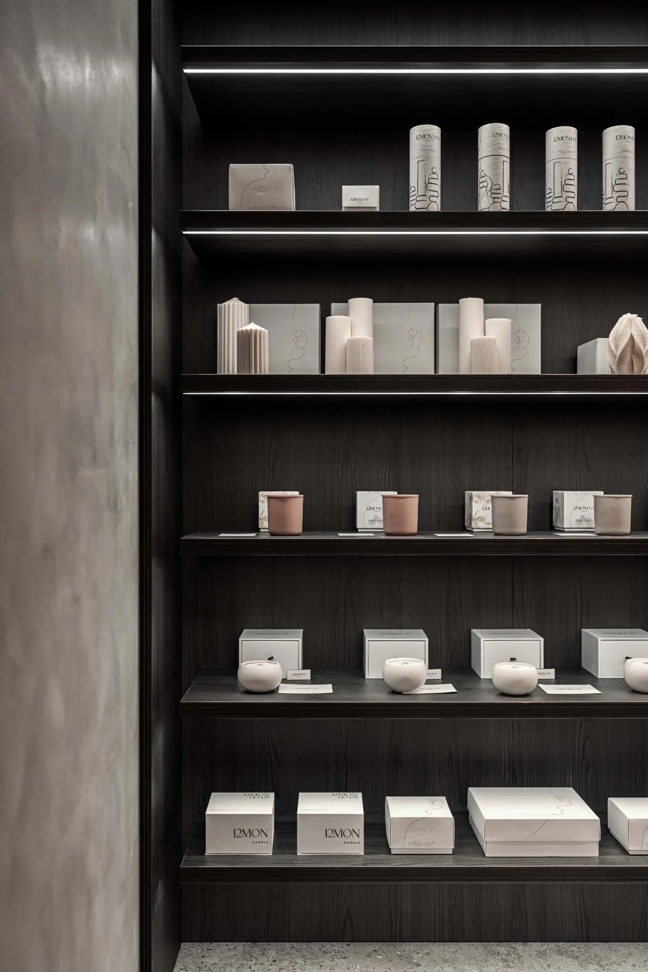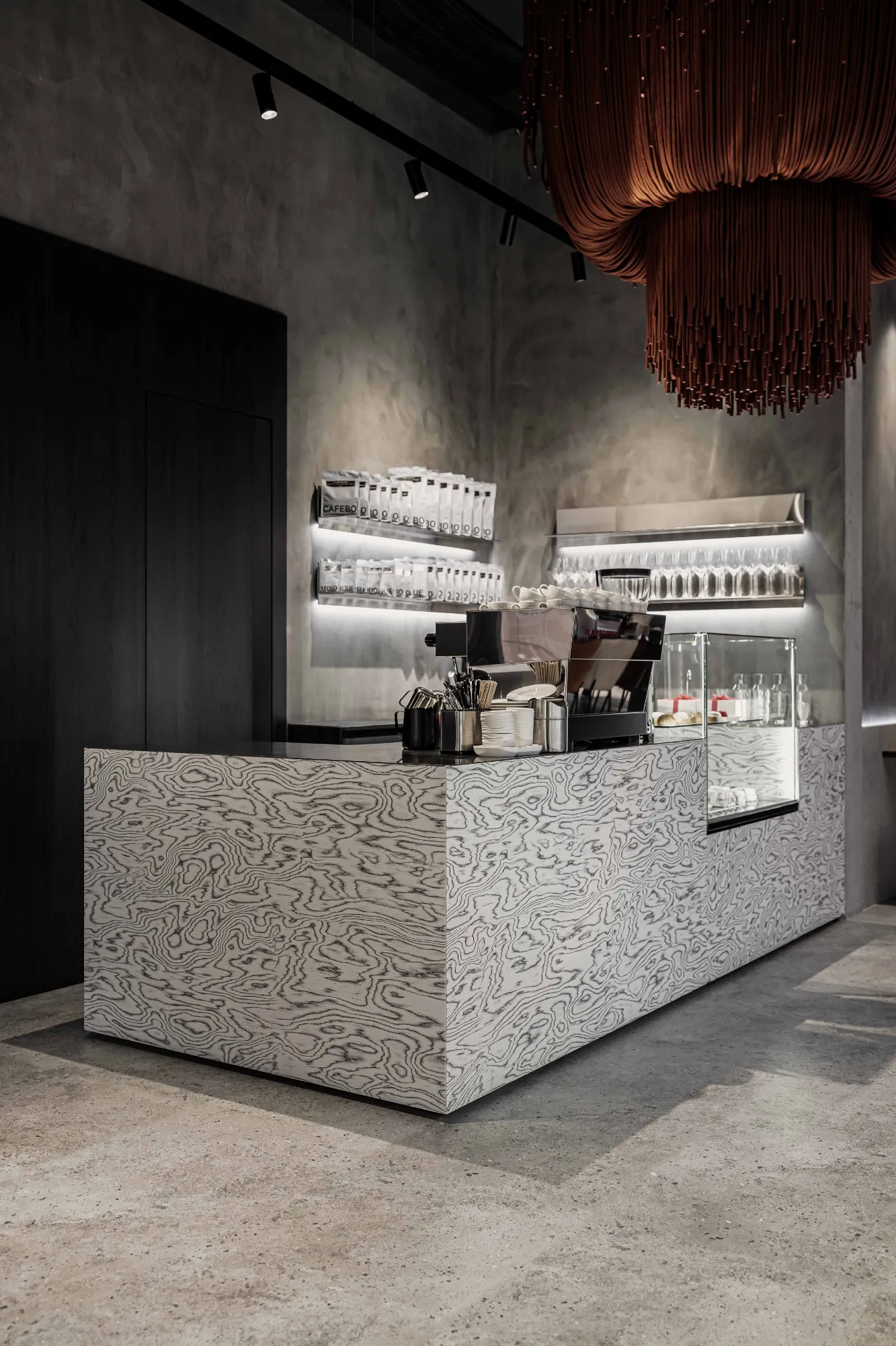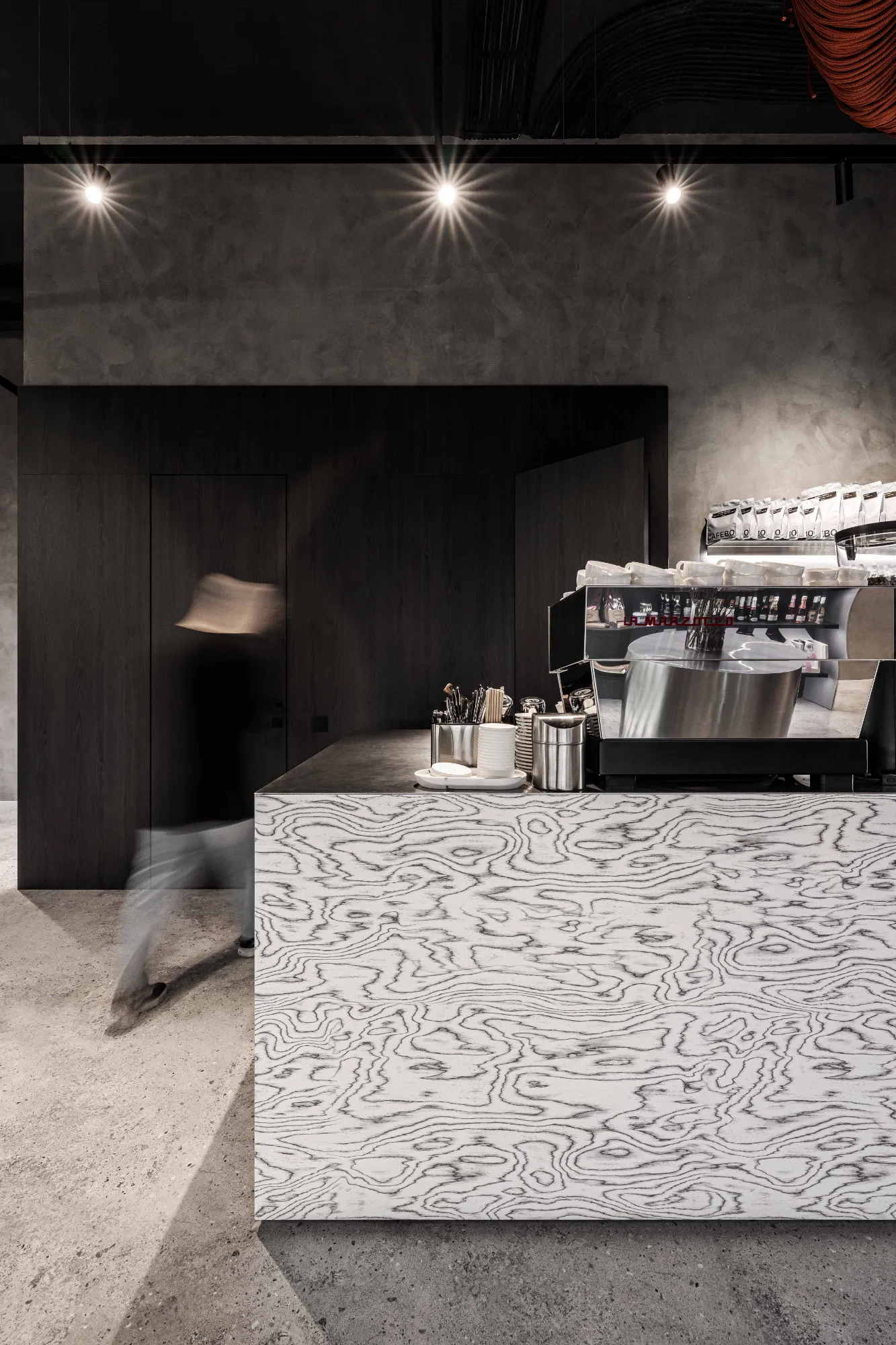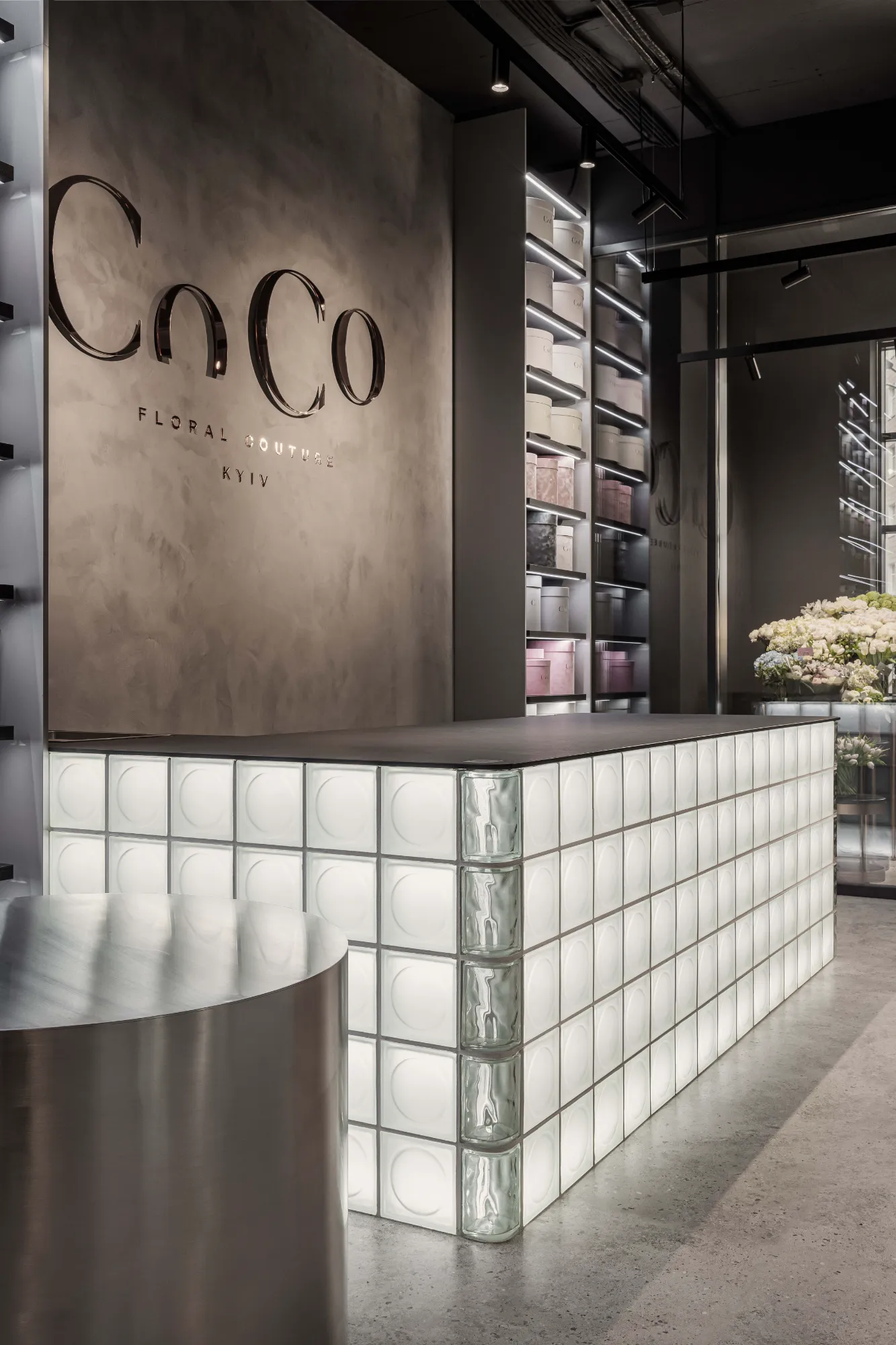 Контрасти — основа дизайну. Холодна сталь, скляні блоки, квіткові візерунки на стінах та бетонна підлога врівноважують м’якість і драму. У цьому просторі квіти не головні герої — вони частина великої постановки, що кожного разу розігрується заново.