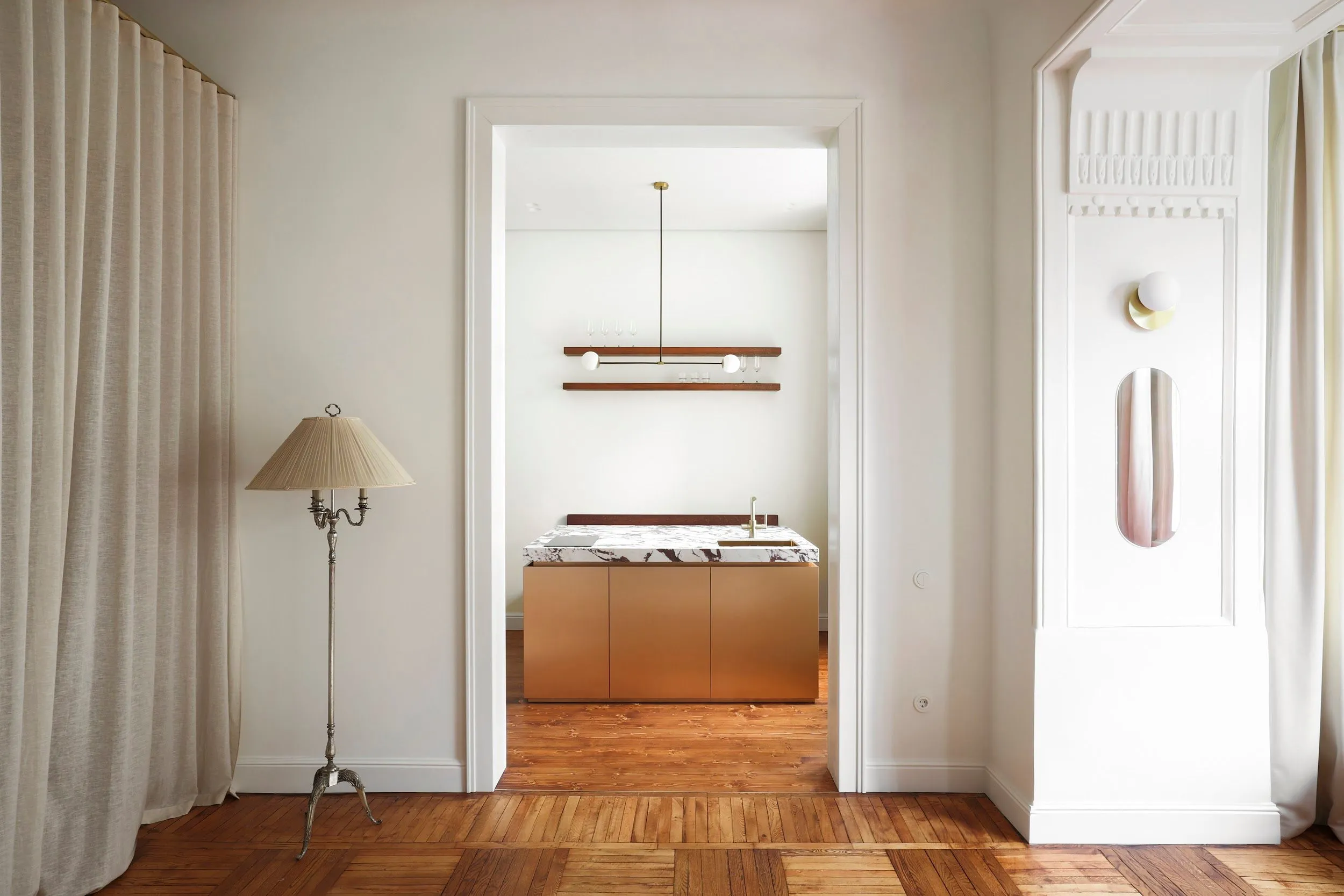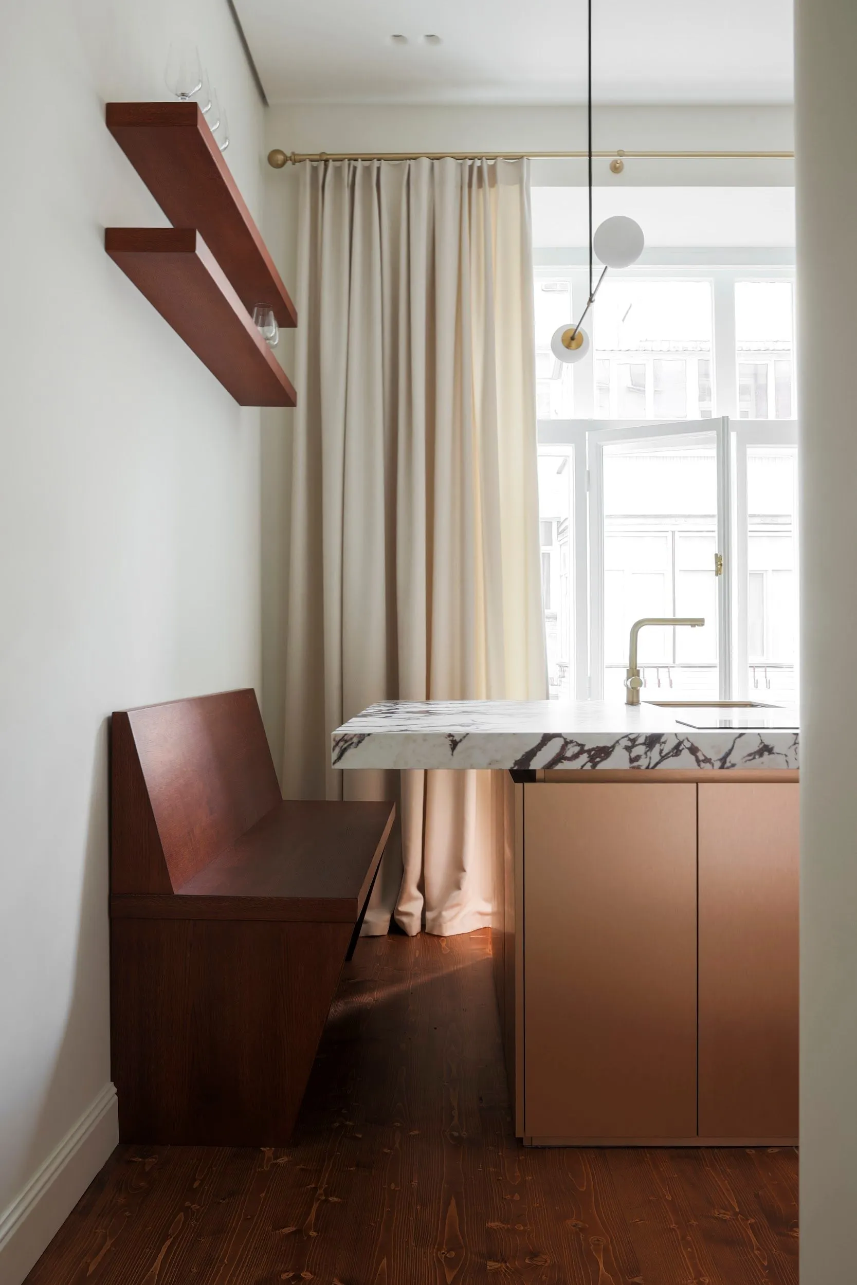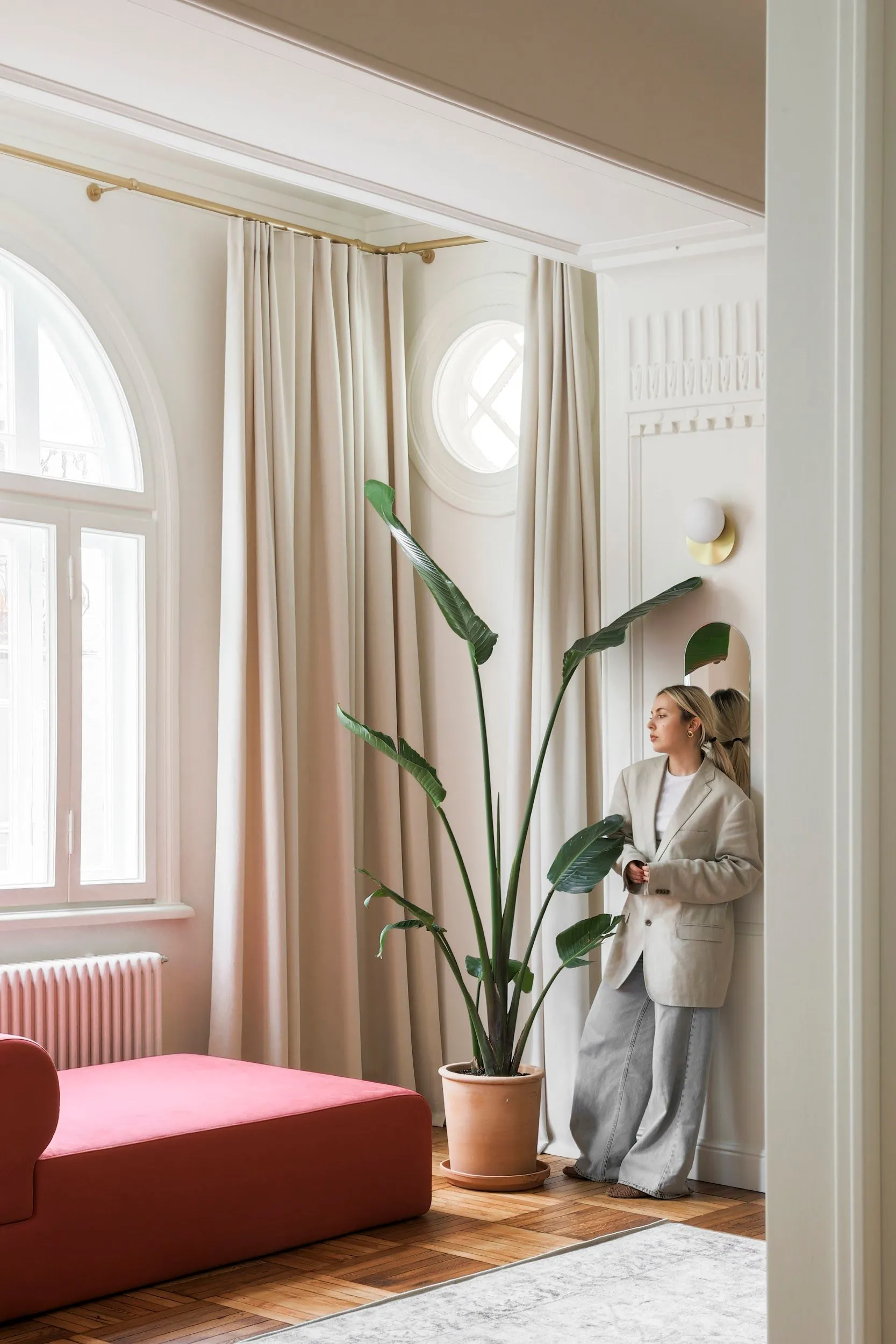 Складні арочні відновлені вікна, реставрований паркет з міксу порід деревини, рослинні орнаменти на гіпсових елементах стелі - усе це автентичні коди місця, які створили особливу атмосферу всередині головного обʼєму.