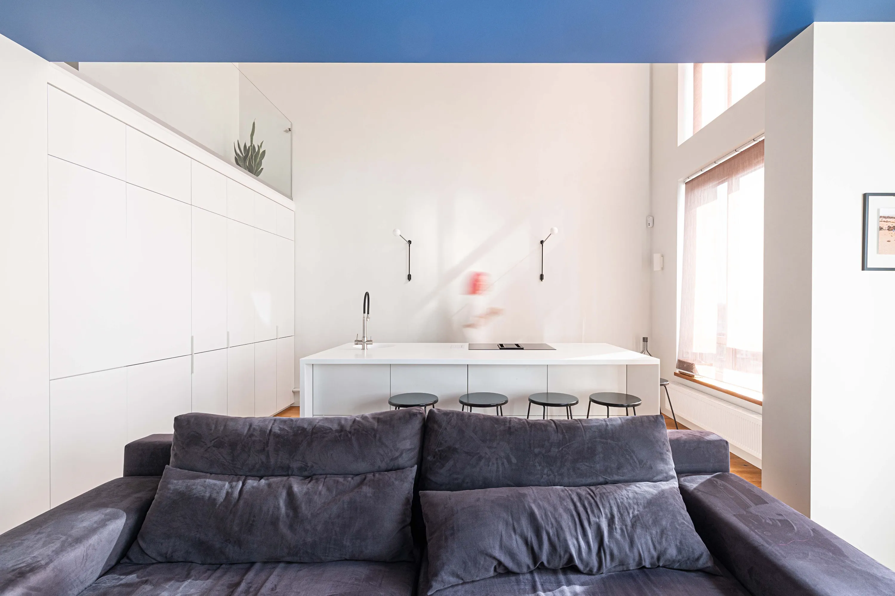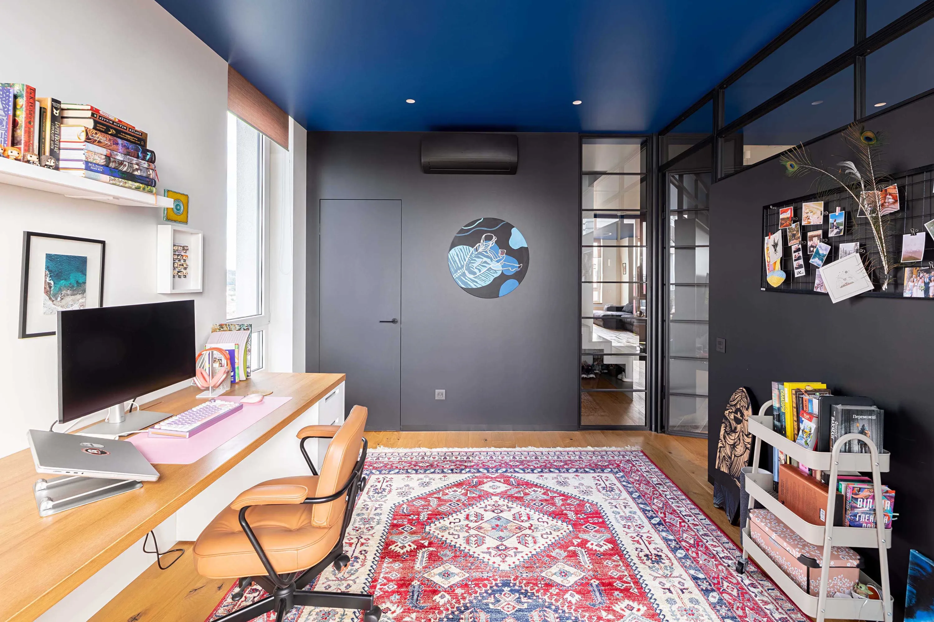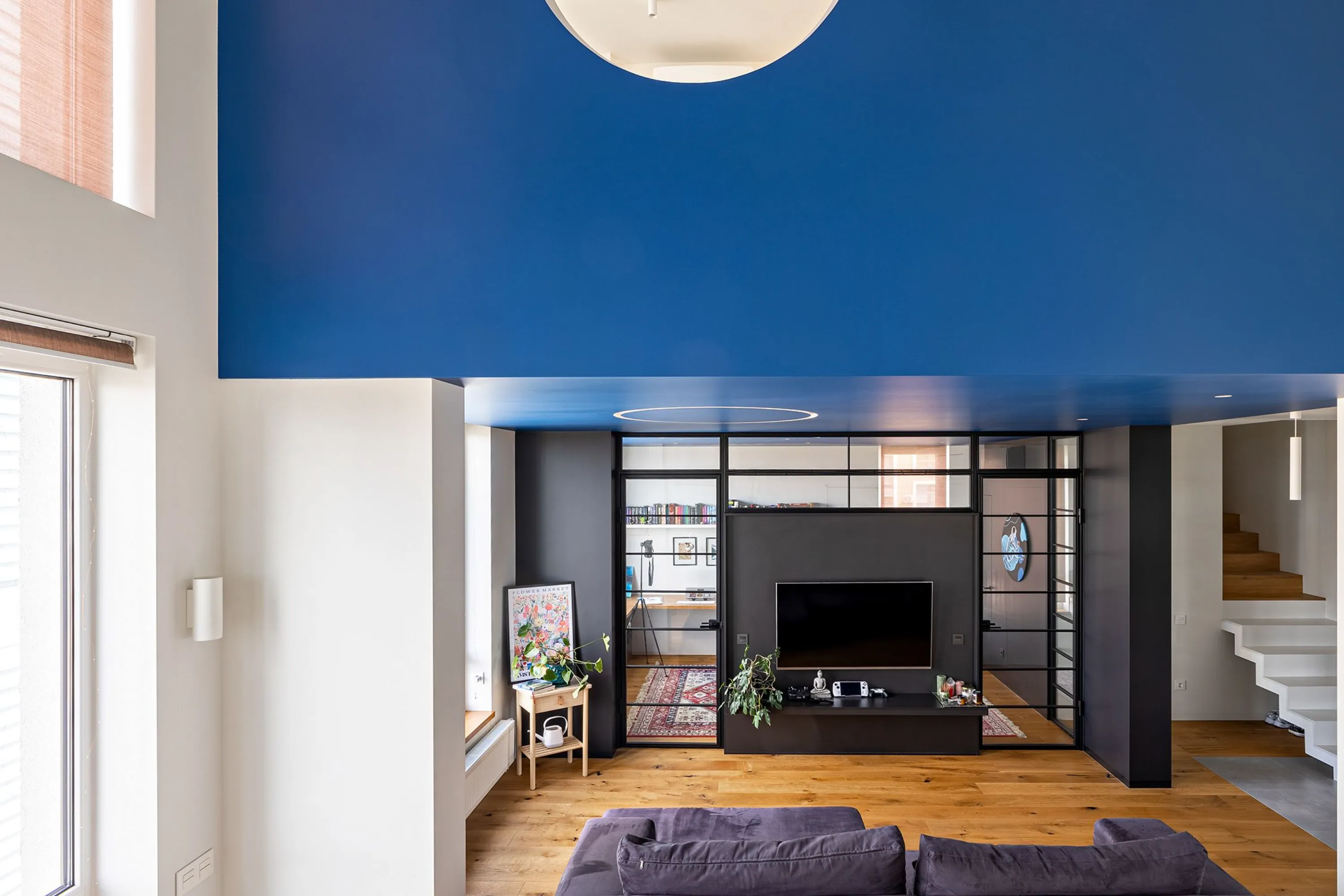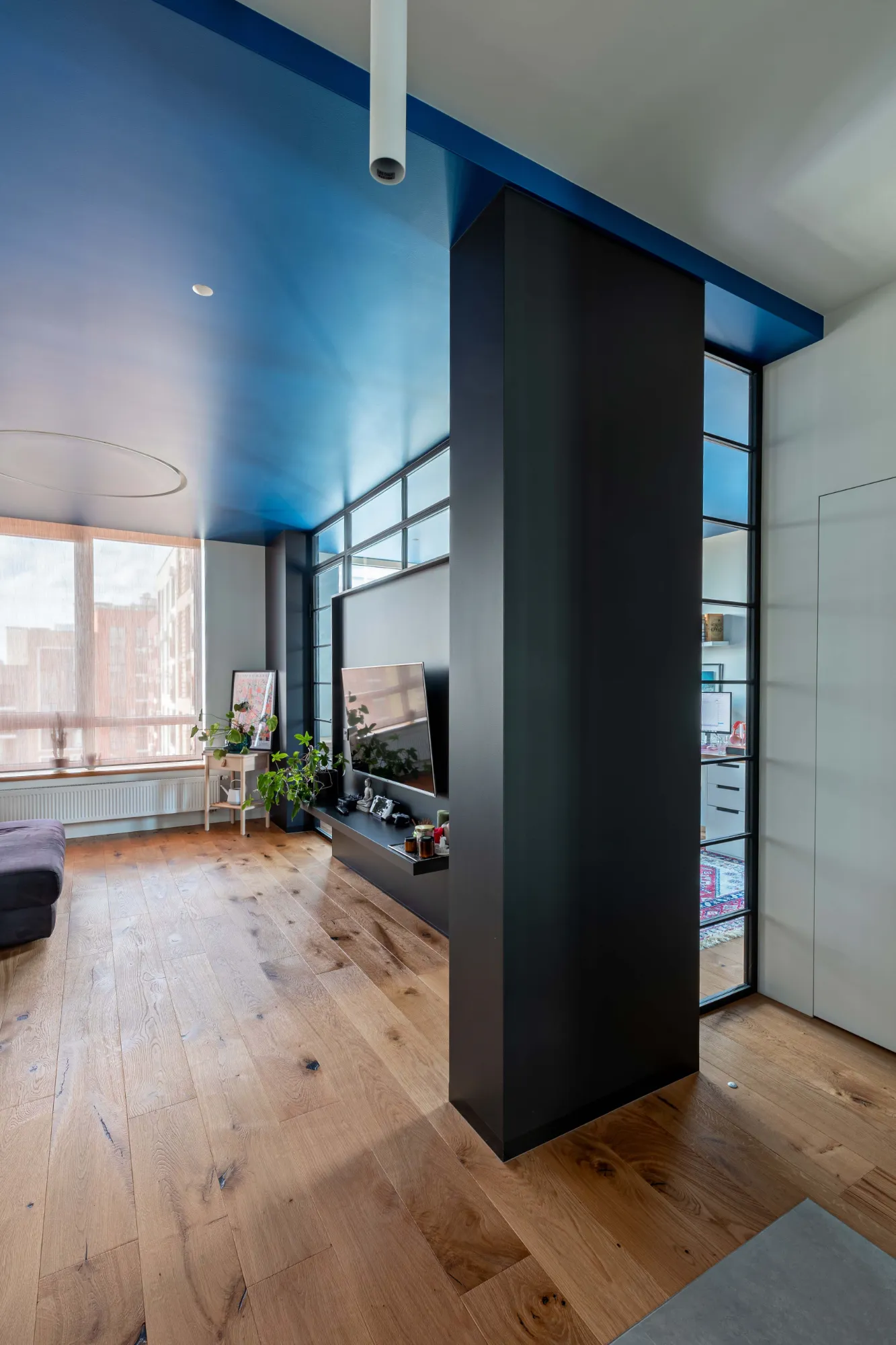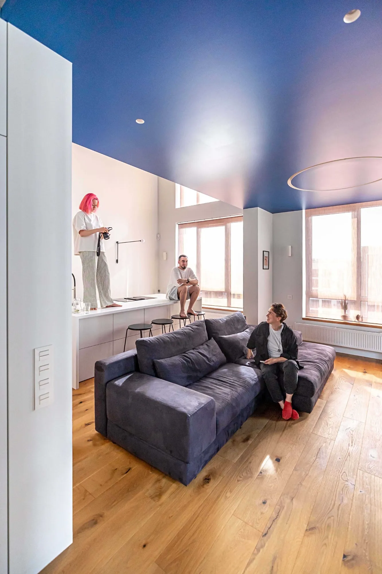 Варто зауважити, що попри основну діяльність, замовники ведуть тревел-блог, тому важливо було створити достатньо різноманітний простір з різними фонами для відео. Спостерігаючи за розповідями замовників в Instagram, мій улюблений ракурс – це кругле вікно в спальні, яка має стіни теплого кольору. За вікном друге світло кухні має холодний рефлекс від синьої оболонки куба, створюючи дуже об'ємний та загадковий ефект.