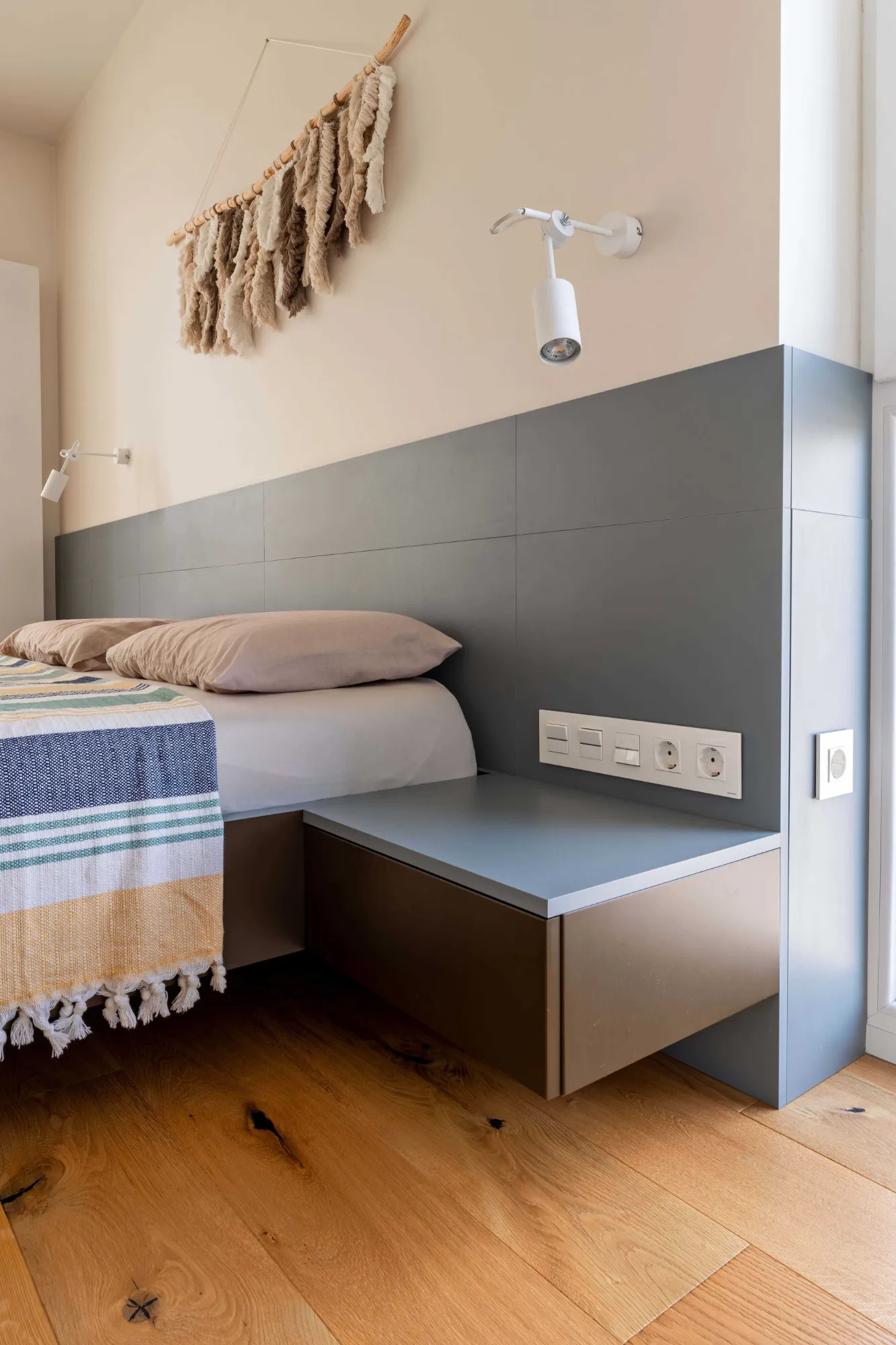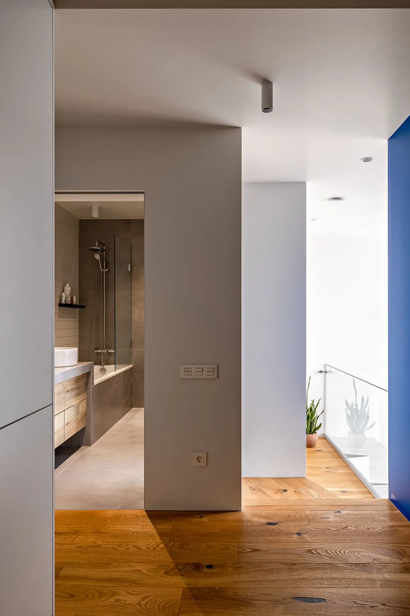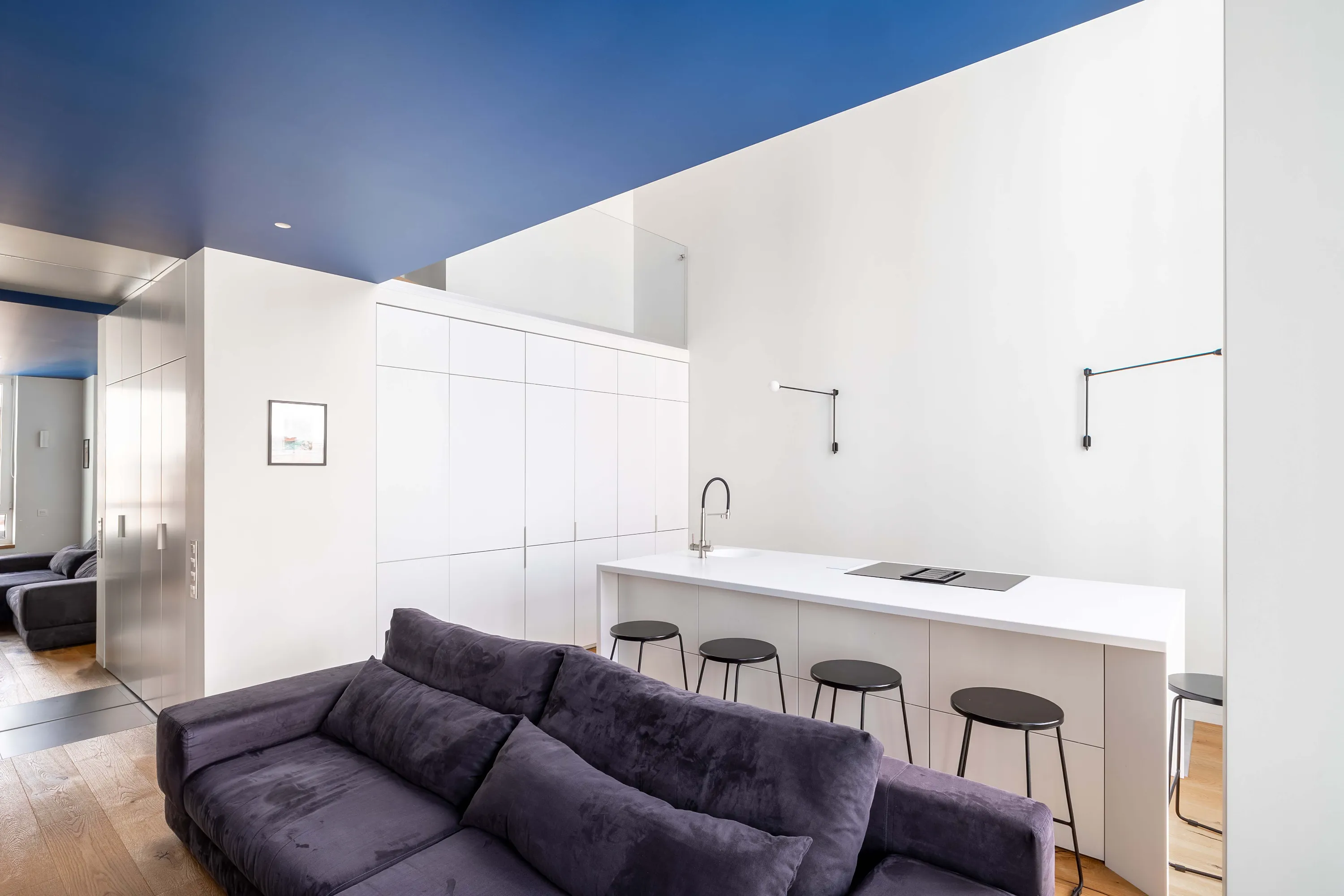 Оскільки всі основні вікна орієнтовані на захід, нас неминуче чекав перегрів. Тому, крім системи кондиціонування, був обраний і візуальний ефект синього куба, який огортає дві зони спалень. Вони, своєю чергою, є теплими та максимально затишними.