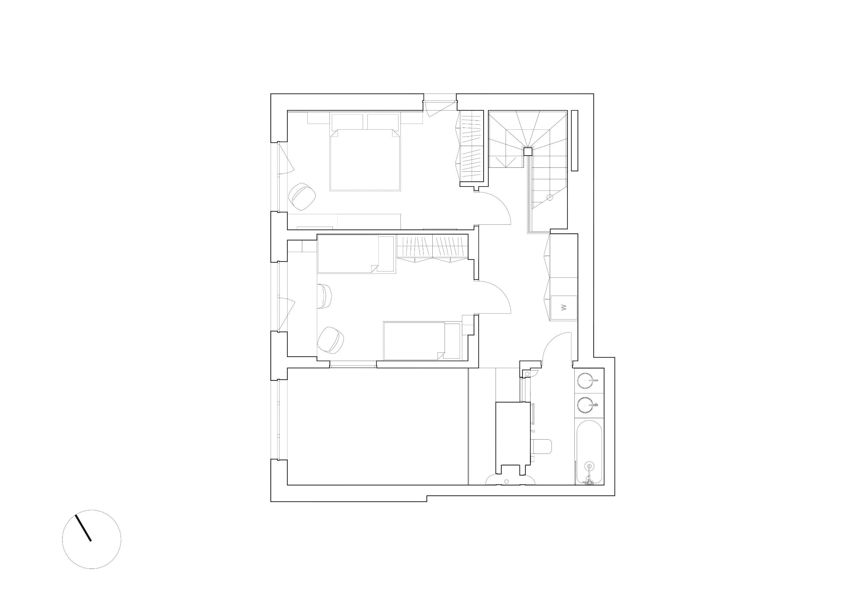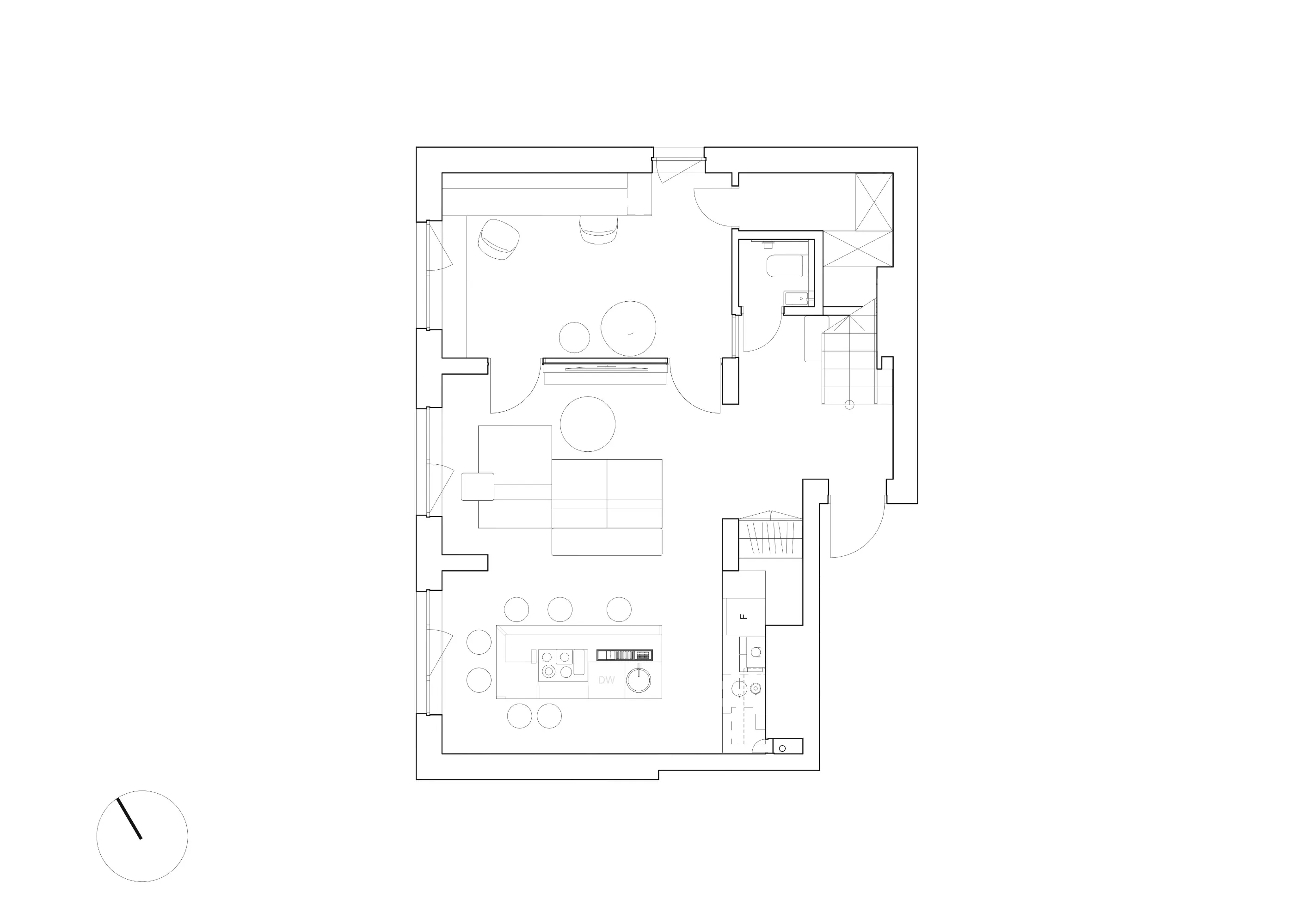 В оригінальному плануванні вхідний хол був непристойно малим, тому перші п’ять сходинок відрізняються білим кольором, щоб окреслити візуальну квадратність передпокою. Щоб досягти цього планування, довелося демонтувати всі перегородки і навіть частину перекриття.