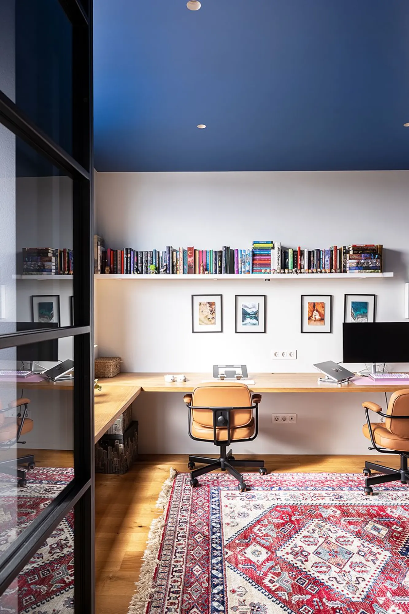 Однією з ідей для житла на 13-14 поверхах було створити балкон з краєвидом, хоч і інтерʼєрний, а не класичний. Замовники – це пара, яка працює з дому не через COVID-19, а через свої побажання такого способу життя. Відповідно, кабінет не міг бути залишковим чи додатковим. Ця кімната добре поєднується з вітальнею як візуально, так і функціонально. На практиці двоє дверей активно використовуються, що не може не тішити нас як проєктантів.