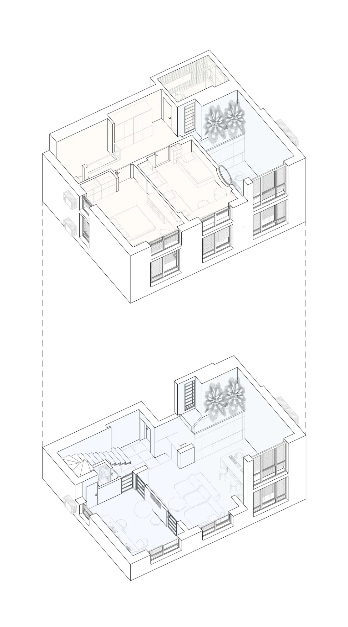 Проєкт дворівневої квартири практично в серці міста Львова. Метою було об'єднати загальні простори двох поверхів, що, за словами замовників, забезпечило дуже добрий звʼязок для комунікації. Коли хтось на другому поверсі легко може крикнути через балкон на кухню внизу. А також я не могла змиритися з темним коридором на другому поверсі – це було дуже депресивне явище, і ванна кімната в такому житлі потребувала природного світла.