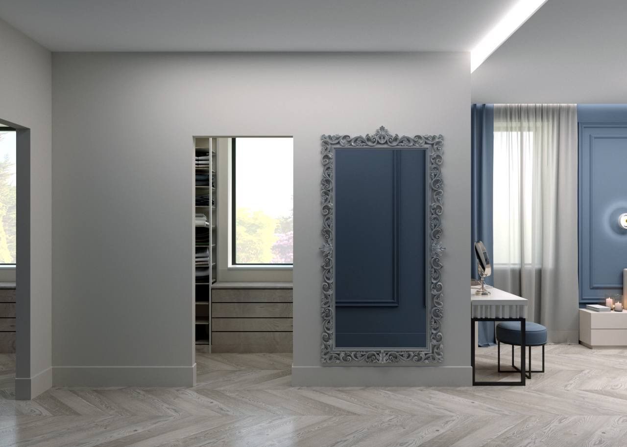 Спальня поєднує благородний кавовий колір із глибоким синім. Молдінги на стінах підкреслюють архітектурну складність простору, надаючи йому вишуканості, ритму й фактури. Цей інтер’єр заспокоює, огортає та створює відчуття захищеності.