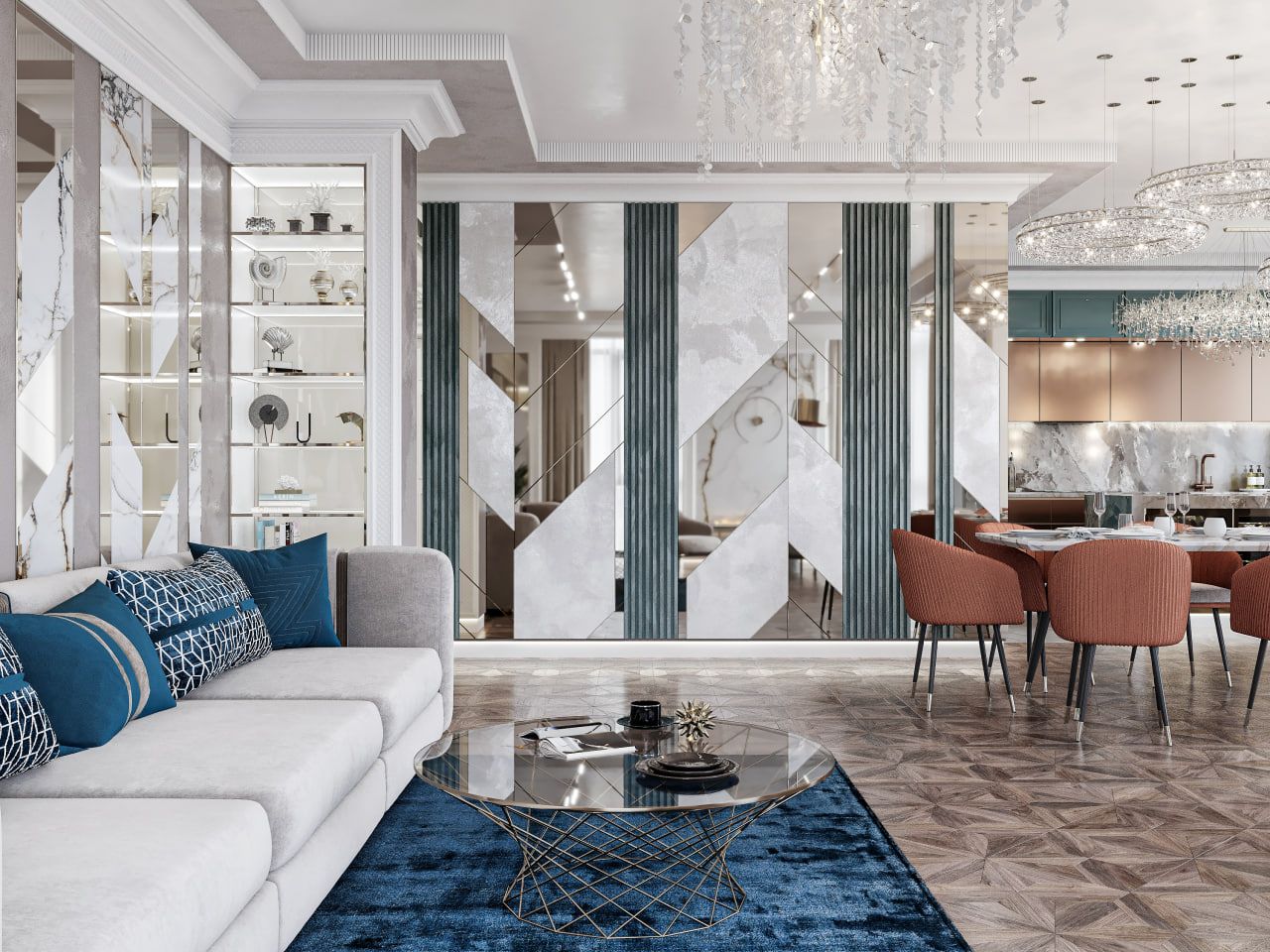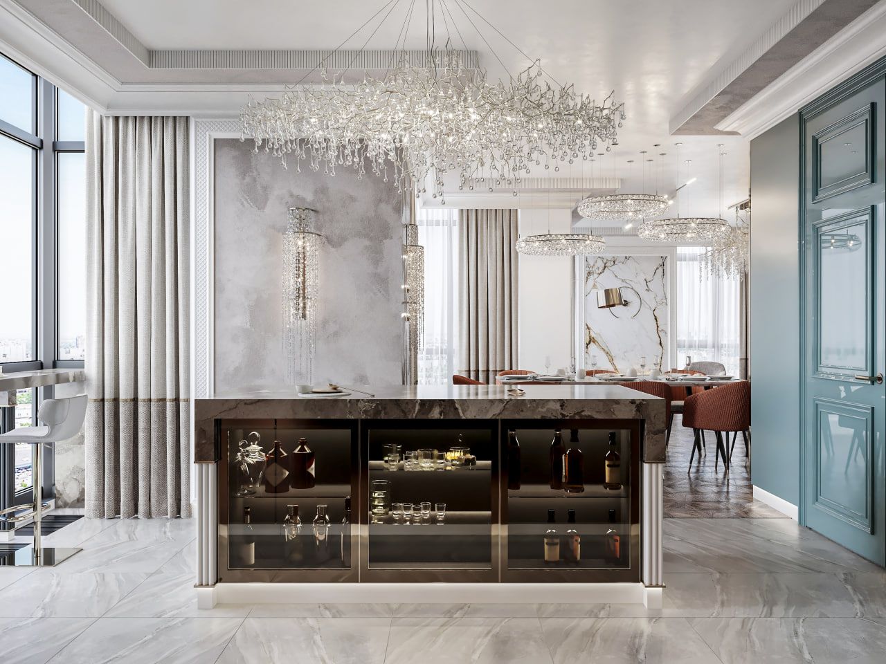 Особливістю проєкту є відкрите планування, сміливі кольори, унікальні матеріали, арт-акценти, що відсилають до класичних скульптур. Важливо було створити простір, який одночасно затишний для життя, вражаючий для гостей і практичний для щоденного користування.
