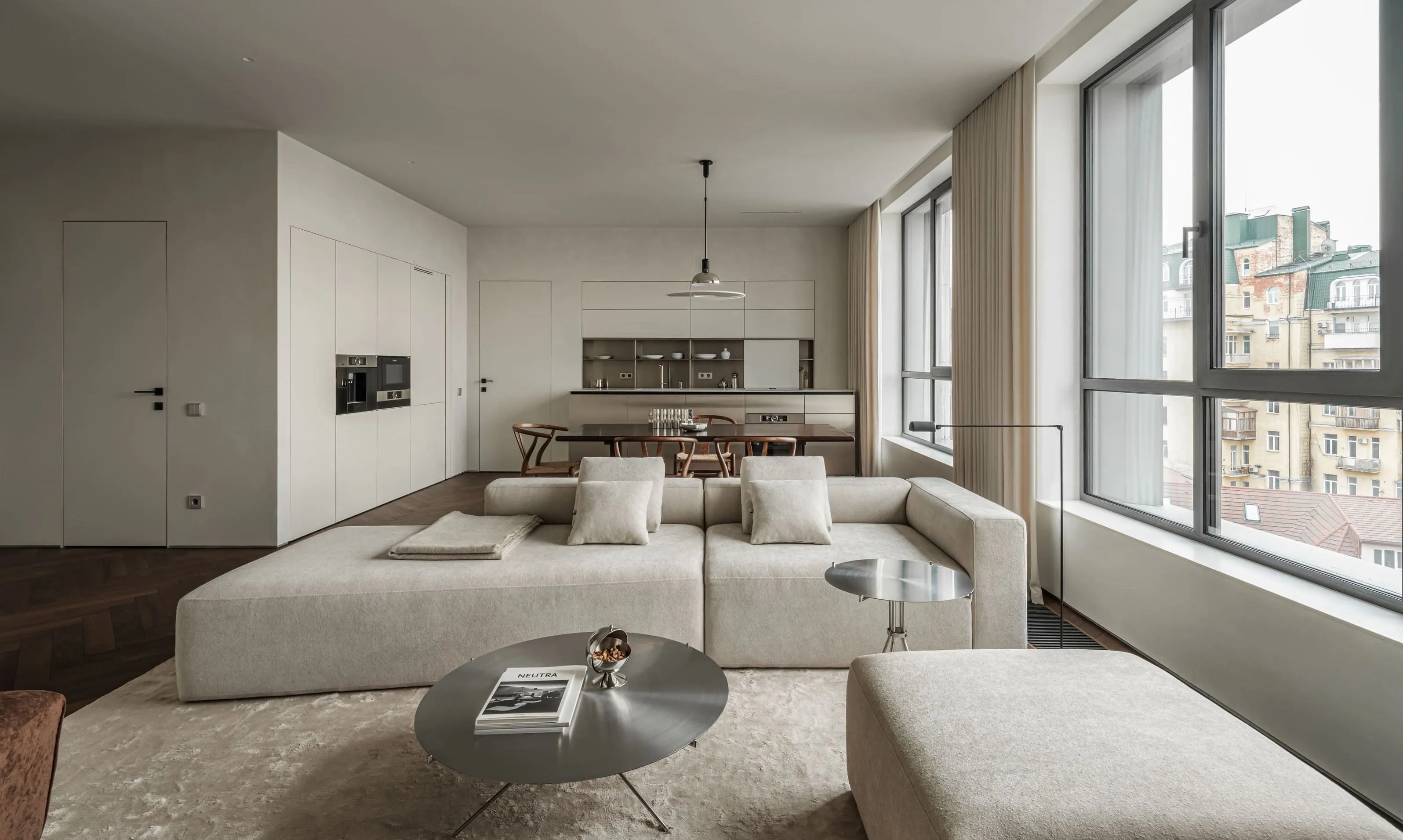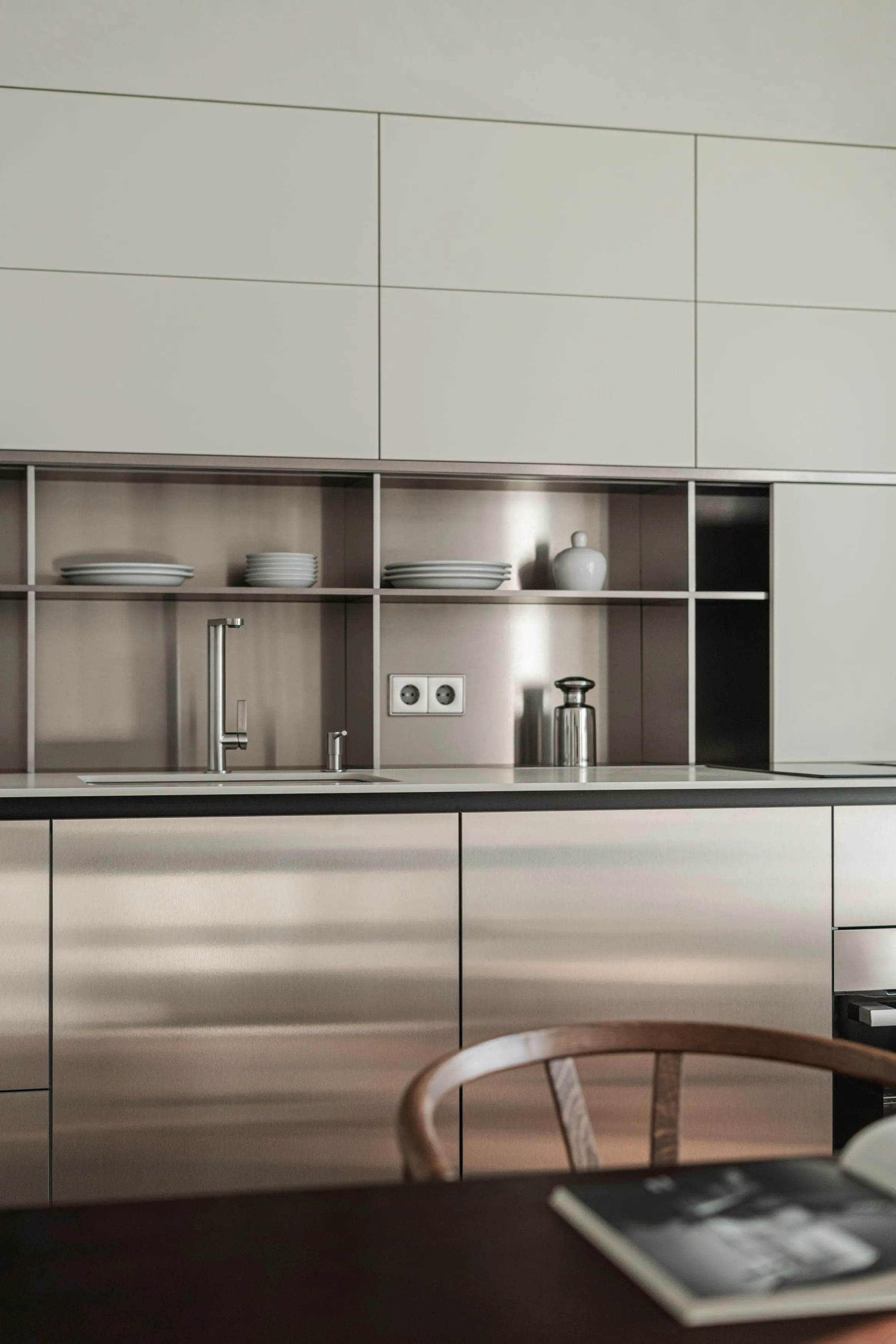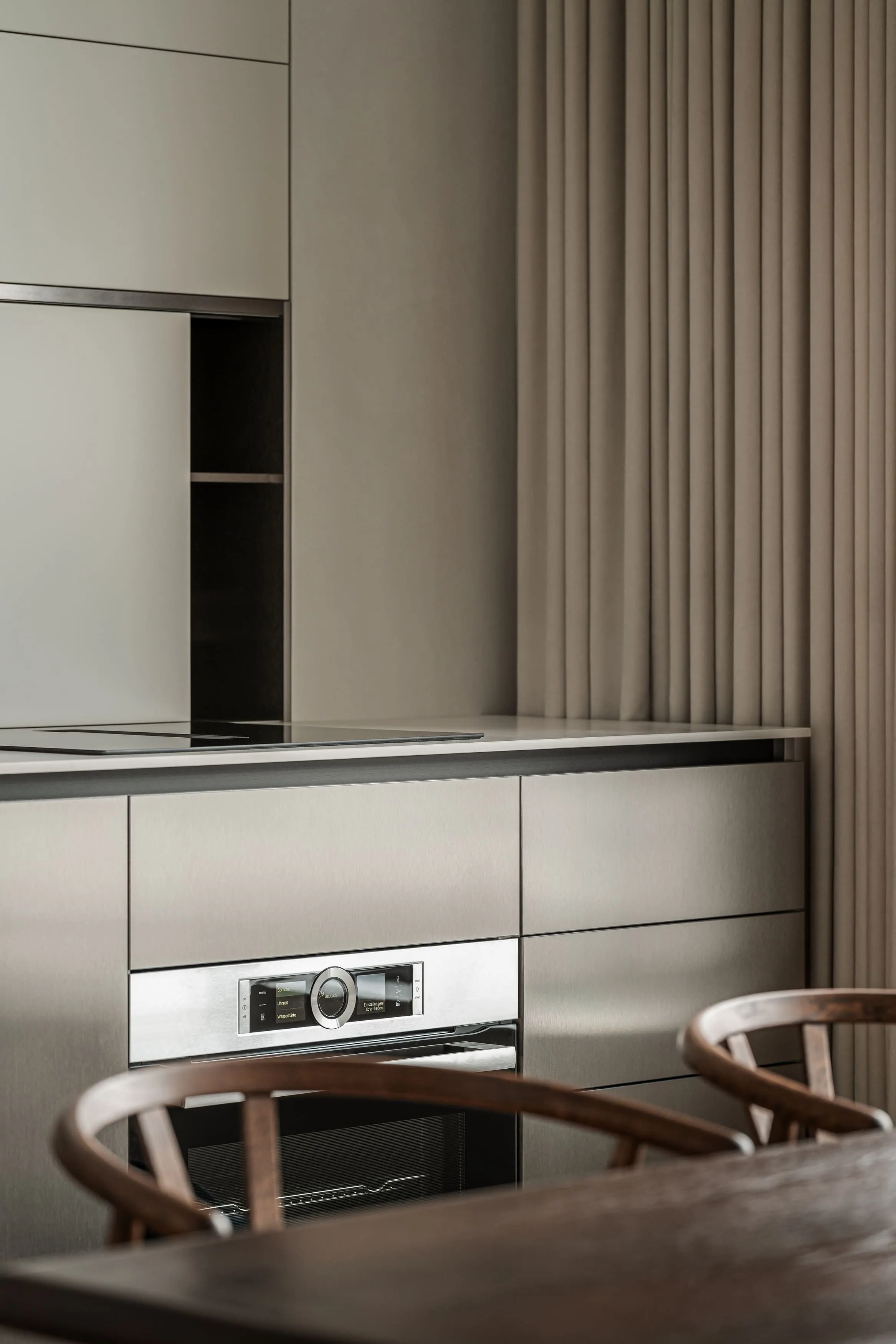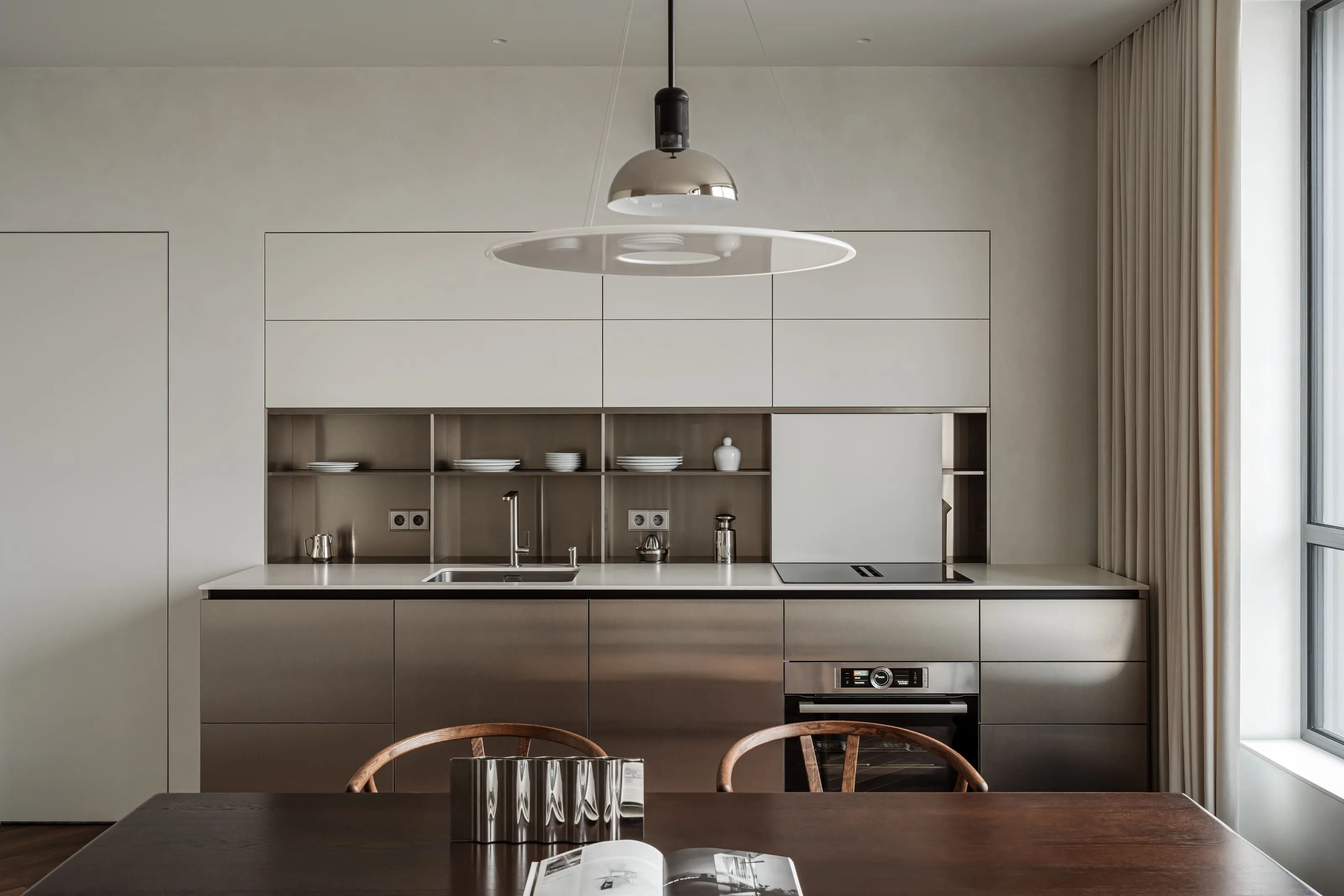 В інтер’єрі відчувається яскраво виражений скандинавський вплив, що проявляється в стільцях Carl Hansen і дерев’яному паркеті. Але ми хотіли поєднати його з українськими промисловими меблями та елегантним італійським освітленням. Ось так простір об’єднався з журнальними столиками DIZA Collective, підвісним світильником Flos та багатьма іншими ретельно підібраними деталями. Зважаючи на обмежений простір для великої кухні, ми вирішили збільшити глибину стільниці та включити сталеві полиці, щоб збільшити функціональність. Одним із наших улюблених рішень є вбудовані верхні шафи, плавно інтегровані в стіну для чистого, мінімалістичного вигляду.
