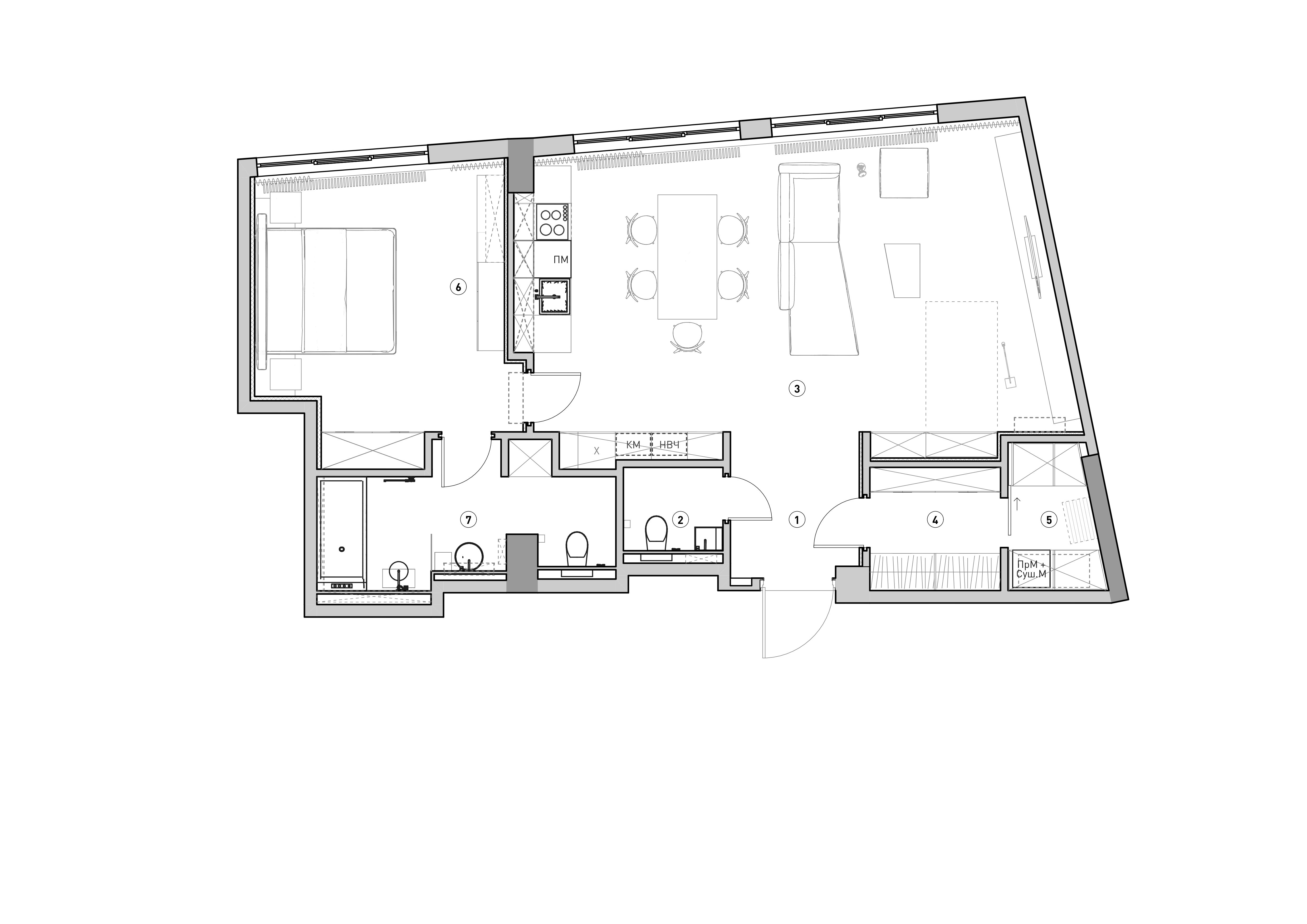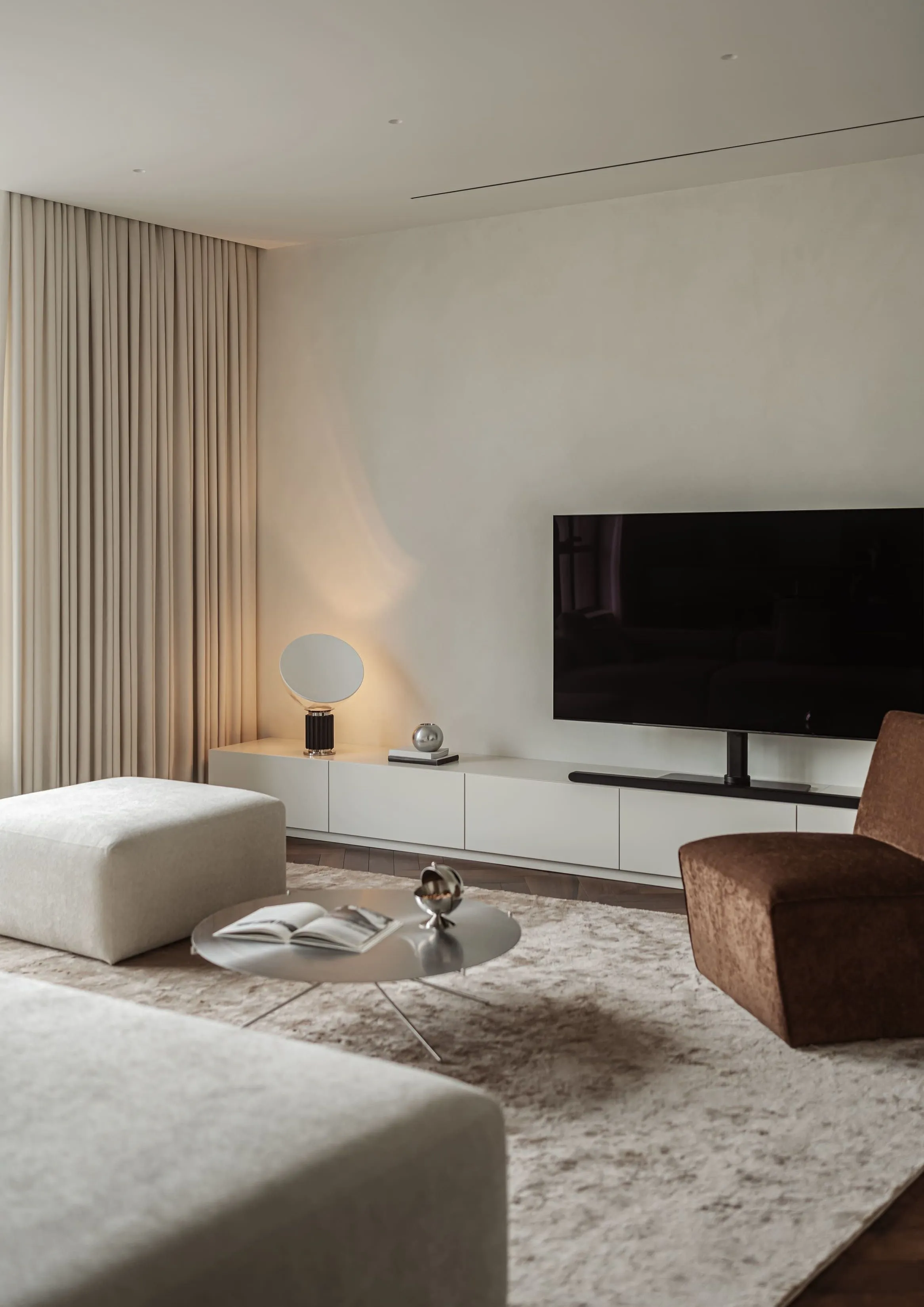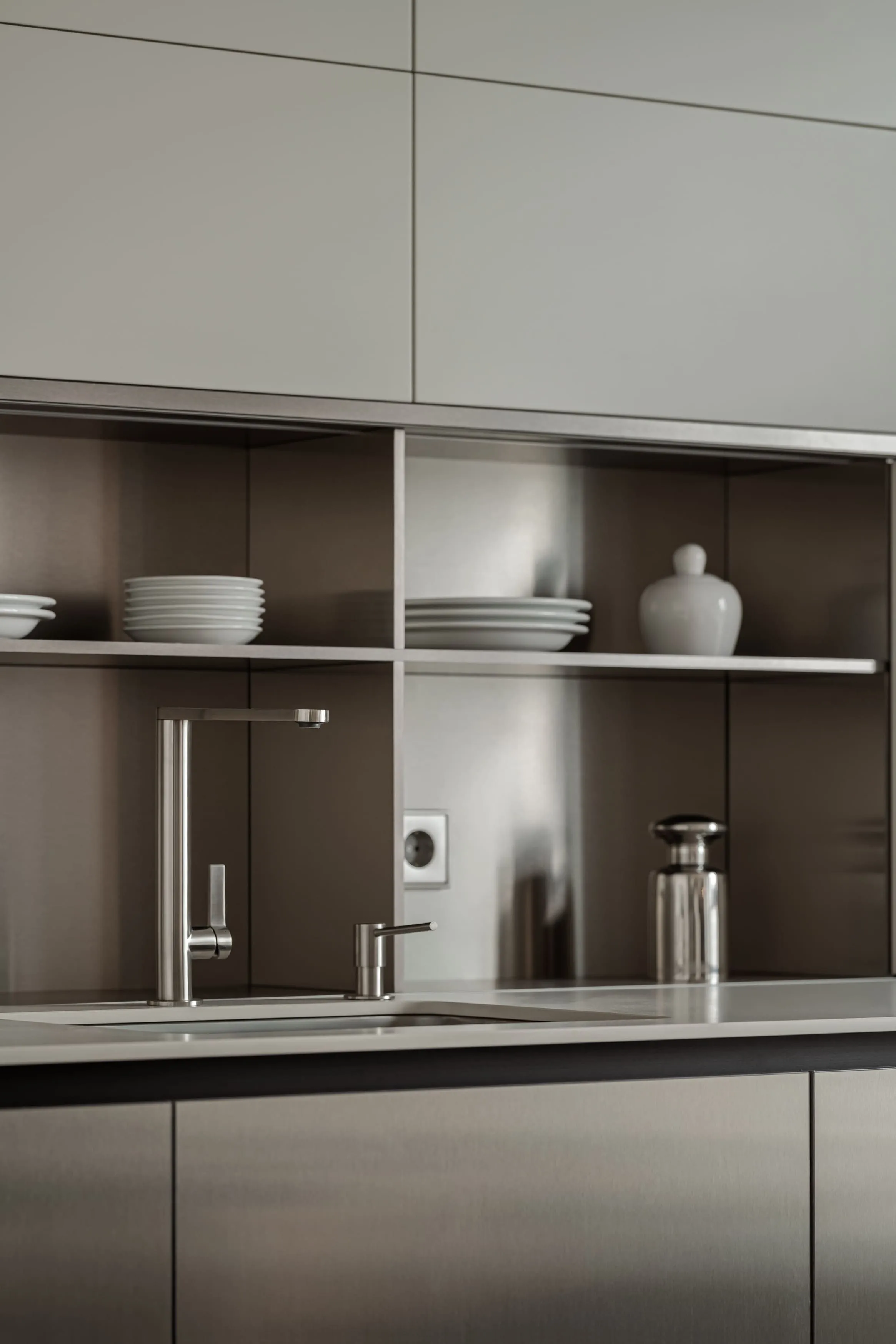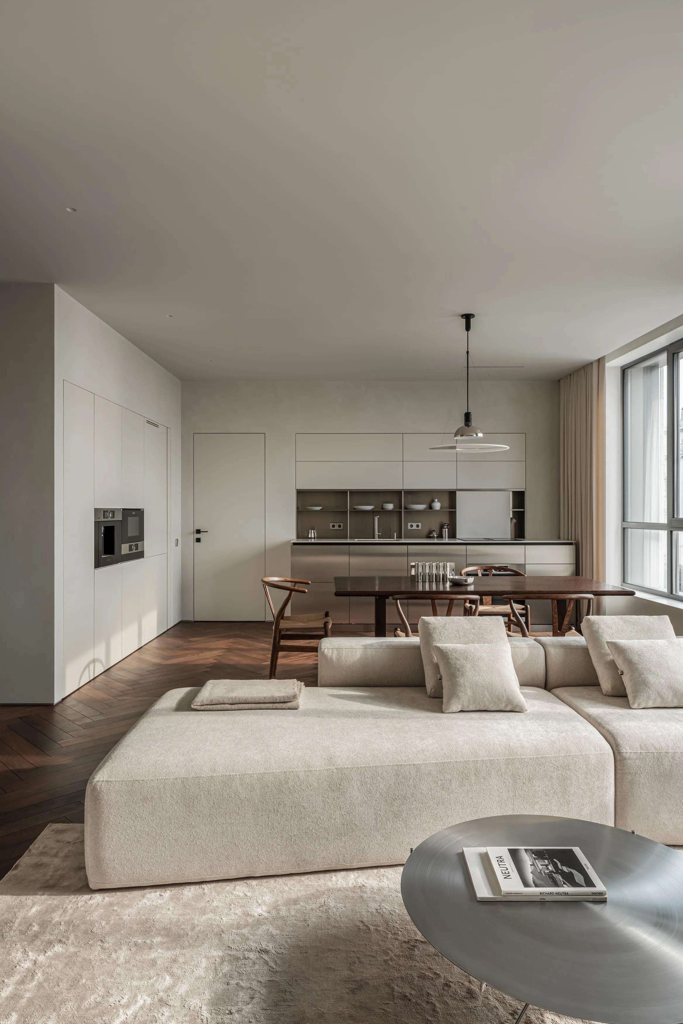 В інтер’єрі відчувається яскраво виражений скандинавський вплив, що проявляється в стільцях Carl Hansen і дерев’яному паркеті. Але ми хотіли поєднати його з українськими промисловими меблями та елегантним італійським освітленням. Ось так простір об’єднався з журнальними столиками DIZA Collective, підвісним світильником Flos та багатьма іншими ретельно підібраними деталями. Зважаючи на обмежений простір для великої кухні, ми вирішили збільшити глибину стільниці та включити сталеві полиці, щоб збільшити функціональність. Одним із наших улюблених рішень є вбудовані верхні шафи, плавно інтегровані в стіну для чистого, мінімалістичного вигляду.