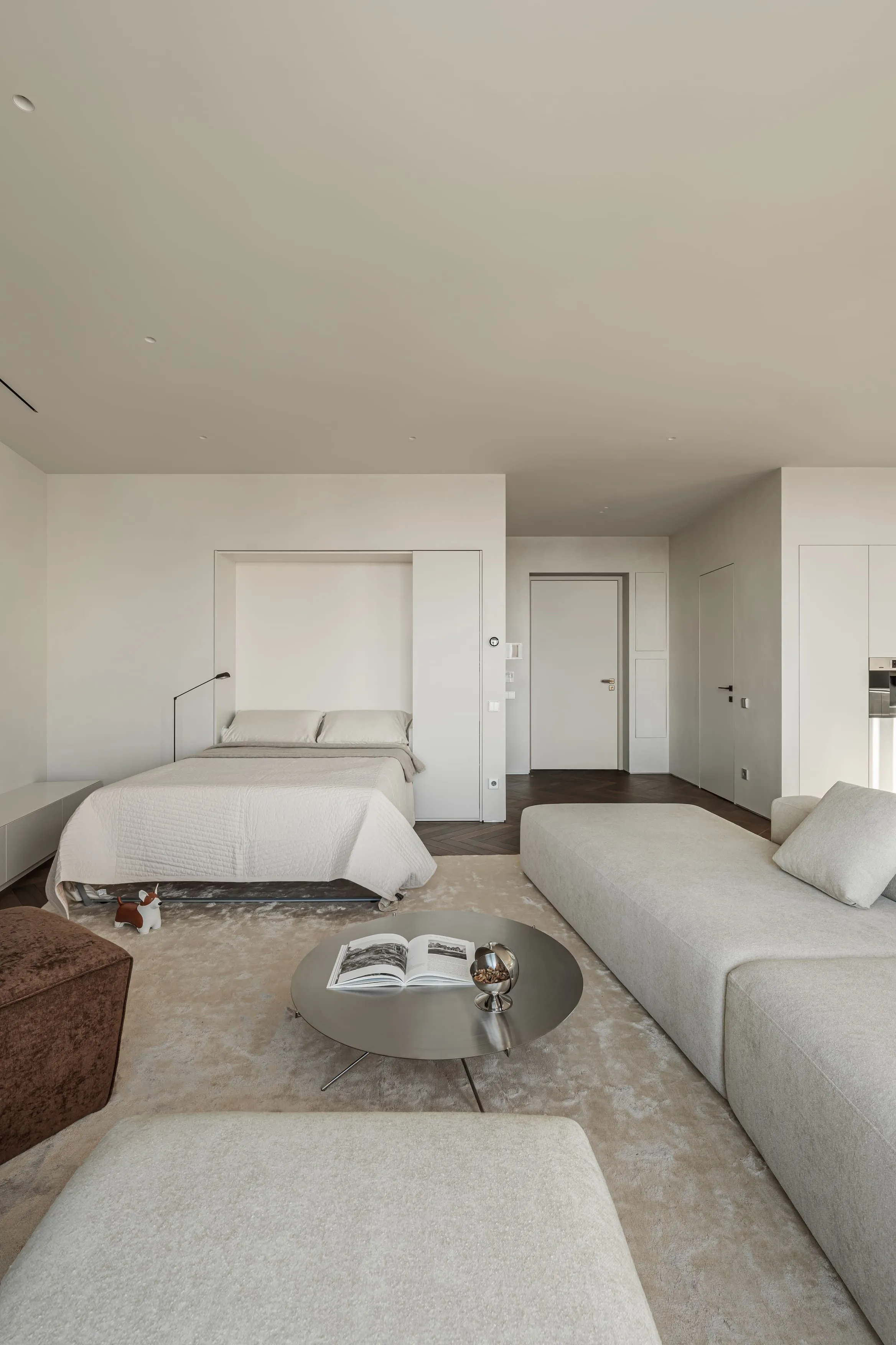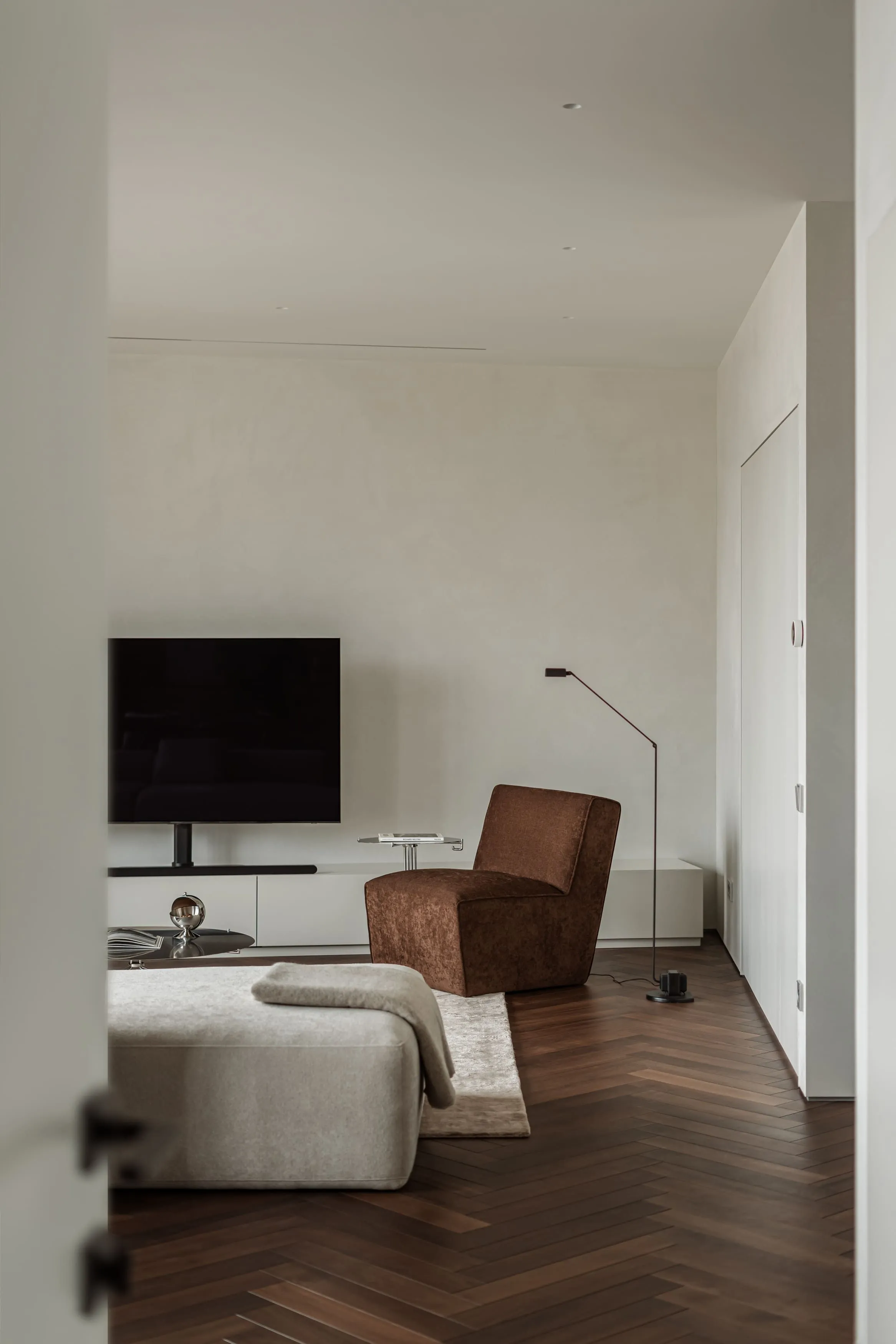 Кожна поверхня та матеріал гармоніюють з іншими, додаючи унікальні текстури та тонкі варіації тону, додаючи глибини та характеру простору. Наша улюблена лампа Taccia від Flos знайшла своє ідеальне місце тут, створюючи м’які округлі відблиски, які м’яко зігрівають нейтральні стіни та покращують атмосферу.