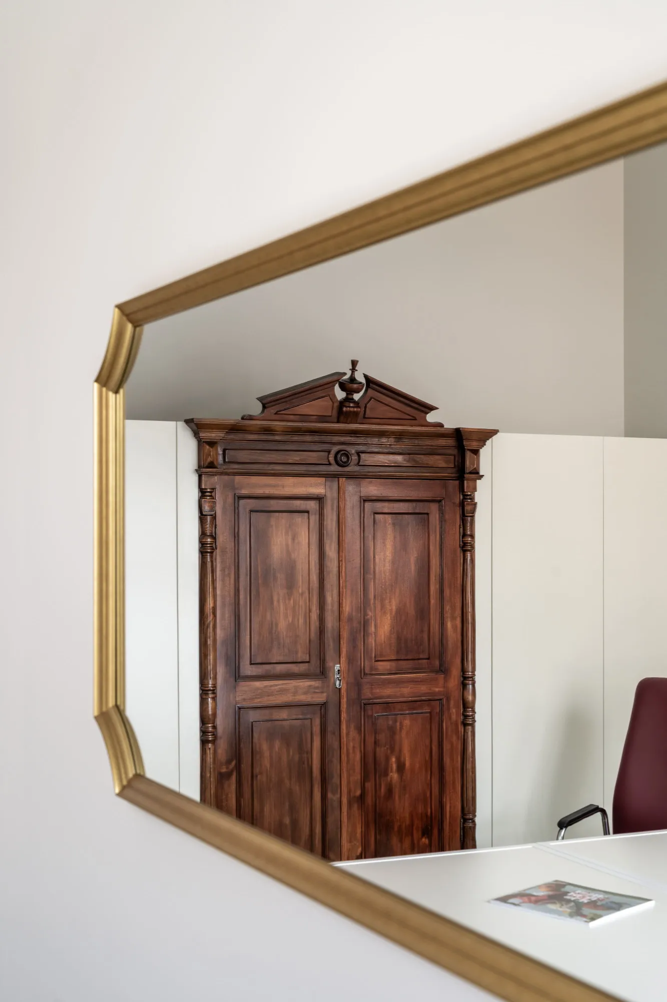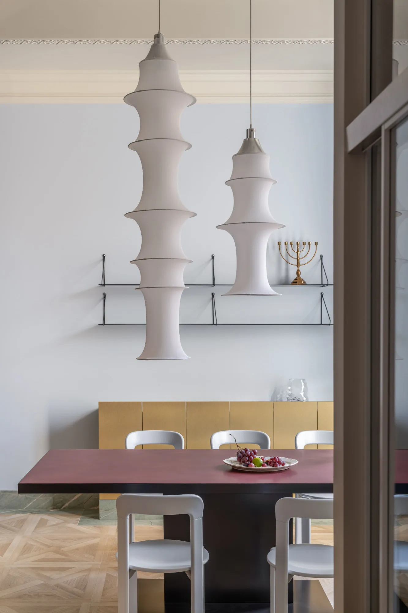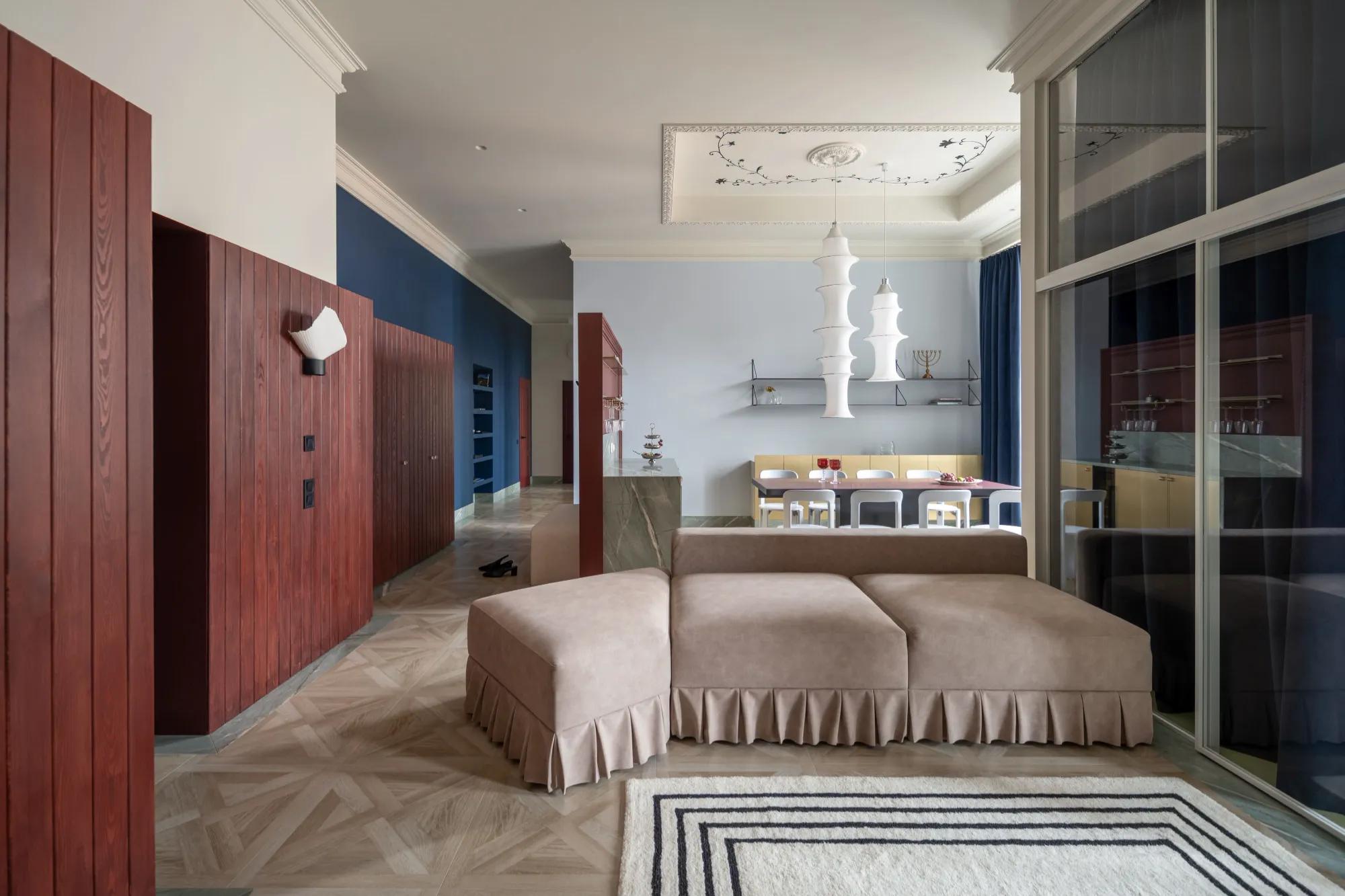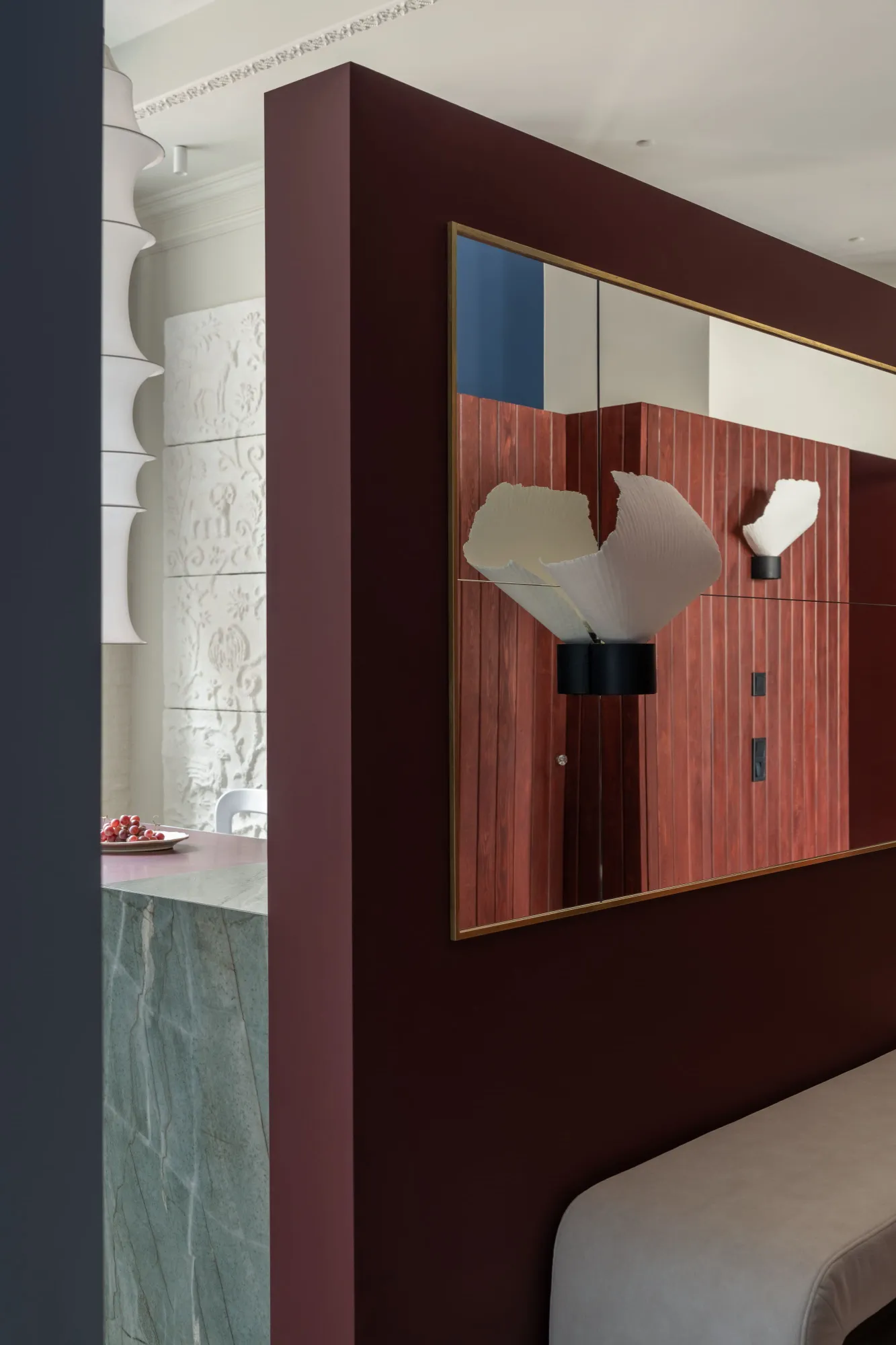Сталий підхід до дизайну — ключова цінність студії. Робота з речами, які вже мали життя, дозволяє створювати глибші, більш особисті простори. Насичені колірні контрасти — бордовий на дерев'яних панелях, евкаліптовий та яскраві сині відтінки — створюють візуально динамічне середовище, що поєднує комфорт із вишуканою елегантністю та зберігає зв'язок з історією місця.