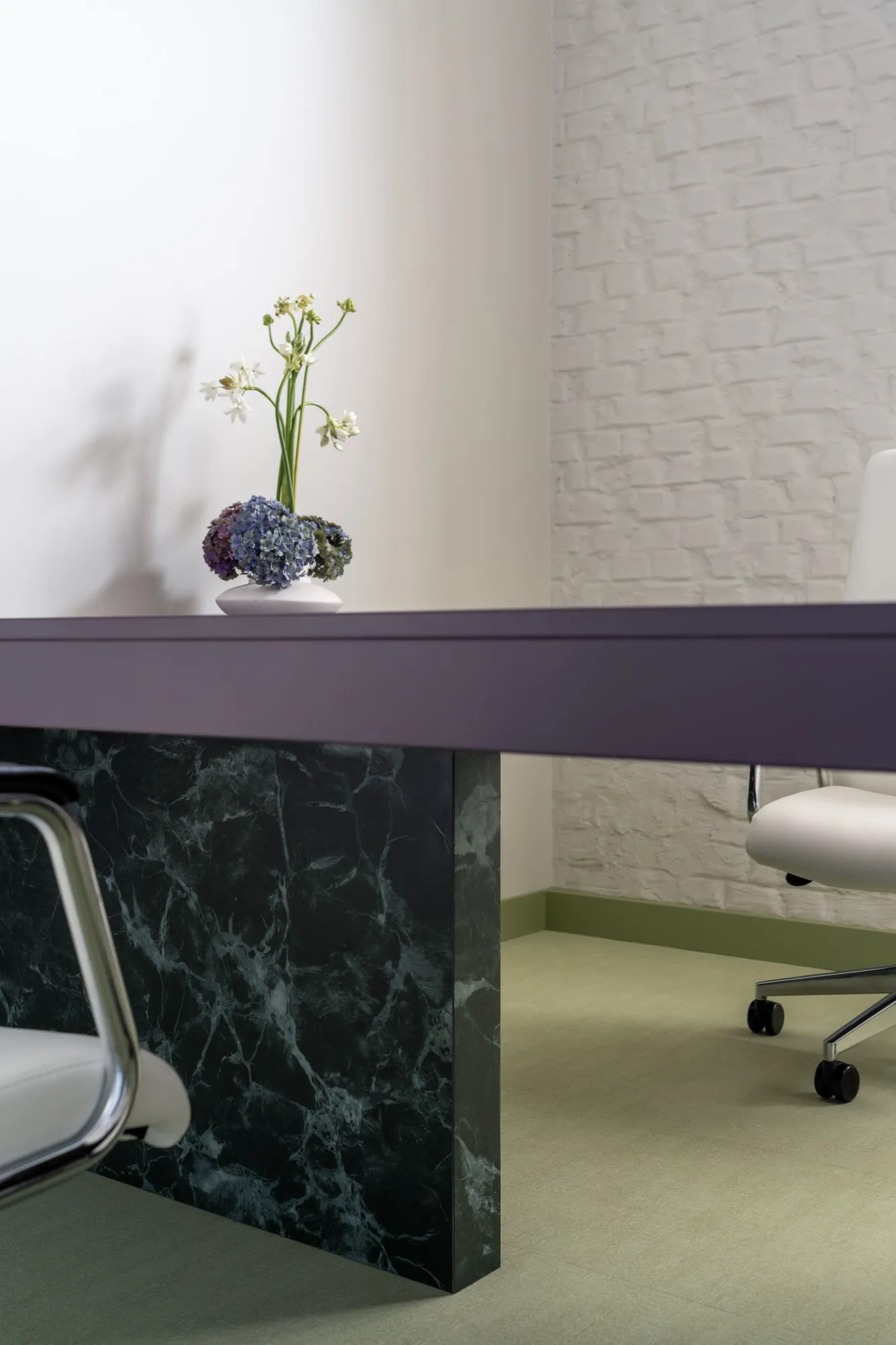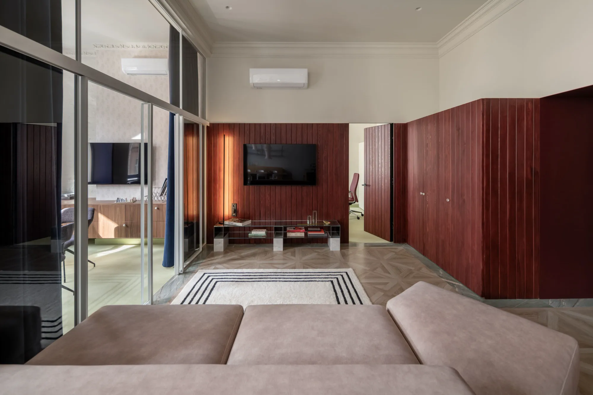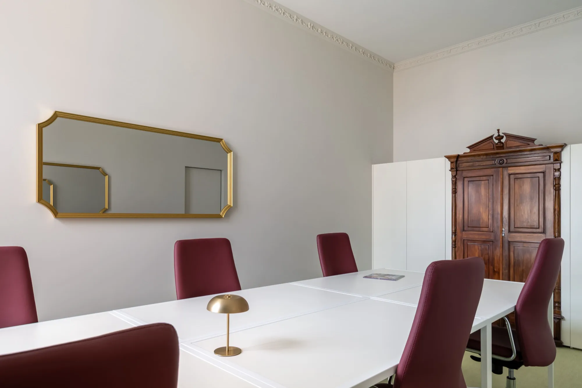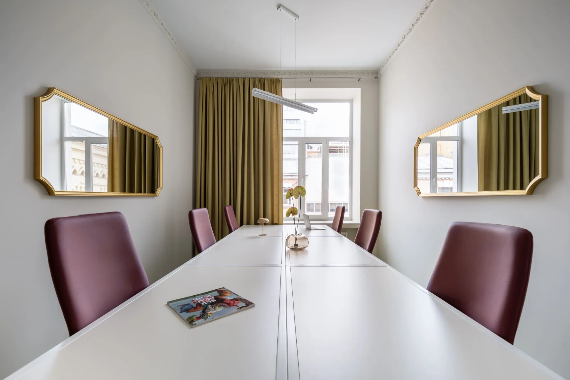 Центральною ідеєю планування стала динамічна відкрита зона біля входу, що сприяє взаємодії співробітників і відвідувачів. Багатофункціональна зона відпочинку інтегрована з кімнатою для переговорів та гостинною їдальнею, де можна проводити зустрічі за легким фуршетом або келихом вина. Переговорна кімната вражає шестикутною формою зі скляними дверима, двошаровими шторами та м'яким ковроліном Forbo, що забезпечує ідеальну акустику. Індивідуально розроблені шпалери фісташкового відтінку з ілюстрацією mythological лева підкреслюють єдину сюжетну лінію простору.