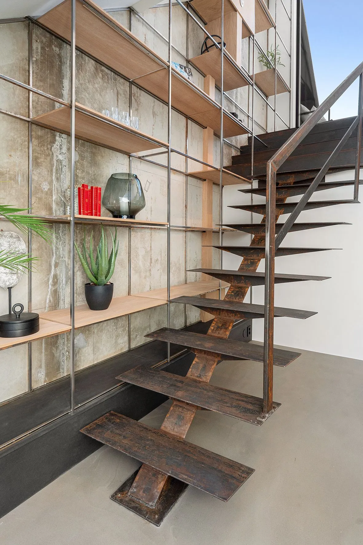 Бетонна стіна та мікроцементна підлога залишені автентичними, підкреслюючи характер будівлі.