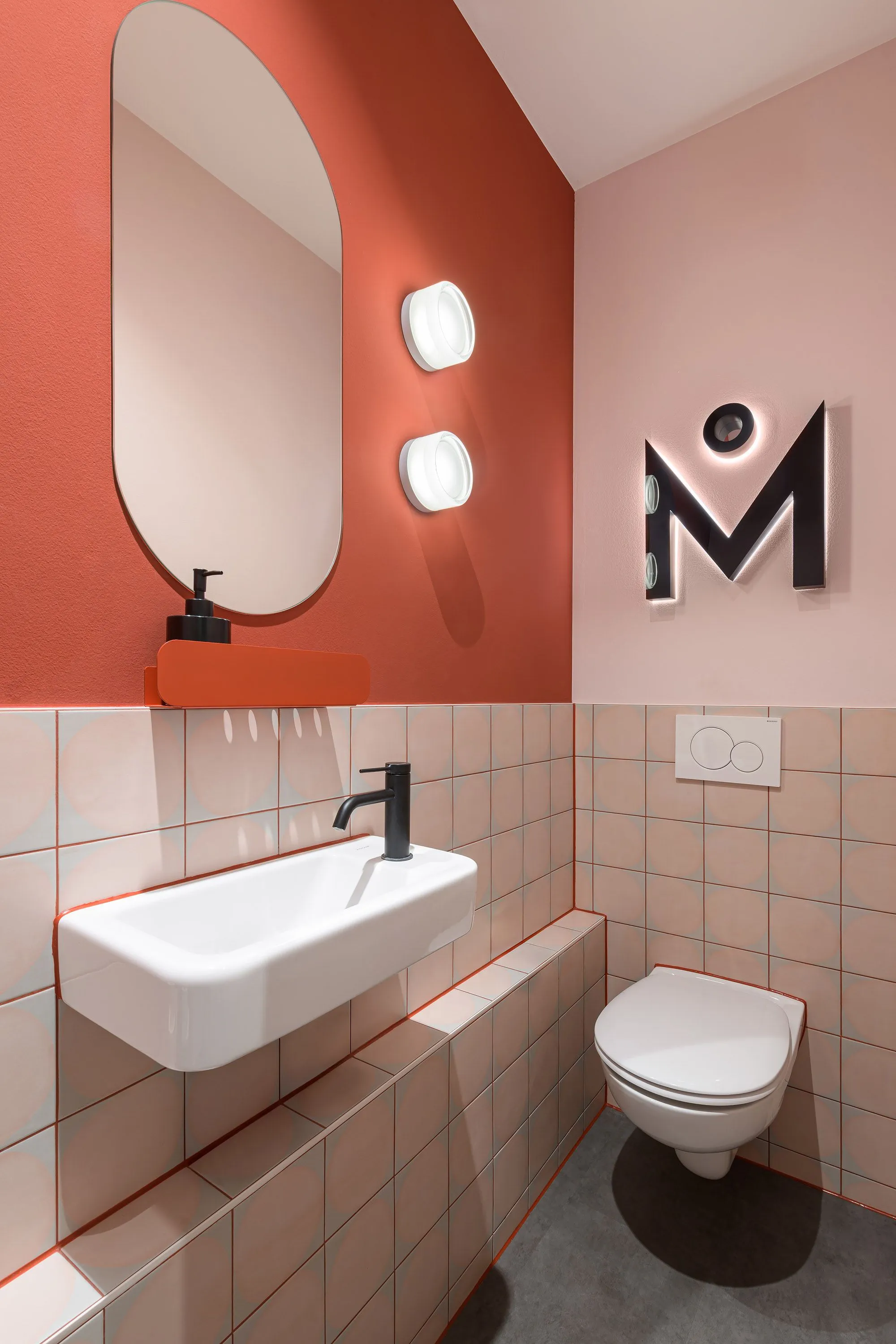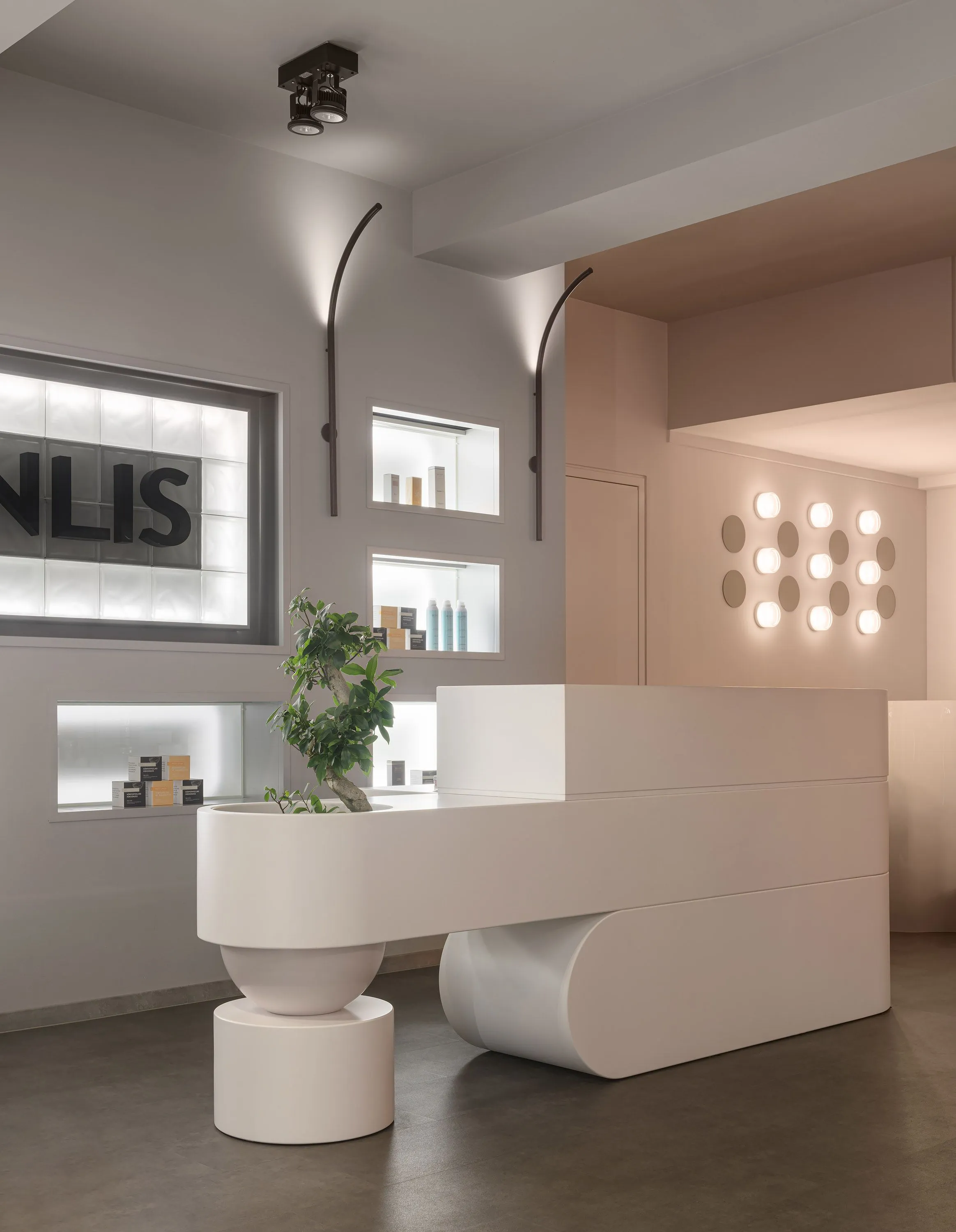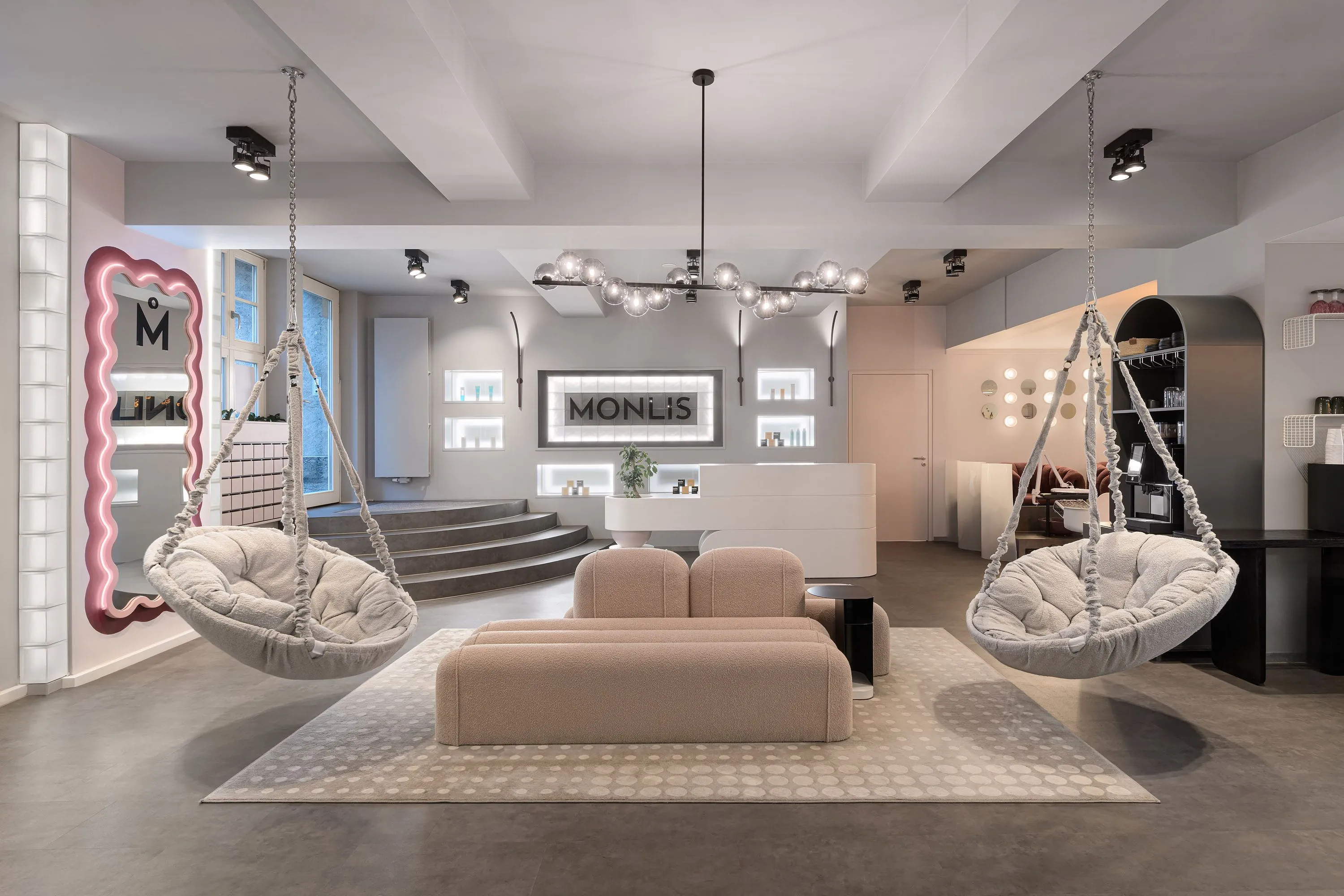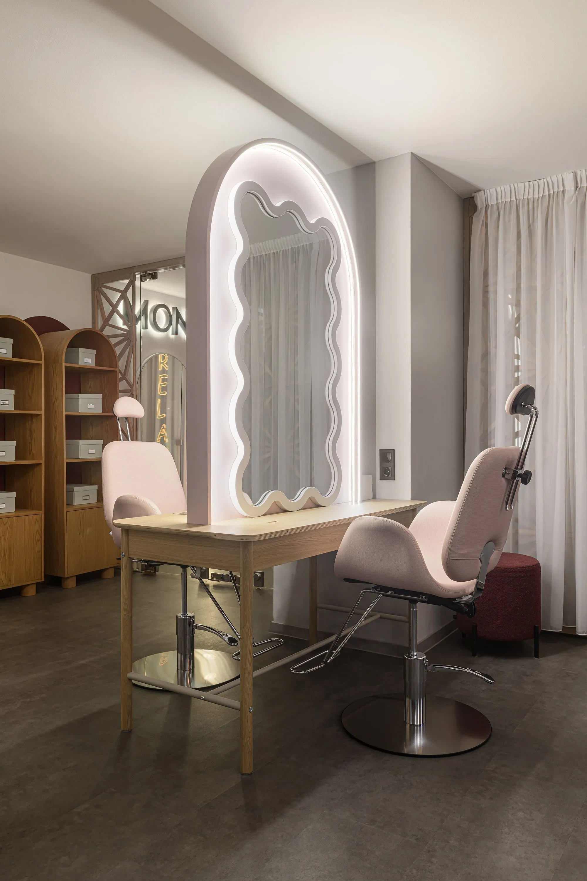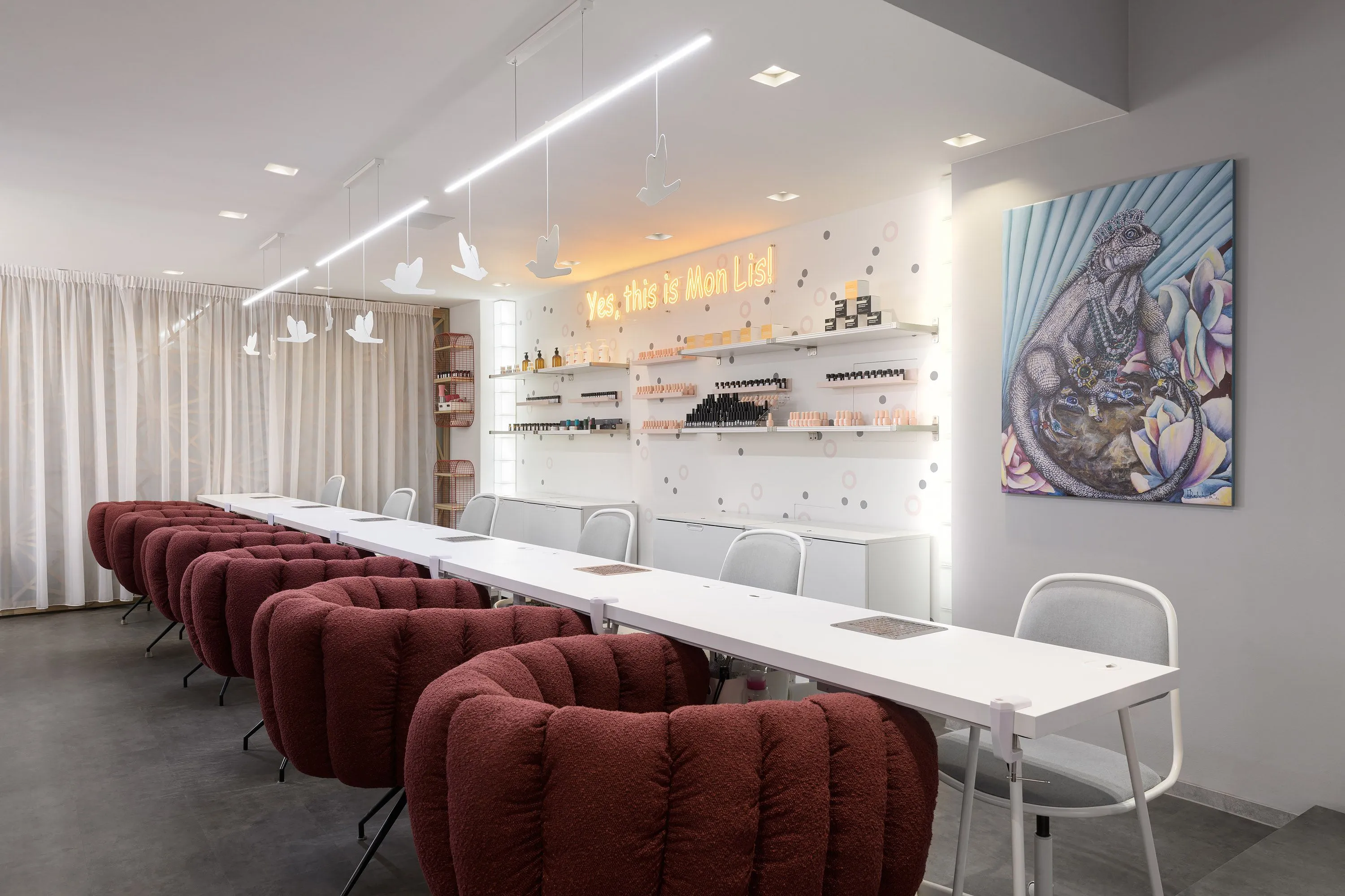 Цей інтер’єр став третьою локацією для мережі nail-studio MONLIS, який ось уже понад 10 років розвивається у сфері nail-естетики. Завданням було — зберегти фірмову палітру (сірий, чорний і рожевий) та водночас надати салону унікального характеру, адже кожен їхній простір має власну кольорову інтонацію. Цього разу додатковим акцентом став глибокий відтінок бордо — насичений, винний, із легким присмаком пристрасті.